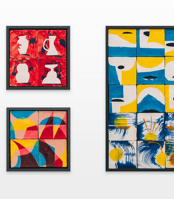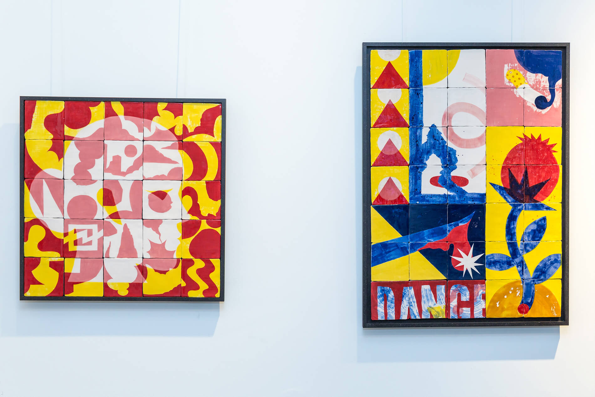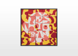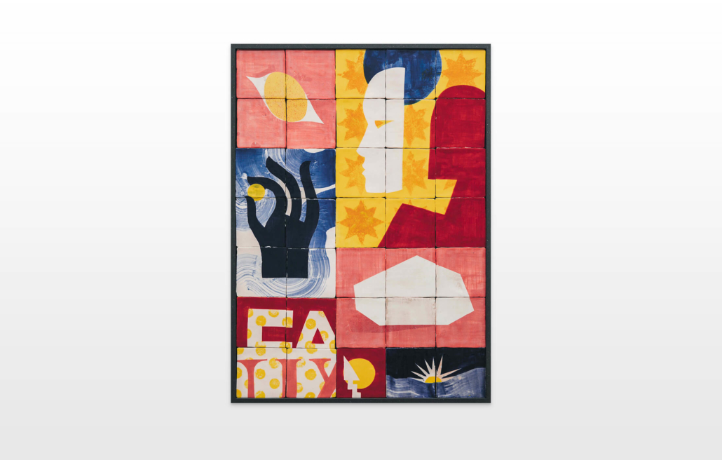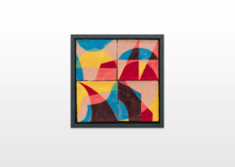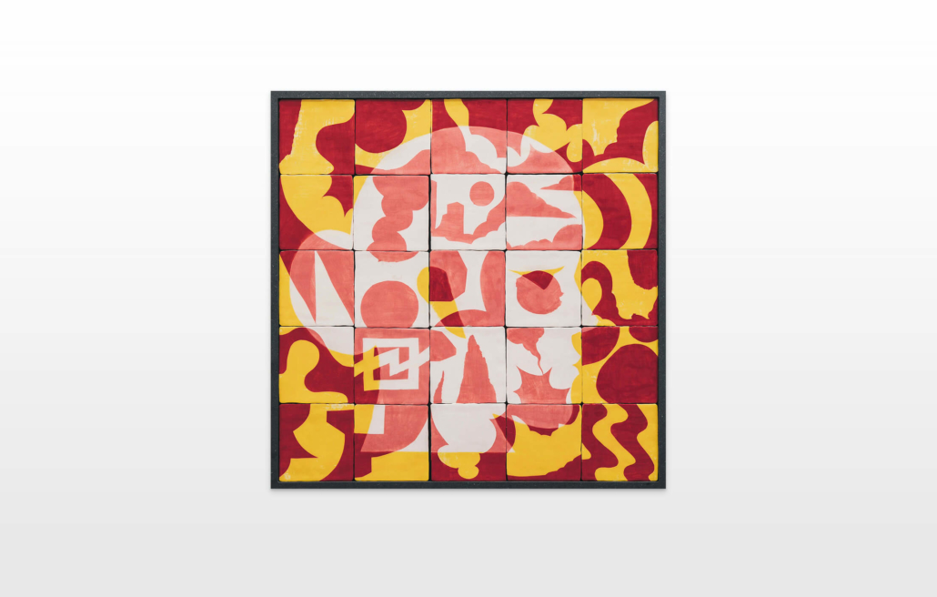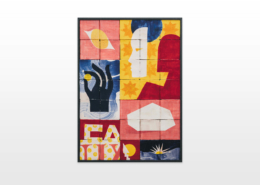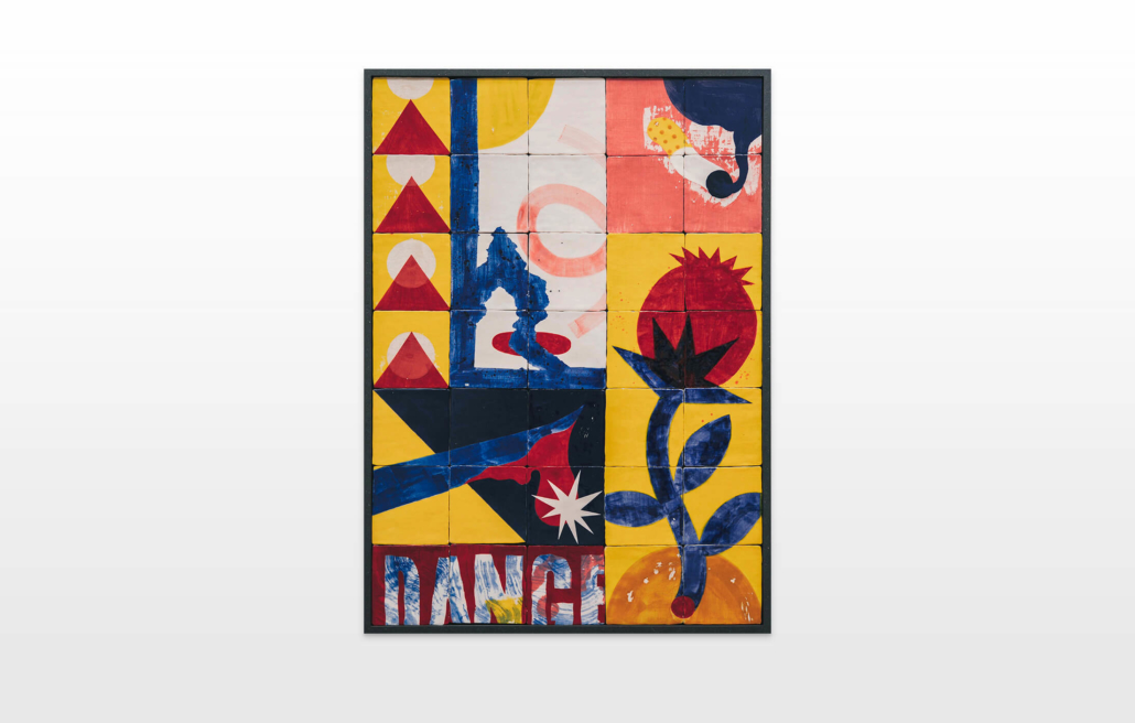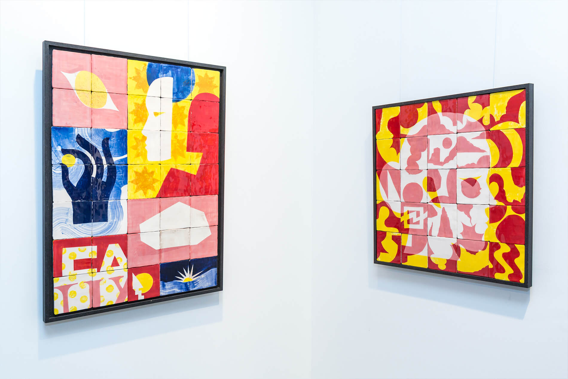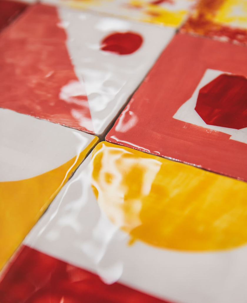 On first sight the tile artworks appear independent in their aesthetics, but looking closer they reveal a certain association to AKACORLEONE’s holistic oeuvre regarding composition, style, visual language and choice of colour. The works in the Faux Pas exhibition are complemented by comics as well as vintage advertising elements and shift from tile to tile between figuration, superposition and abstraction. In contrast to his usual working practice, he consciously chooses a manual, artisanal and somehow intuitive approach.