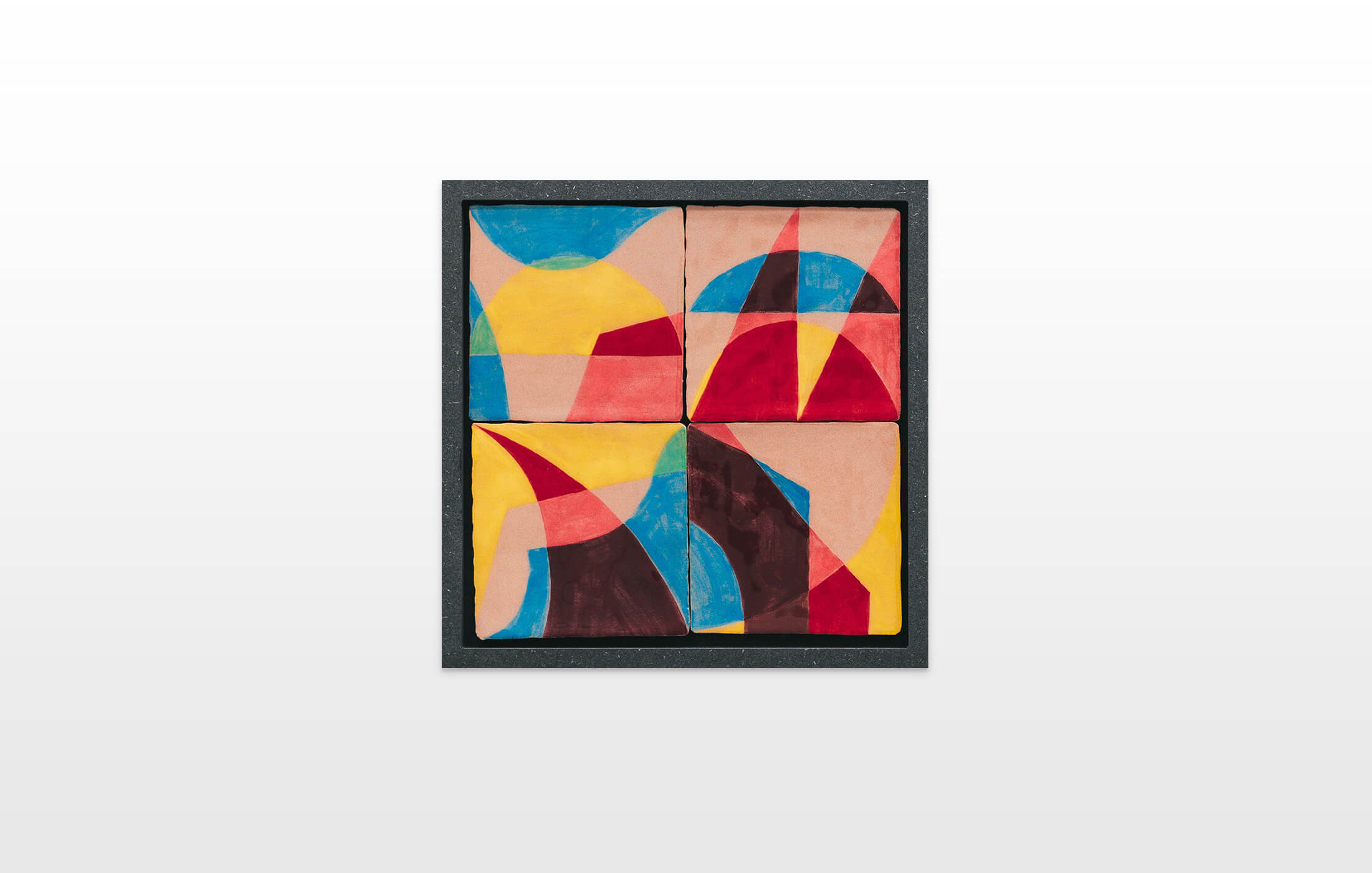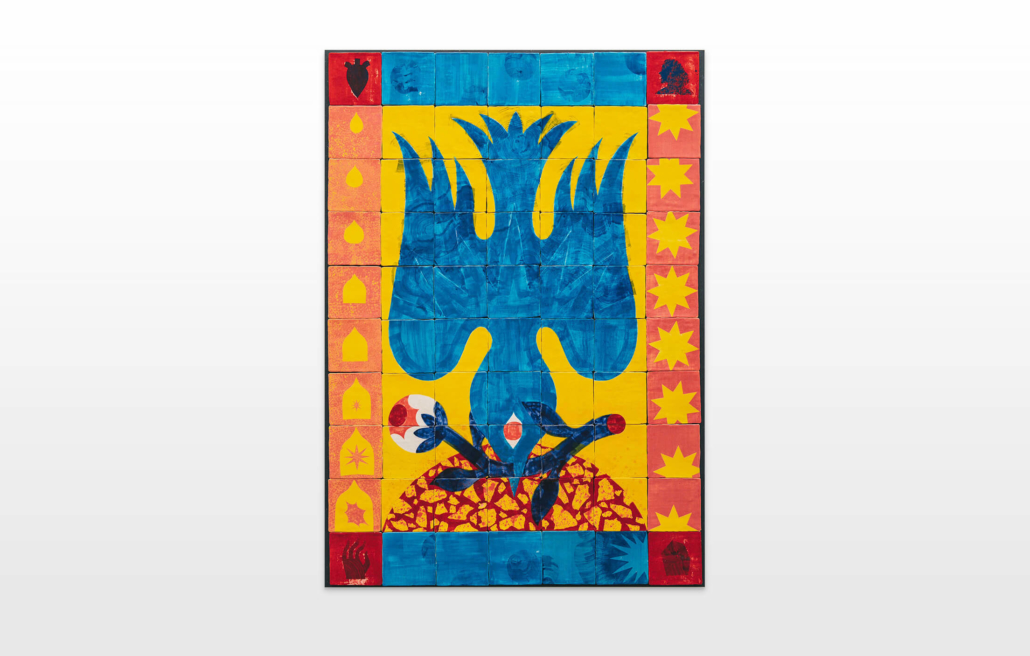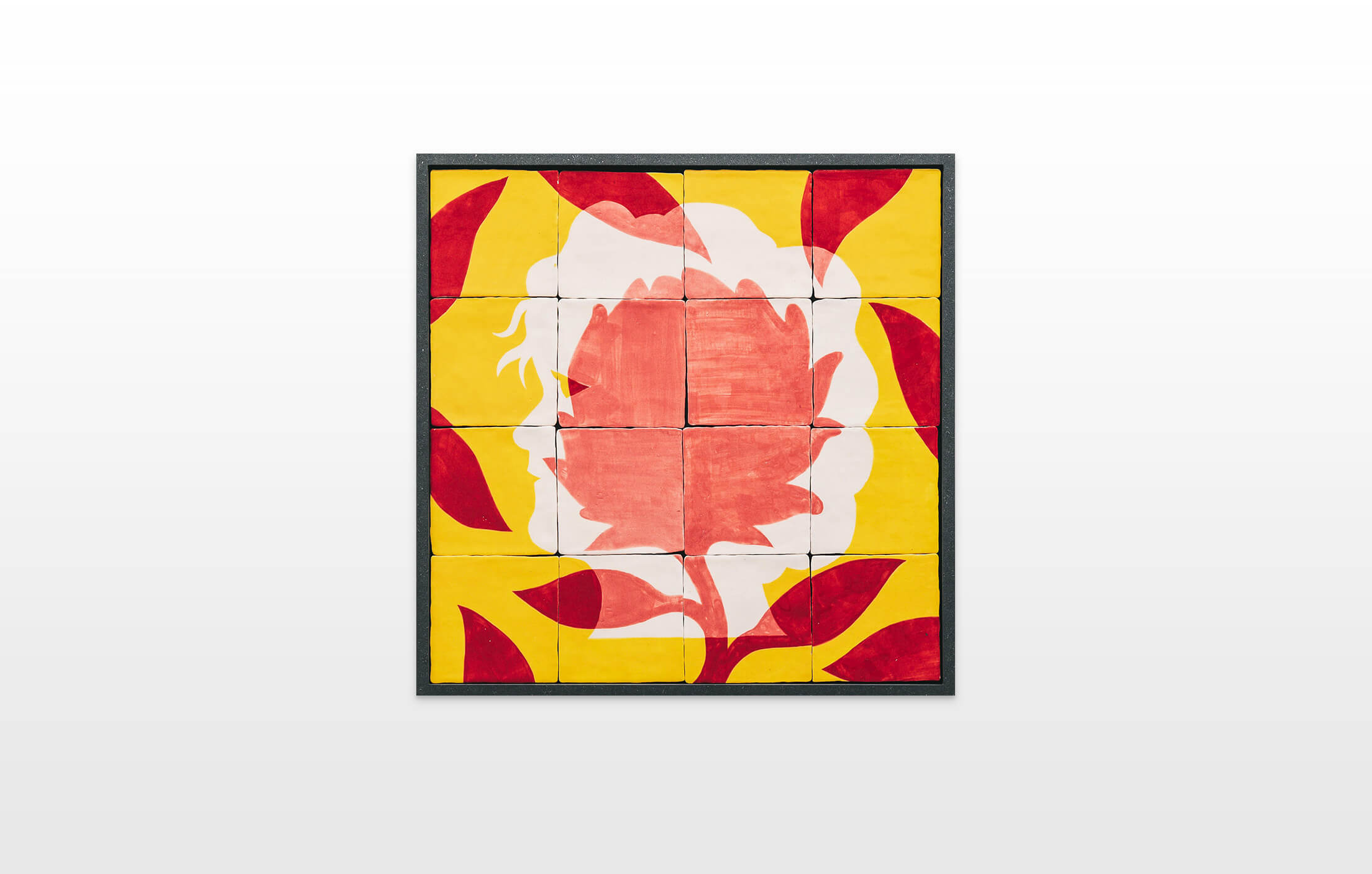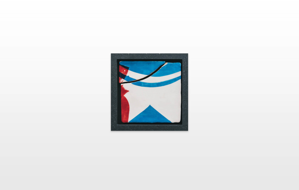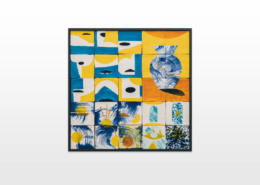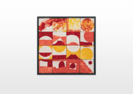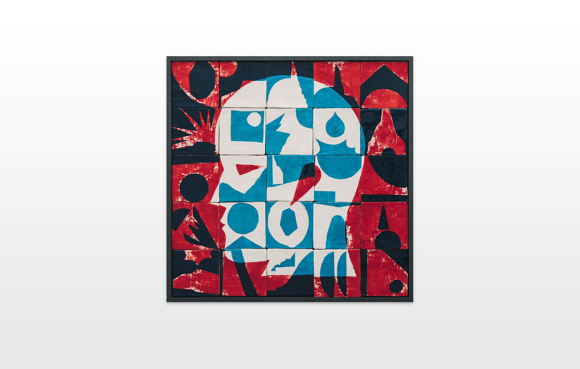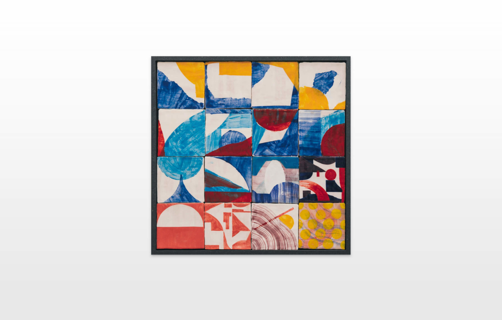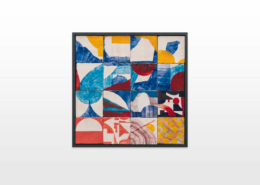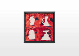 On first sight the tile artworks appear independent in their aesthetics, but looking closer they reveal a certain association to AKACORLEONE’s holistic oeuvre regarding composition, style, visual language and choice of colour. The works in the Faux Pas exhibition are complemented by comics as well as vintage advertising elements and shift from tile to tile between figuration, superposition and abstraction. In contrast to his usual working practice, he consciously chooses a manual, artisanal and somehow intuitive approach.