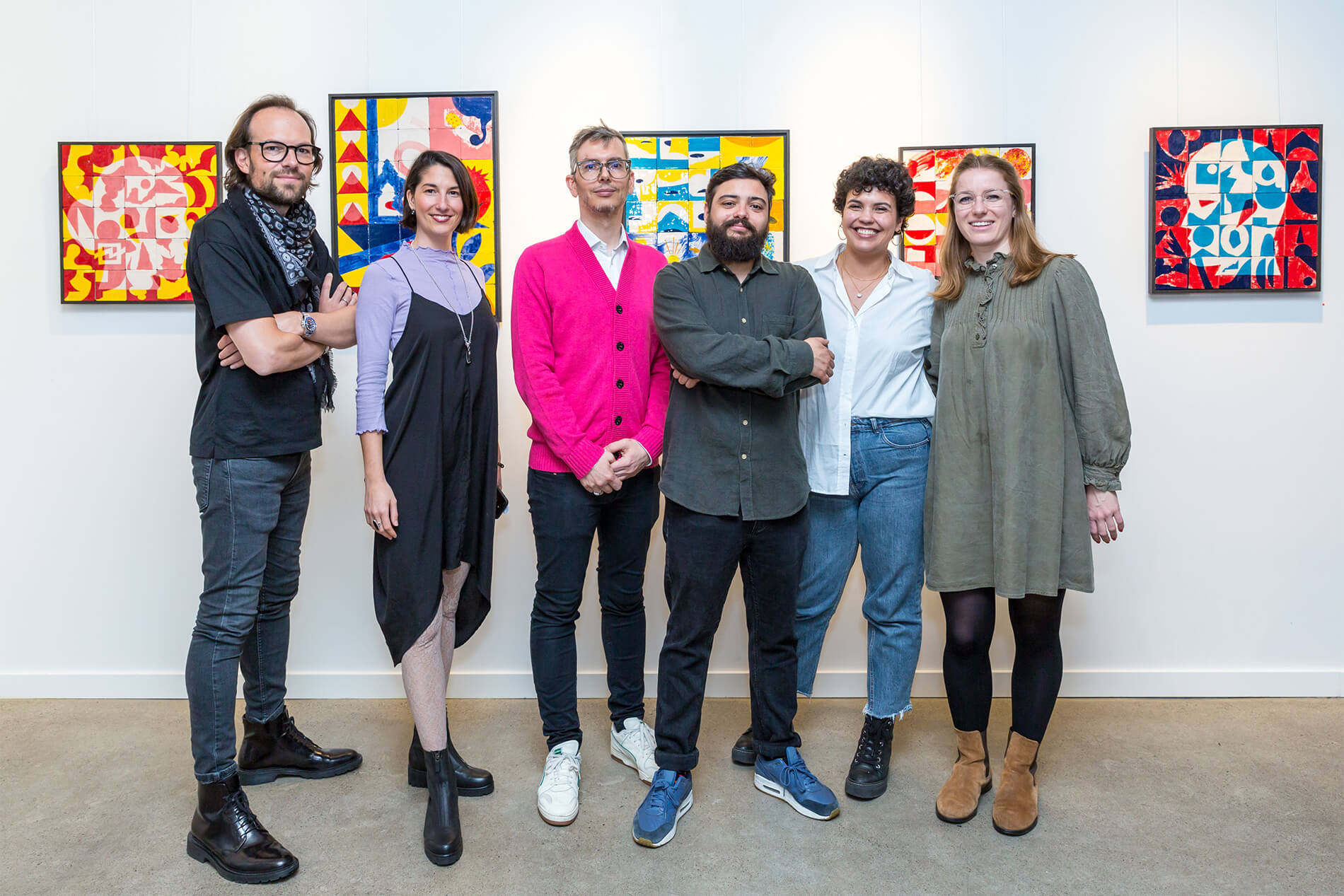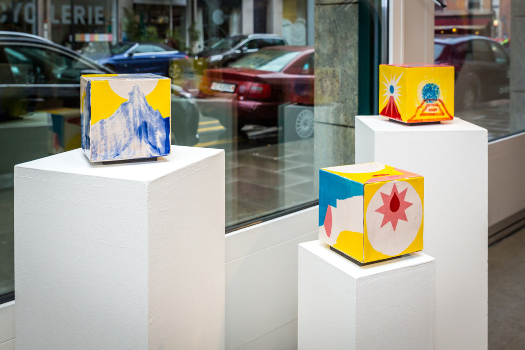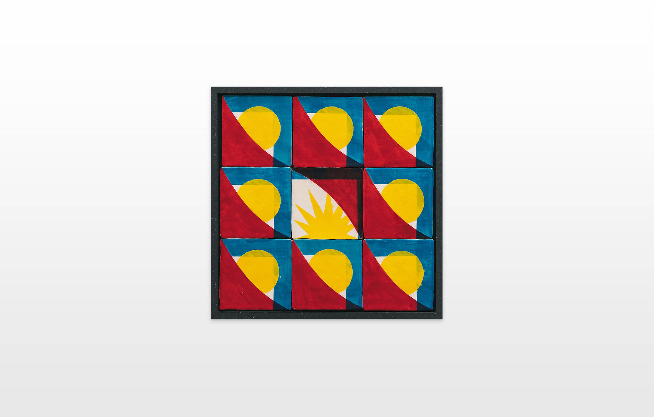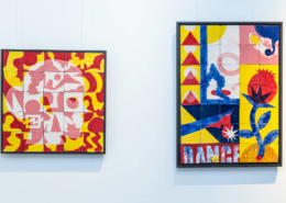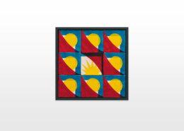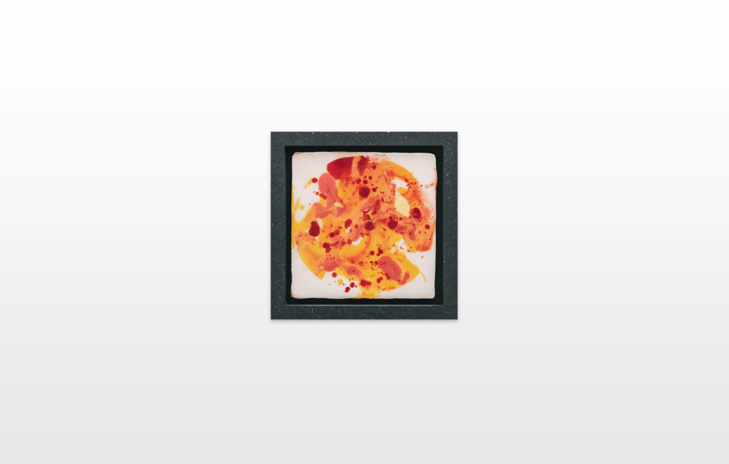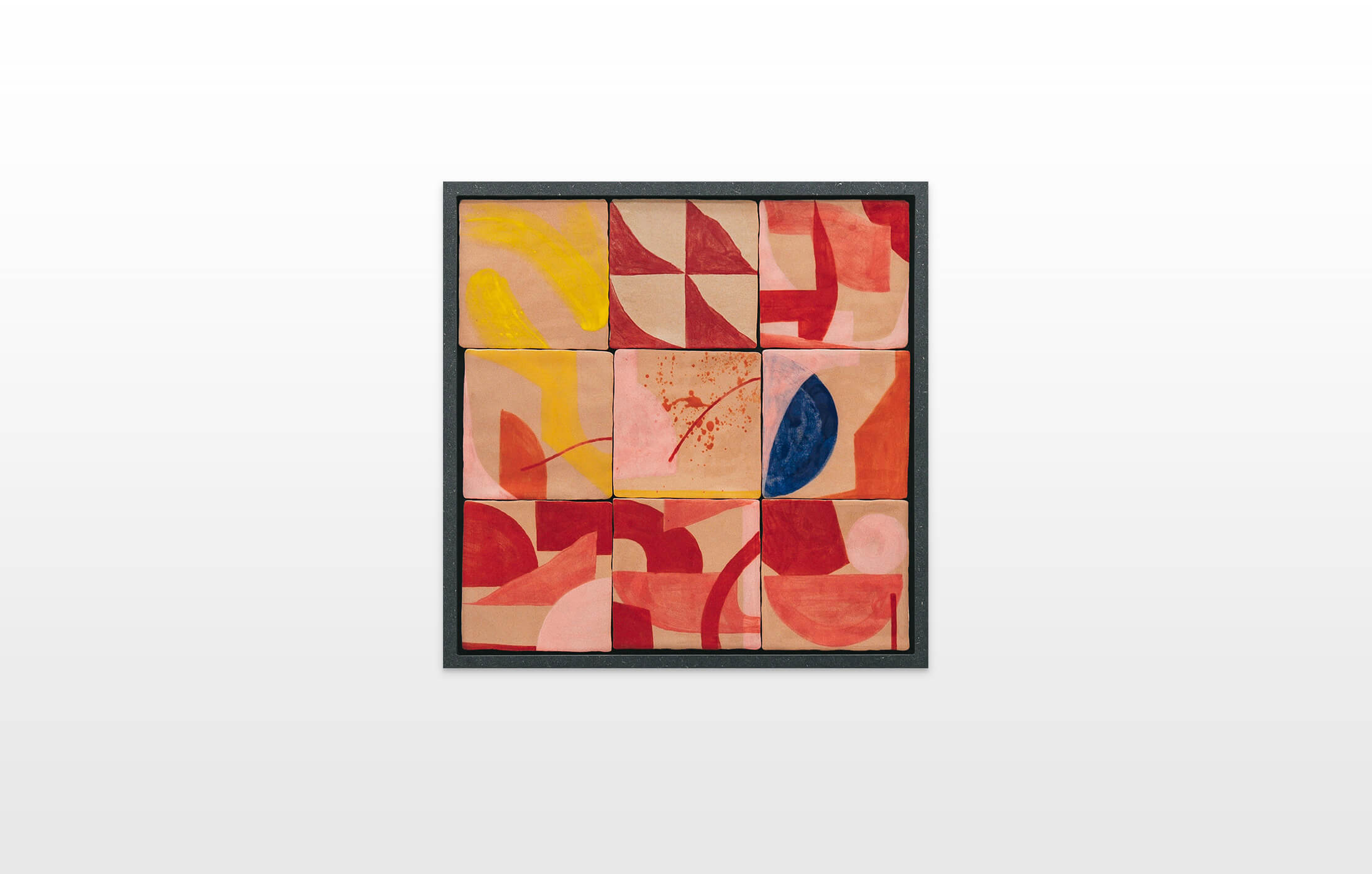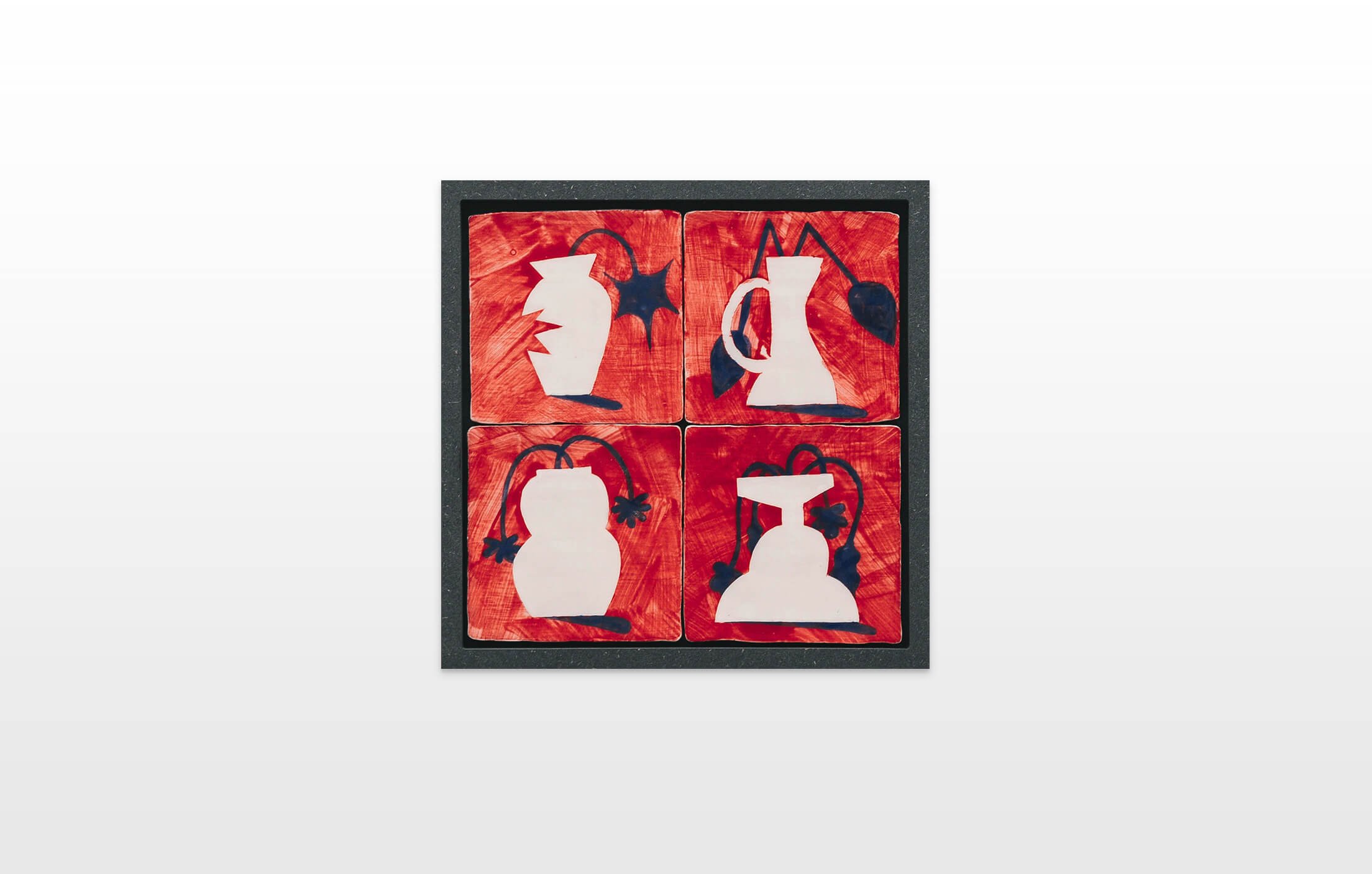 On first sight the tile artworks appear independent in their aesthetics, but looking closer they reveal a certain association to AKACORLEONE’s holistic oeuvre regarding composition, style, visual language and choice of colour. The works in the Faux Pas exhibition are complemented by comics as well as vintage advertising elements and shift from tile to tile between figuration, superposition and abstraction. In contrast to his usual working practice, he consciously chooses a manual, artisanal and somehow intuitive approach.