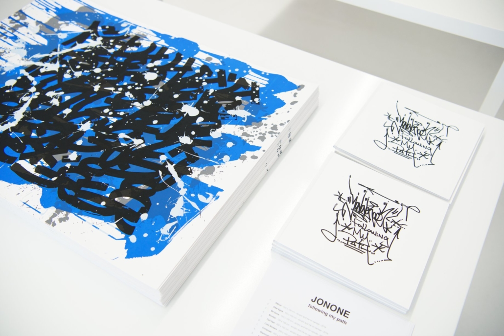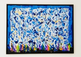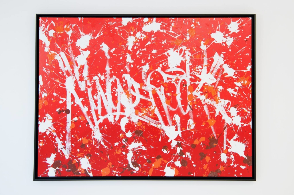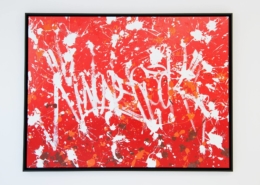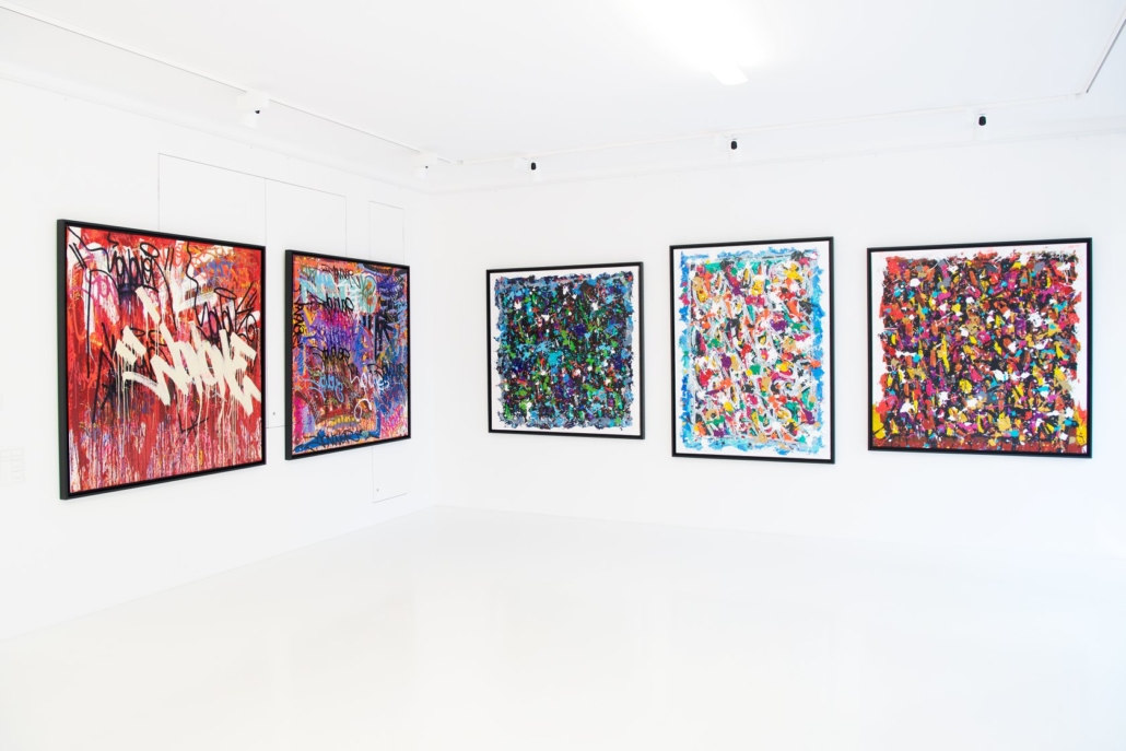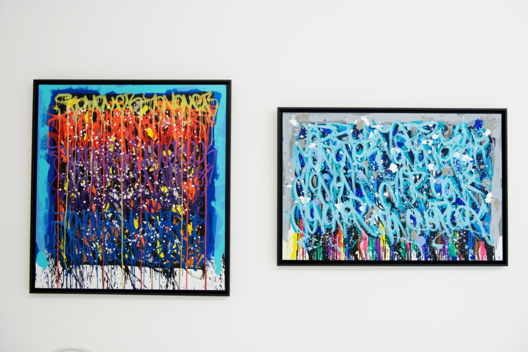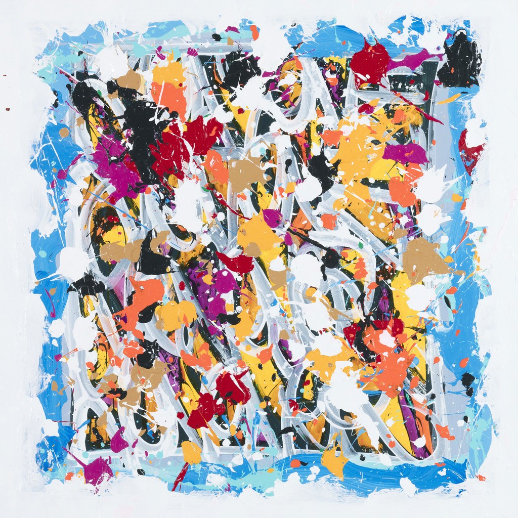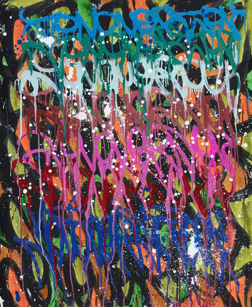 The works presented in the exhibition show the artist’s energetic, cryptic and polychrome canvases. Multiple layers and thick brushstrokes adorn his large-sized and explosive paintings. Profoundly rooted in the graffiti scene of the 1980ies he made excellent use of his obsession with tagging. What might appear as abstract lines, cryptic shapes or intentional drips of paint to the viewer, actually represent his own tag ‚JONONE‘, sometimes also in variations as ‚JONONE ROCK‘. At a closer look, letters and even his tag are recognizable. The regularity of repeating his tag over and over again, is not monotonous, in contrary, it is divers, complex and rich. Eventually the writing develops into an abstract pattern within the beauty of infinity.