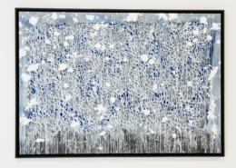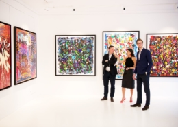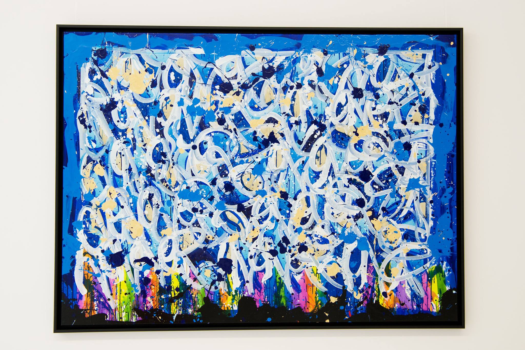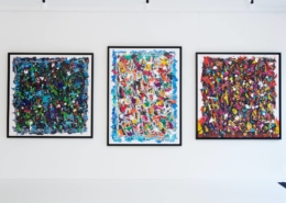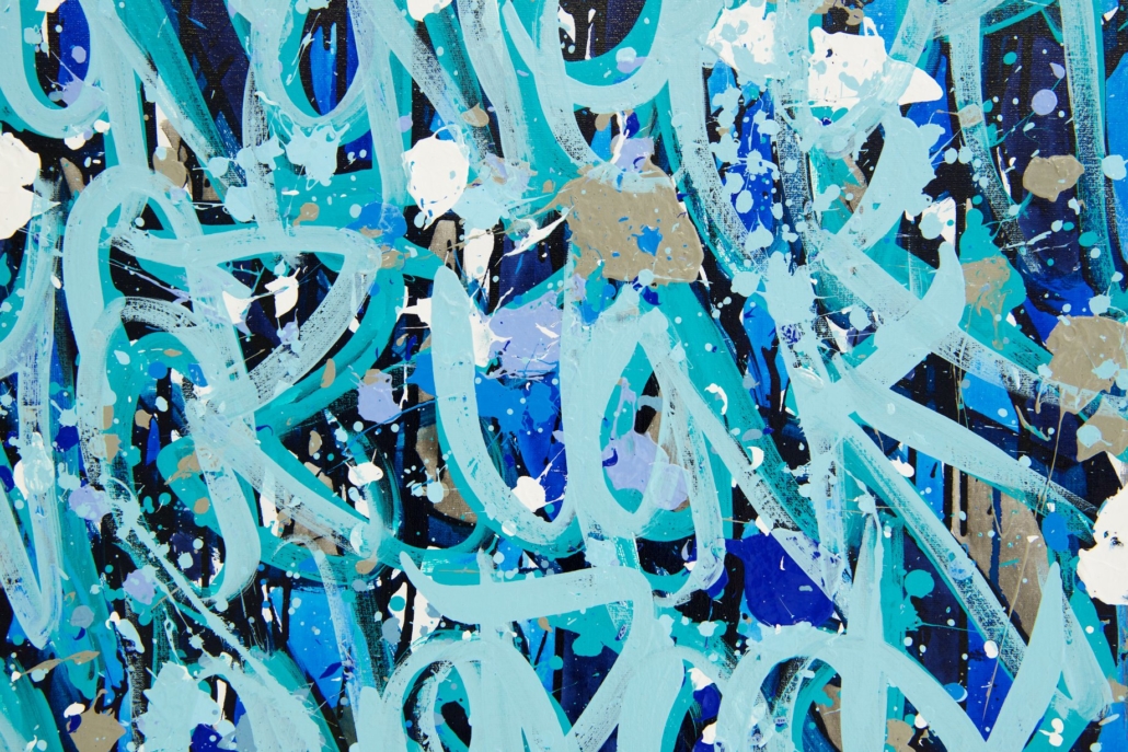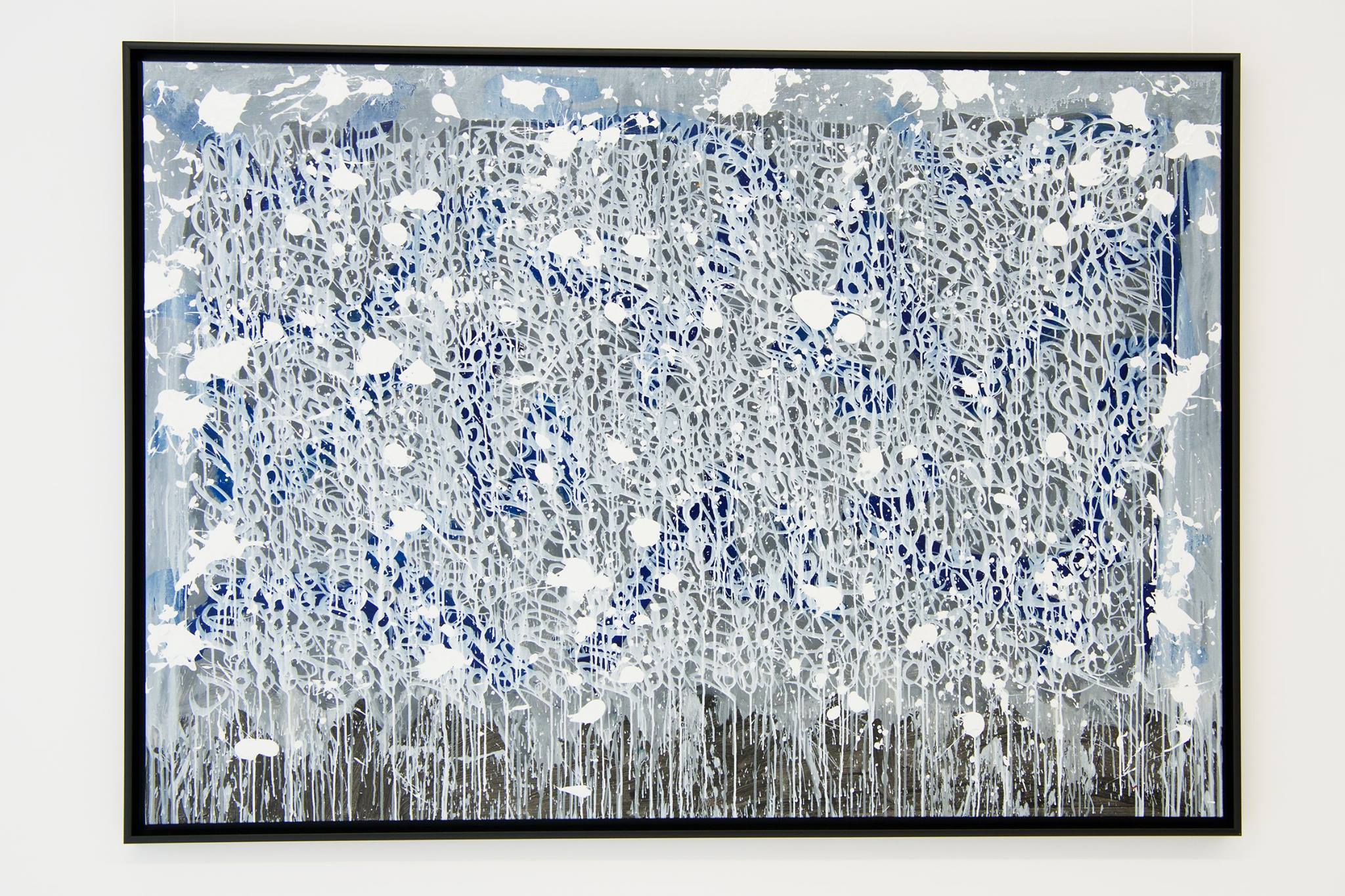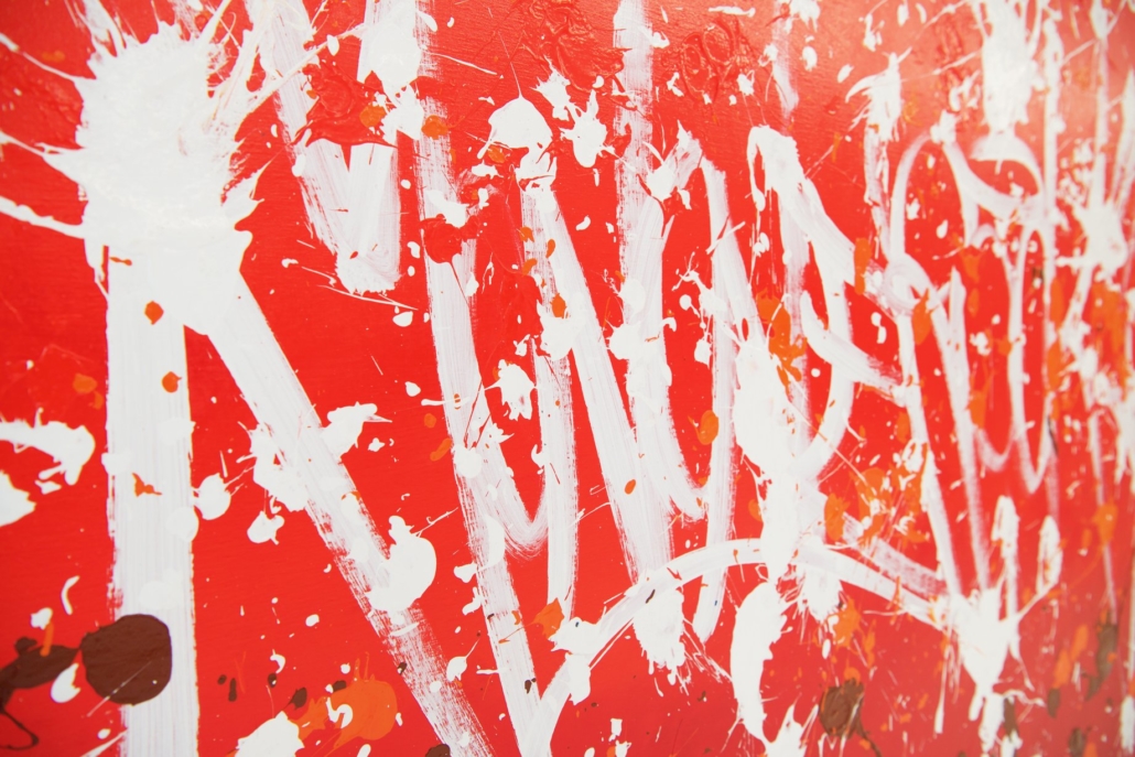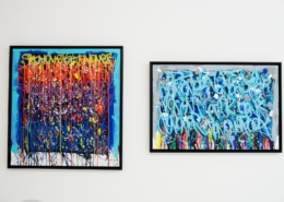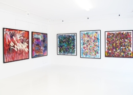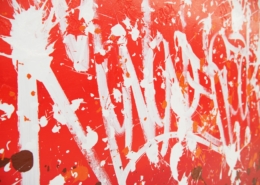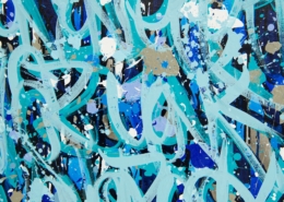 The works presented in the exhibition show the artist’s energetic, cryptic and polychrome canvases. Multiple layers and thick brushstrokes adorn his large-sized and explosive paintings. Profoundly rooted in the graffiti scene of the 1980ies he made excellent use of his obsession with tagging. What might appear as abstract lines, cryptic shapes or intentional drips of paint to the viewer, actually represent his own tag ‚JONONE‘, sometimes also in variations as ‚JONONE ROCK‘. At a closer look, letters and even his tag are recognizable. The regularity of repeating his tag over and over again, is not monotonous, in contrary, it is divers, complex and rich. Eventually the writing develops into an abstract pattern within the beauty of infinity.