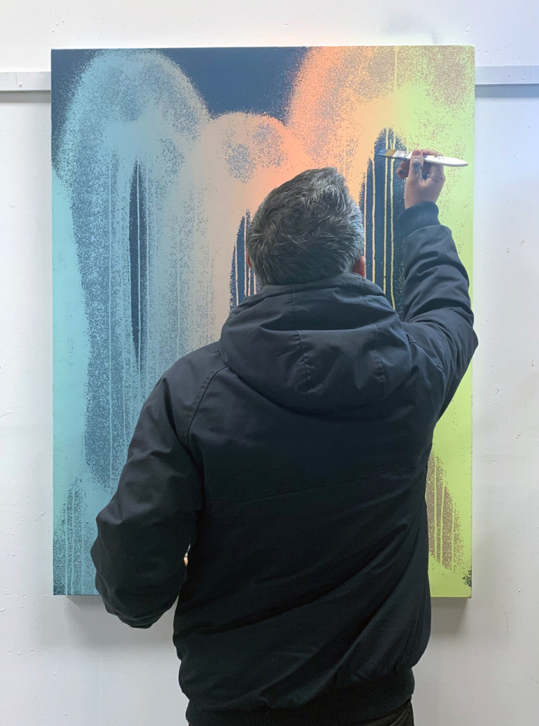This series encloses the artist’s fascination with raw gestural and repetitive writing while capturing a melody of vibrant colors. Franck ‚Zest‘ Noto has developed a language of expression that unites the ritualistic repetition of a calligraphic art form with timeless abstraction that affects the audience’s perception.