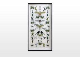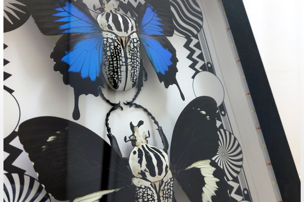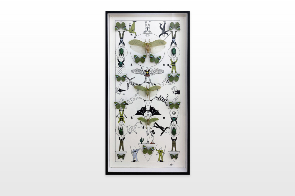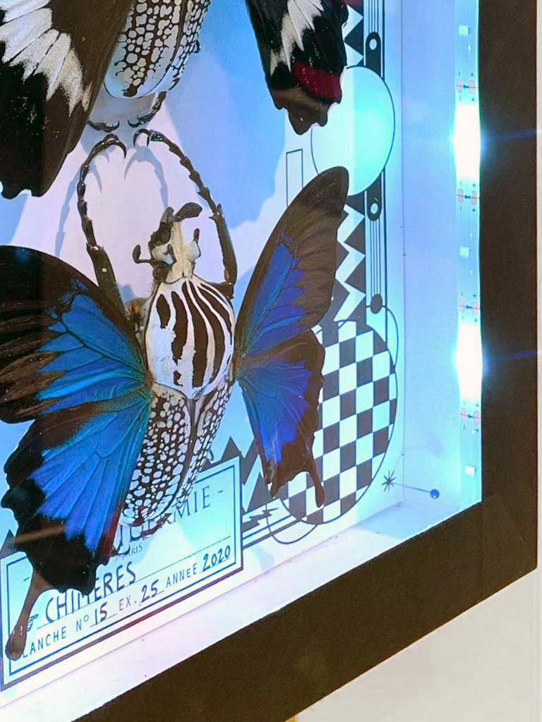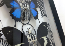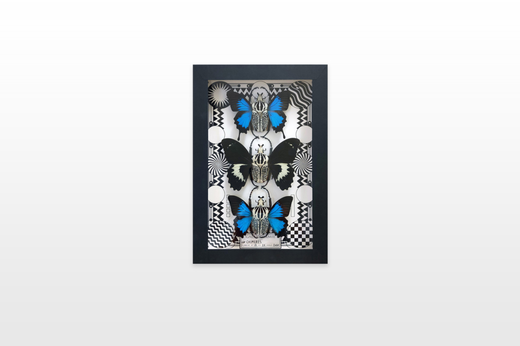 The series features a multifaceted exploration of different contents but also techniques. By associating insects with pop culture artefacts, Parisian artist Benjamin Pietri dusts off the world of entomology by creating contemporary cabinets of curiosities. Honet’s work adorns the contours, the backdrop of this universe of augmented taxidermy. The two boxes seem to come straight out of the drawers of a natural history museum: entomological pieces (associated by analogy of shapes or colors) are pinned to the background and seem to be in tune in a Space Baroque and colorful opera. A very rich and unique artistic repertory is brought along by Honet. The black and white backgrounds are enriched with esoteric symbols as well as entomological plates of a new kind. They serve as decorum in the midst of which exotic butterflies and Egyptian scarabs delicately land. There are so many different references that adorn his and Petri’s boxes of a strange and tangy universe, out of time, with no real border between the organic and the synthetic, between what frightens us and what reassures us.