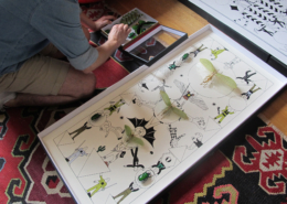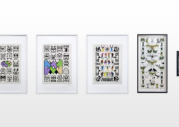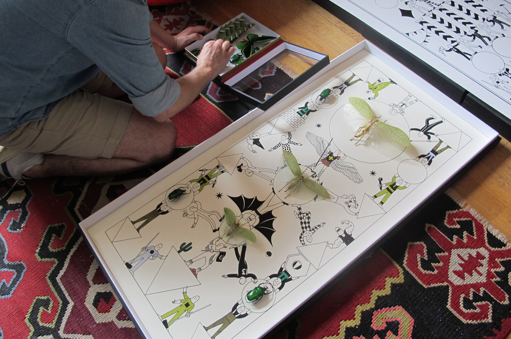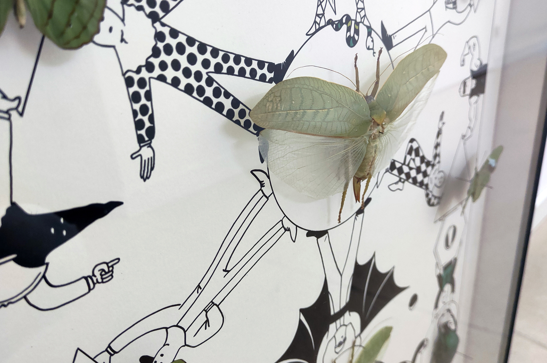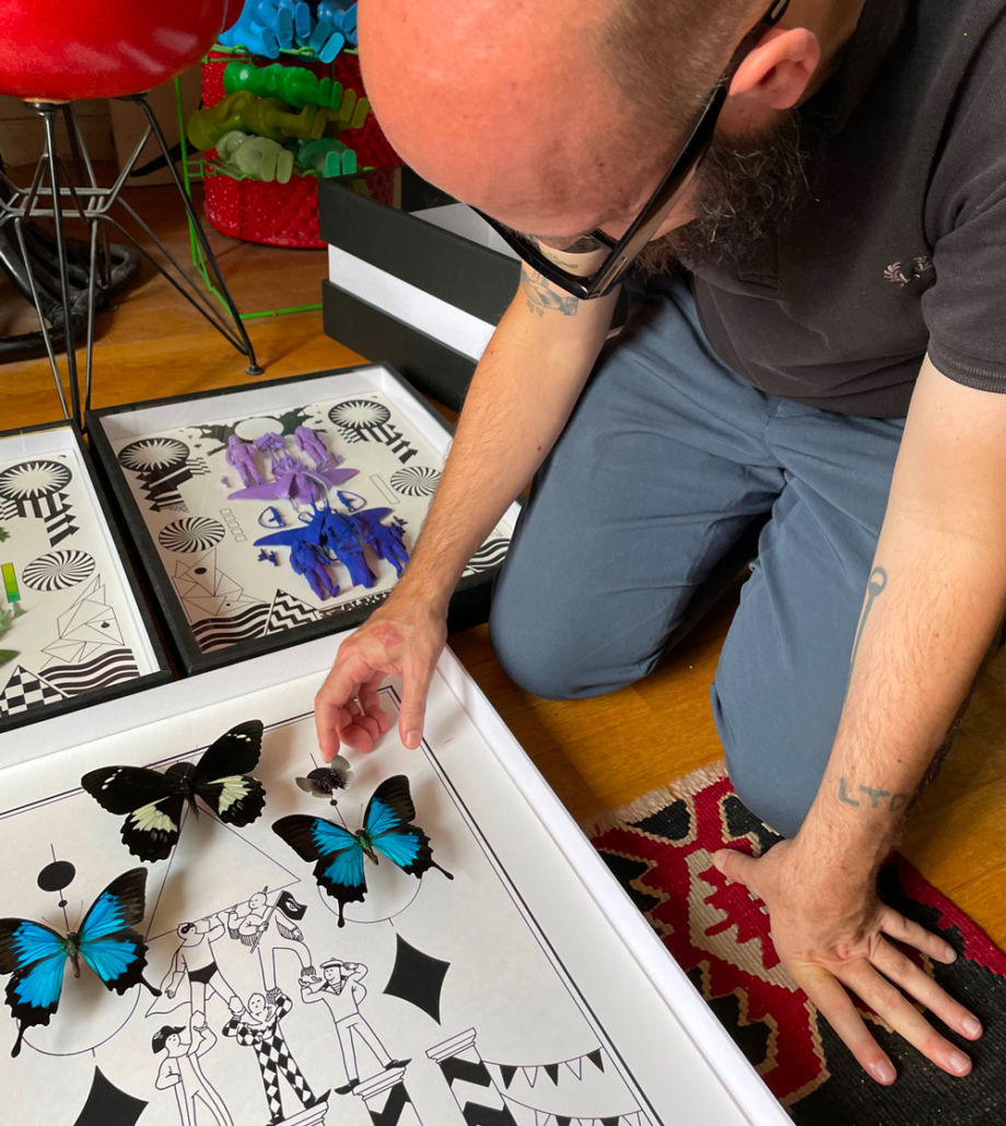 The series features a multifaceted exploration of different contents but also techniques. By associating insects with pop culture artefacts, Parisian artist Benjamin Pietri dusts off the world of entomology by creating contemporary cabinets of curiosities. Honet’s work adorns the contours, the backdrop of this universe of augmented taxidermy. The two boxes seem to come straight out of the drawers of a natural history museum: entomological pieces (associated by analogy of shapes or colors) are pinned to the background and seem to be in tune in a Space Baroque and colorful opera. A very rich and unique artistic repertory is brought along by Honet. The black and white backgrounds are enriched with esoteric symbols as well as entomological plates of a new kind. They serve as decorum in the midst of which exotic butterflies and Egyptian scarabs delicately land. There are so many different references that adorn his and Petri’s boxes of a strange and tangy universe, out of time, with no real border between the organic and the synthetic, between what frightens us and what reassures us.