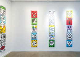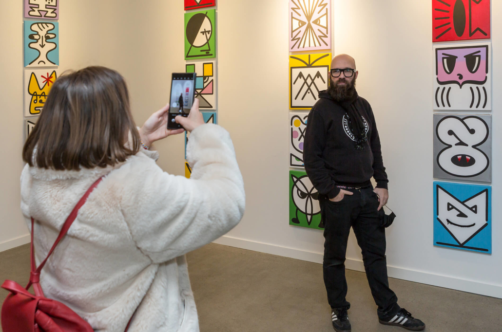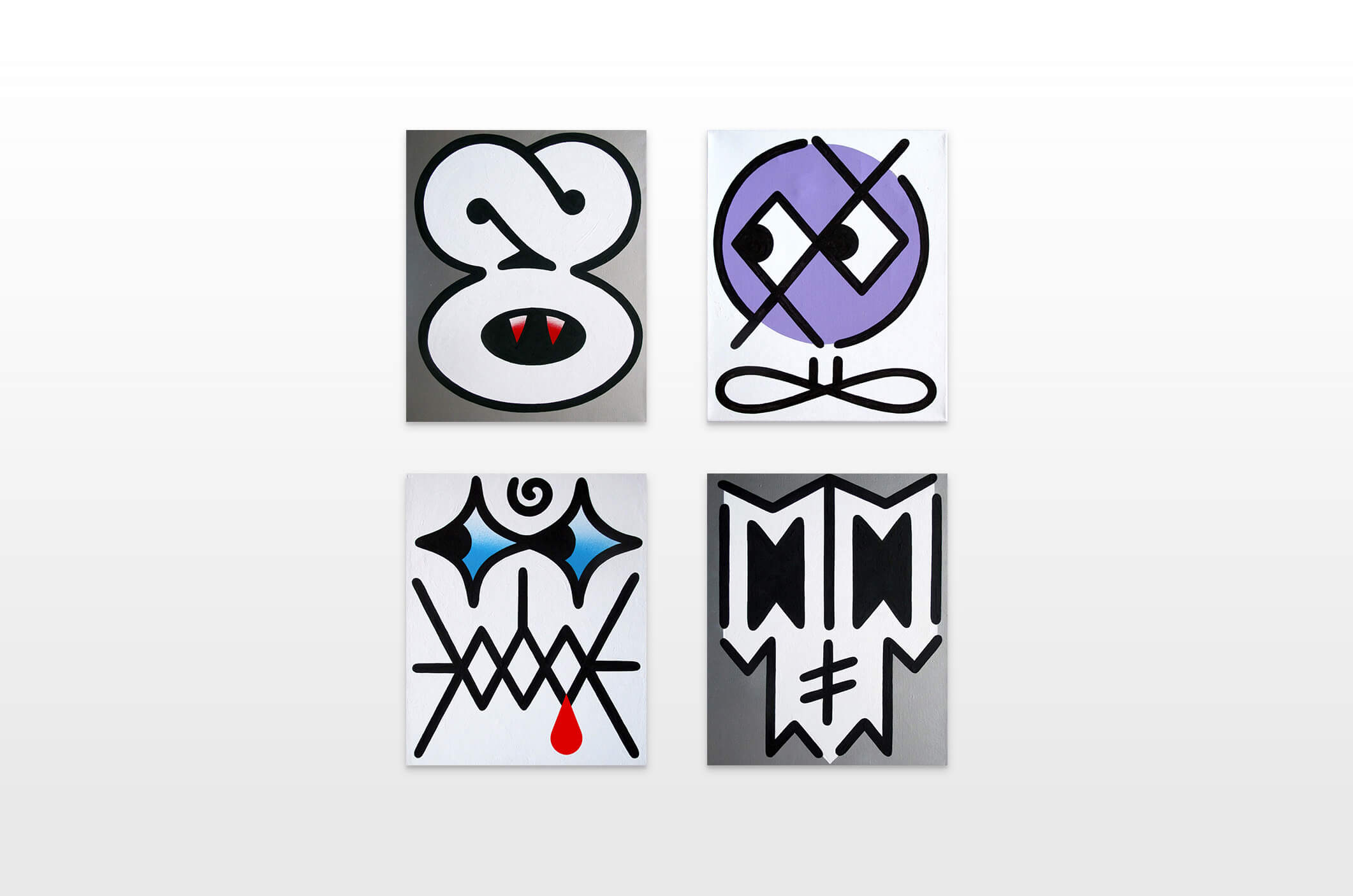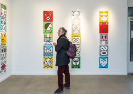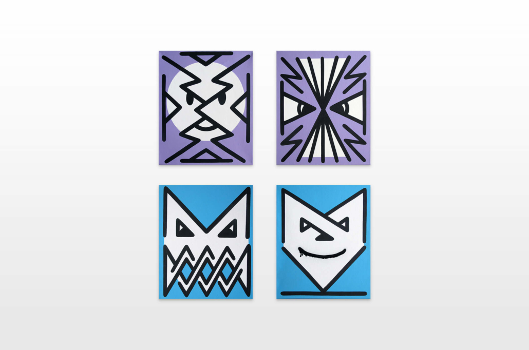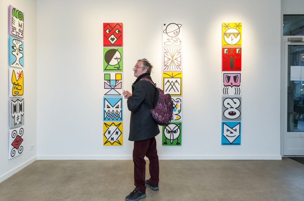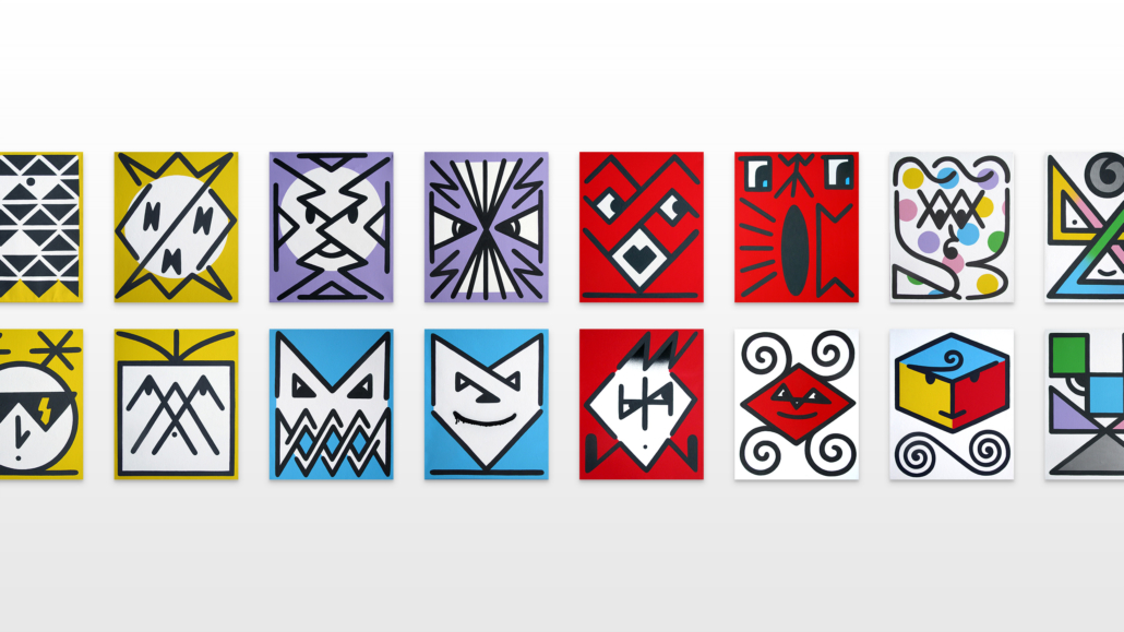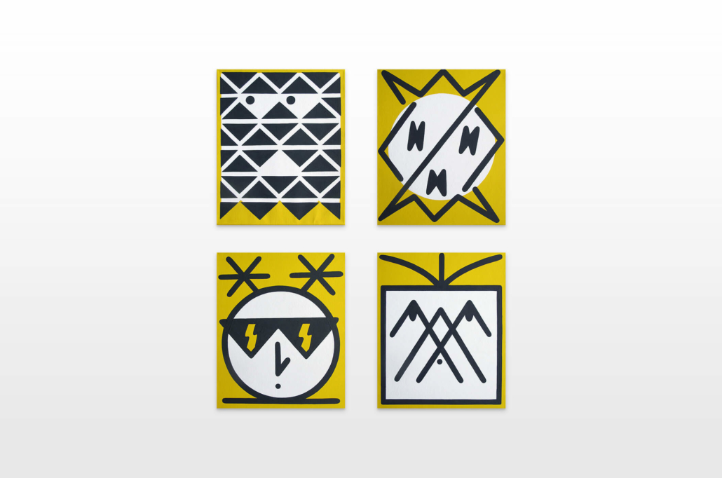 Honet’s exhibition revolves around Emojis in his words: „Gmojis (Graffiti-Emojis)“, symbols that are primary written using keyboard characters. As graffiti artist and illustrator he adds a personal twist onto them using antique or modern letters from different alphabets, in addition to punctuation, numerical, esoteric and popular symbols, as well as graffiti elements. He reinterprets the principal of anonymity and aliases of the graffiti culture, which means hiding the true identity behind a pseudonym, logo, style or aesthetic, but also the fact to be physically hidden from authorities when applying graffiti, by spraying at night or with face masks.