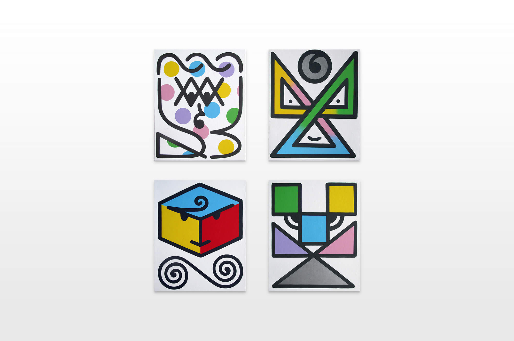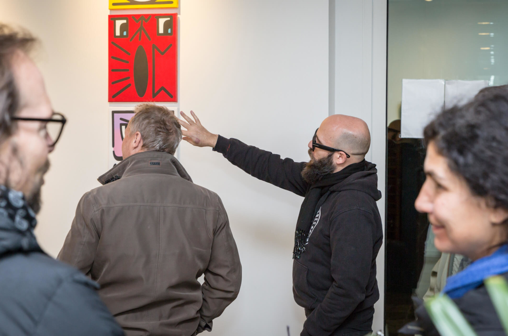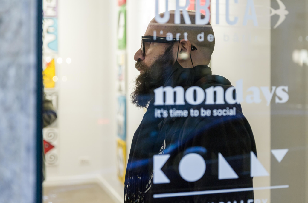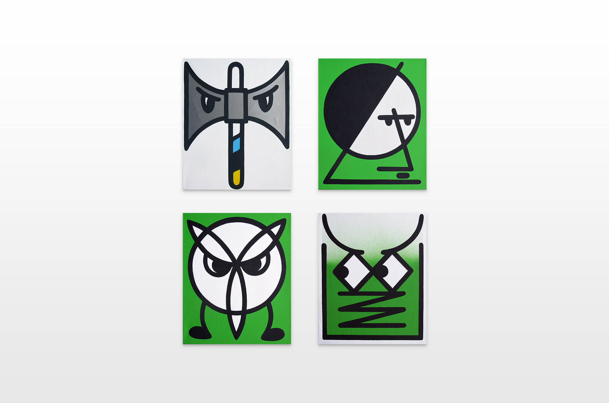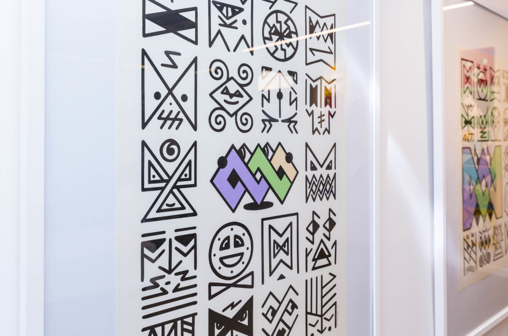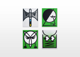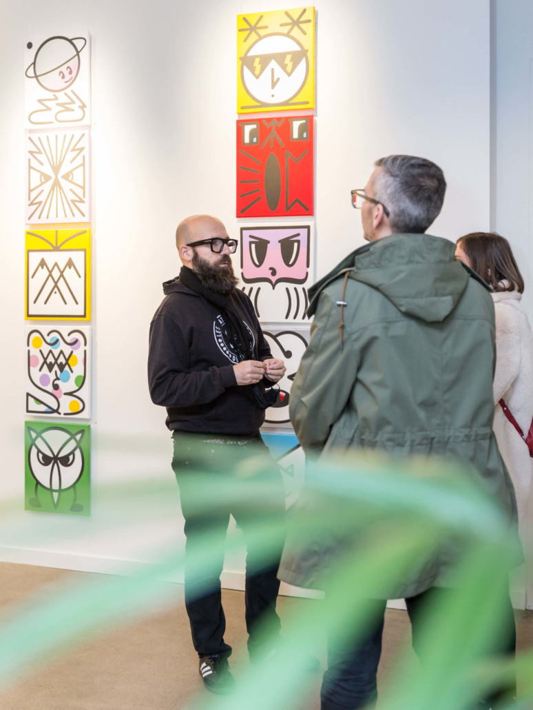 Honet’s exhibition revolves around Emojis in his words: „Gmojis (Graffiti-Emojis)“, symbols that are primary written using keyboard characters. As graffiti artist and illustrator he adds a personal twist onto them using antique or modern letters from different alphabets, in addition to punctuation, numerical, esoteric and popular symbols, as well as graffiti elements. He reinterprets the principal of anonymity and aliases of the graffiti culture, which means hiding the true identity behind a pseudonym, logo, style or aesthetic, but also the fact to be physically hidden from authorities when applying graffiti, by spraying at night or with face masks.