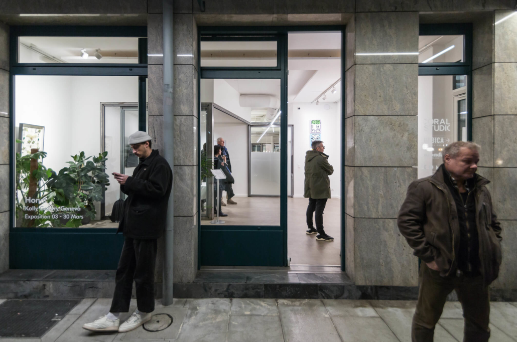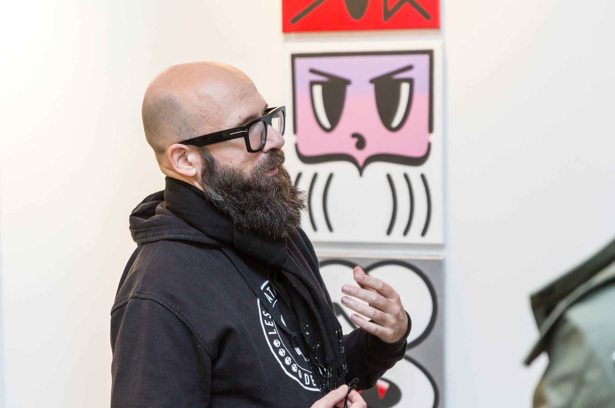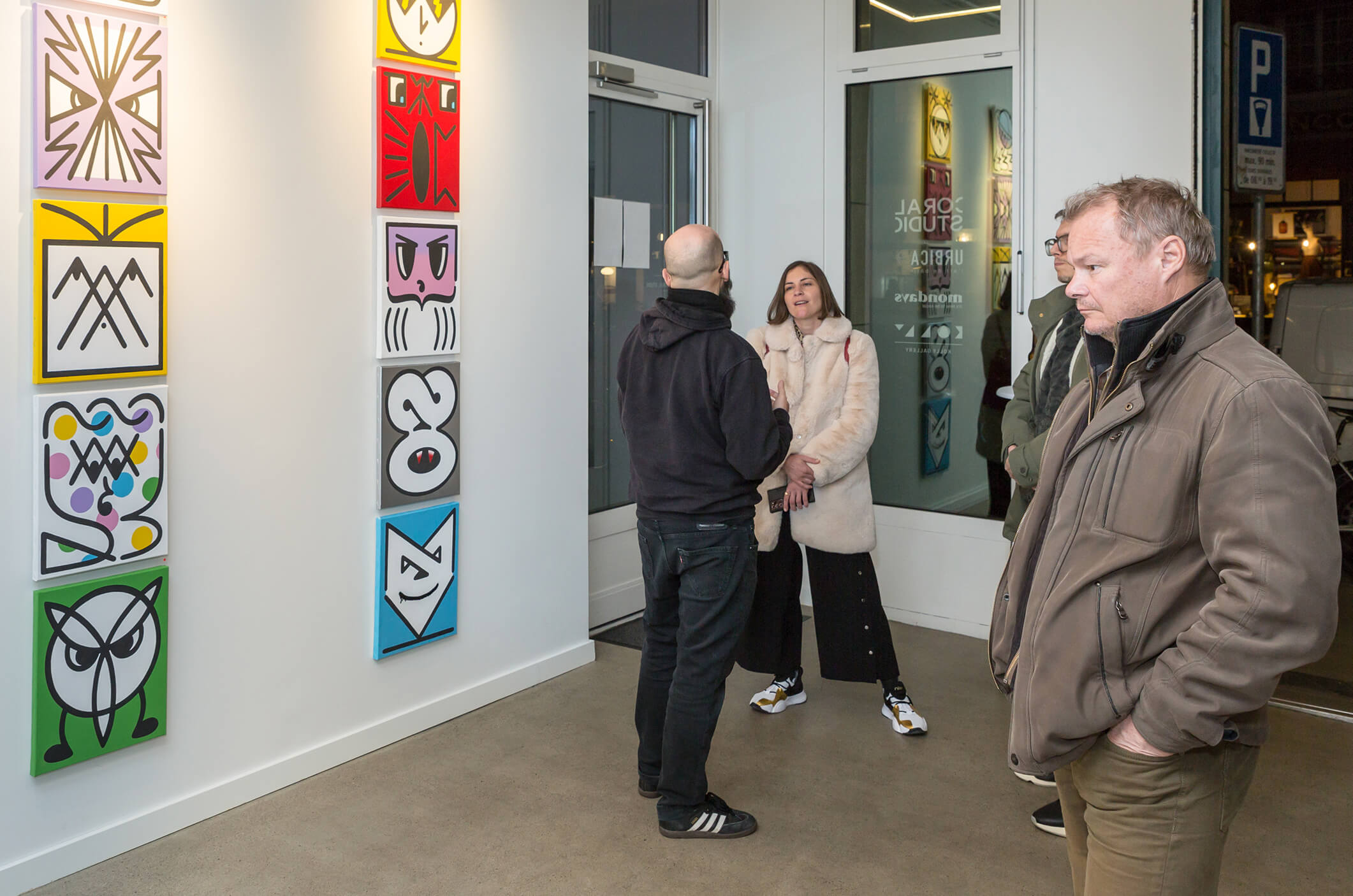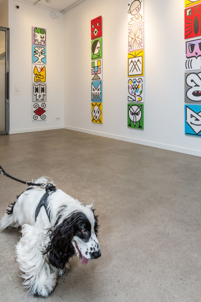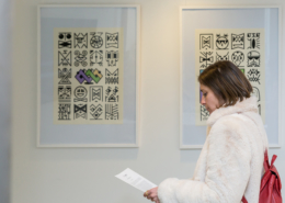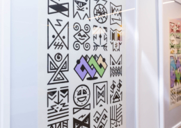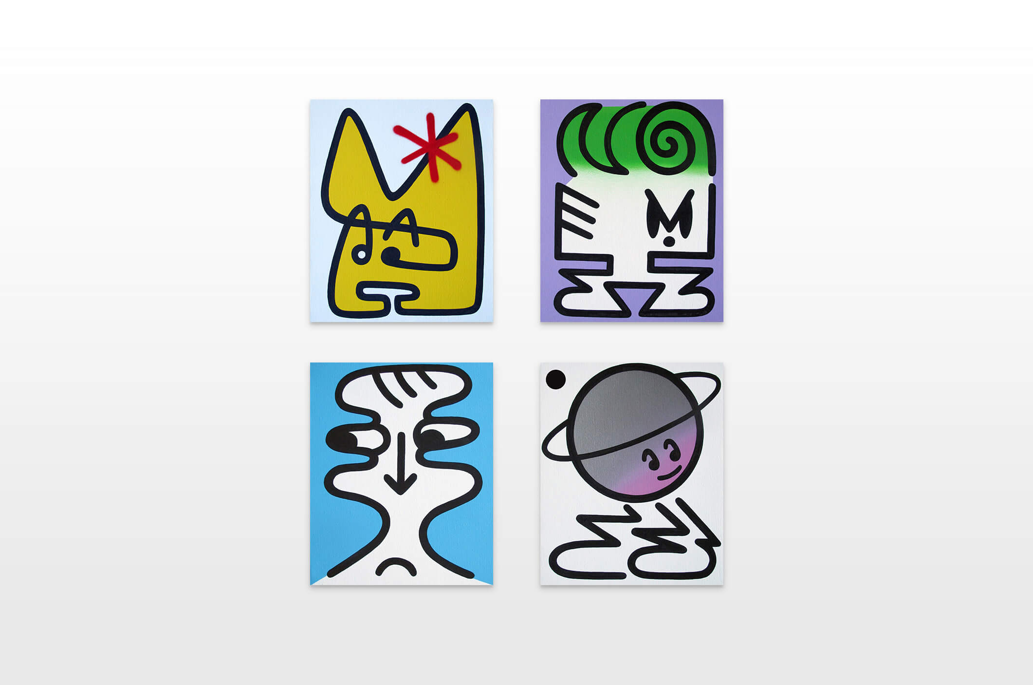 Honet’s exhibition revolves around Emojis in his words: „Gmojis (Graffiti-Emojis)“, symbols that are primary written using keyboard characters. As graffiti artist and illustrator he adds a personal twist onto them using antique or modern letters from different alphabets, in addition to punctuation, numerical, esoteric and popular symbols, as well as graffiti elements. He reinterprets the principal of anonymity and aliases of the graffiti culture, which means hiding the true identity behind a pseudonym, logo, style or aesthetic, but also the fact to be physically hidden from authorities when applying graffiti, by spraying at night or with face masks.