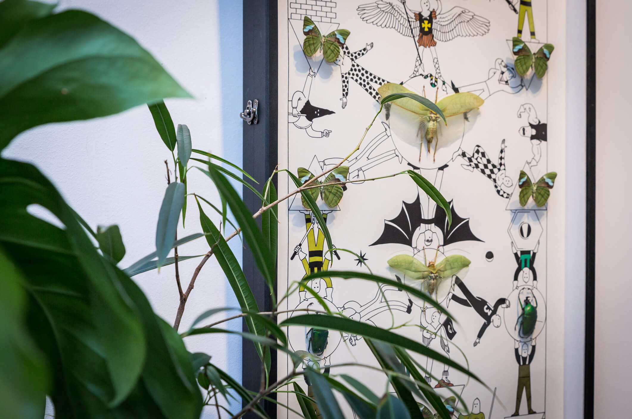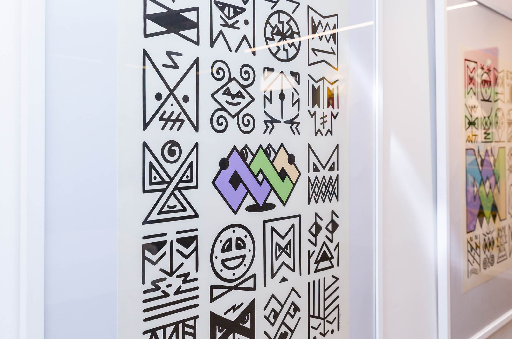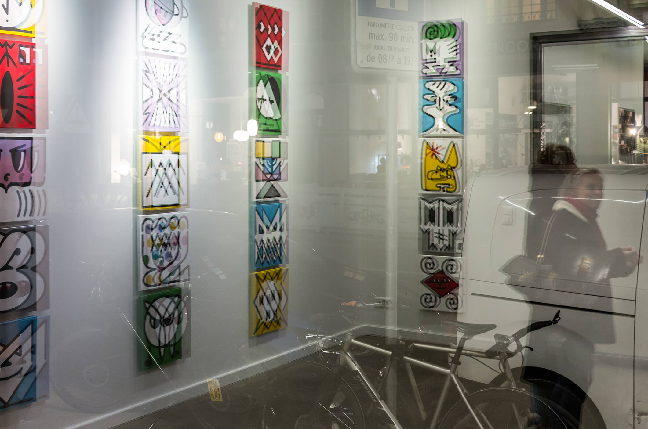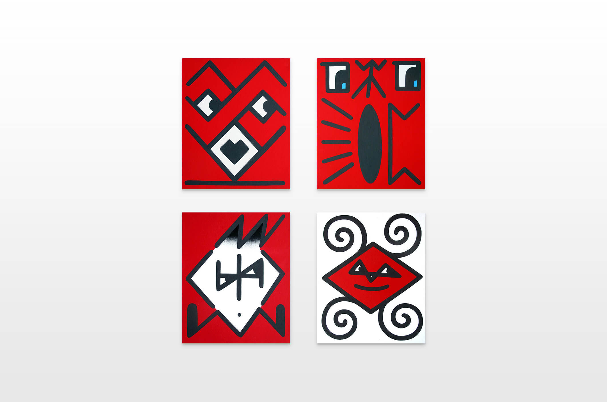 Honet’s exhibition revolves around Emojis in his words: „Gmojis (Graffiti-Emojis)“, symbols that are primary written using keyboard characters. As graffiti artist and illustrator he adds a personal twist onto them using antique or modern letters from different alphabets, in addition to punctuation, numerical, esoteric and popular symbols, as well as graffiti elements. He reinterprets the principal of anonymity and aliases of the graffiti culture, which means hiding the true identity behind a pseudonym, logo, style or aesthetic, but also the fact to be physically hidden from authorities when applying graffiti, by spraying at night or with face masks.