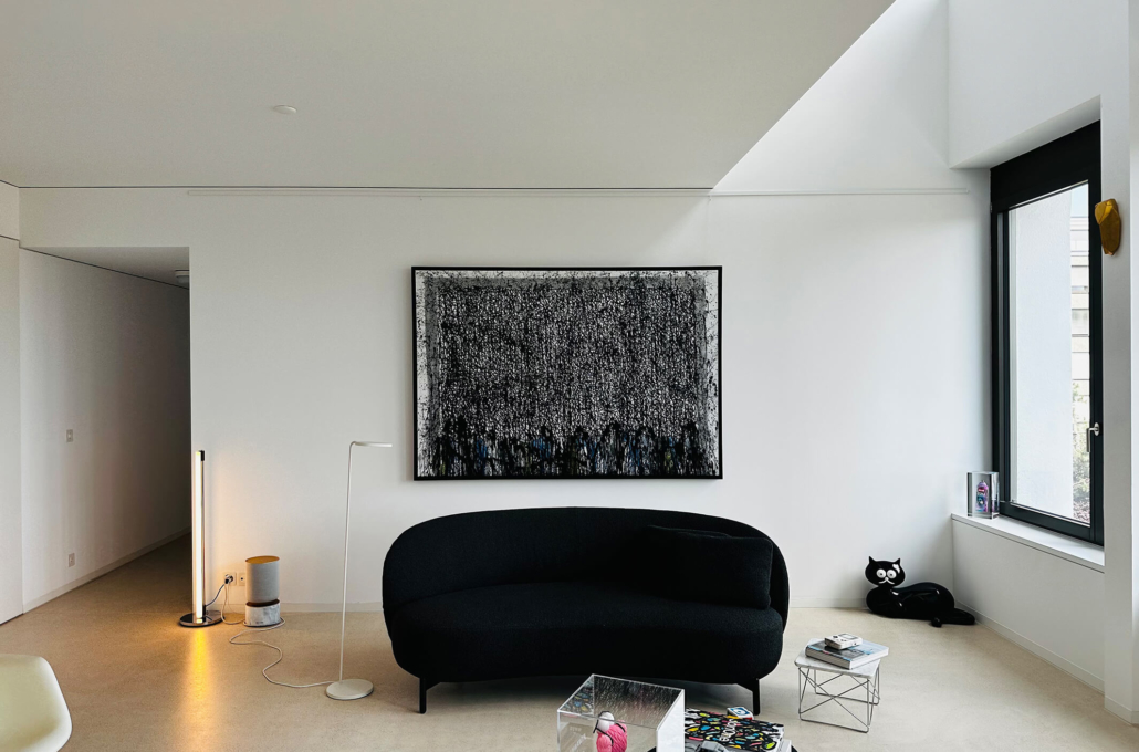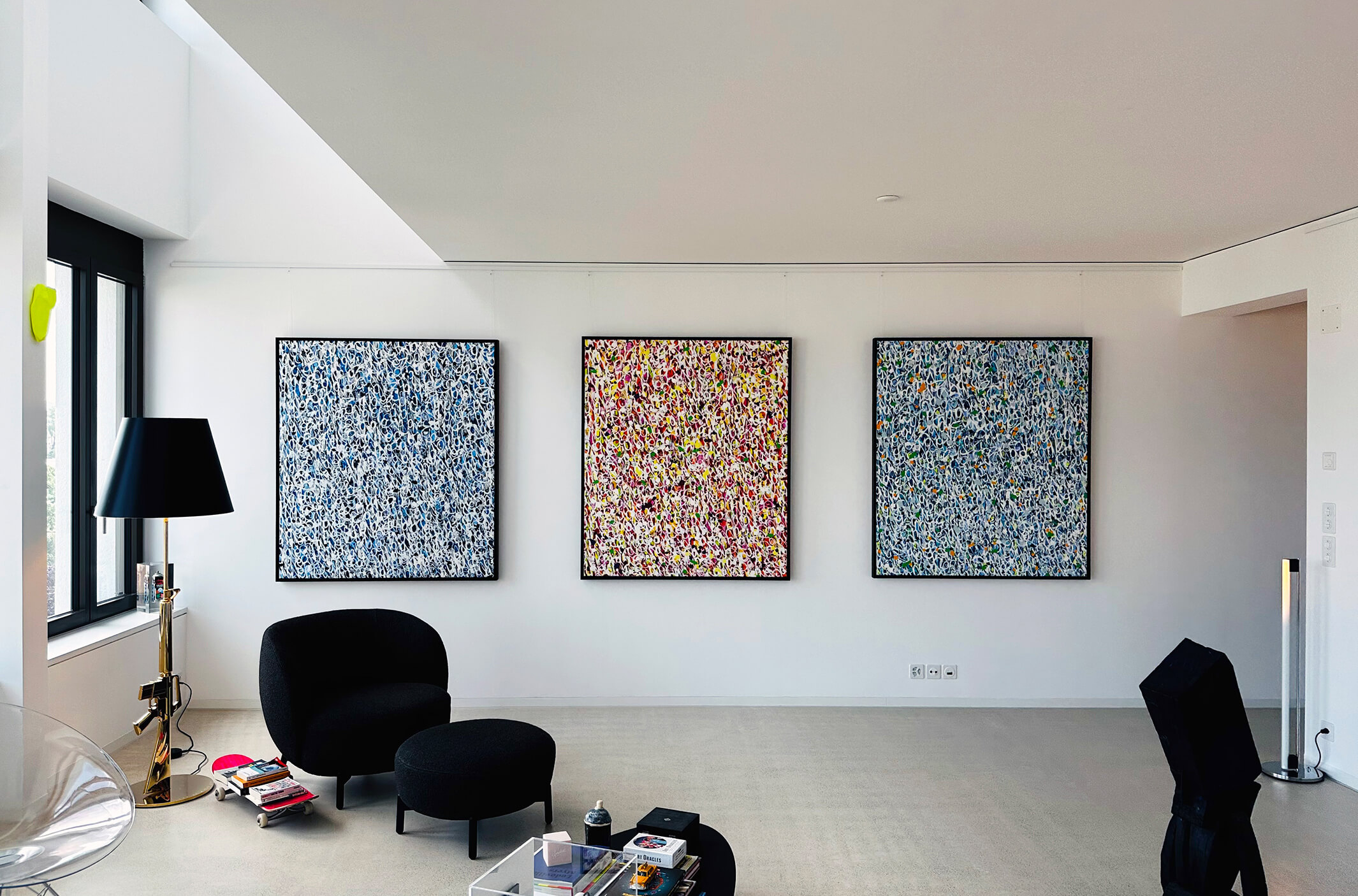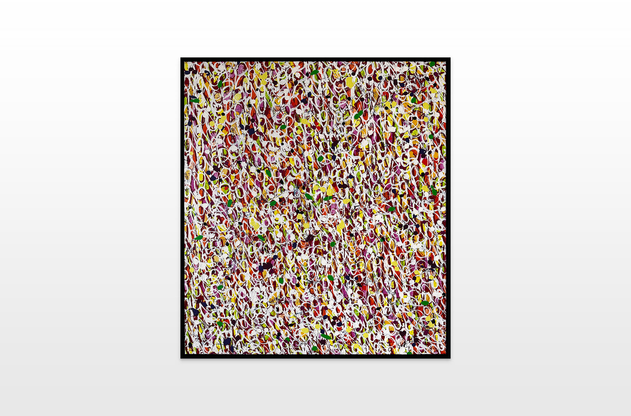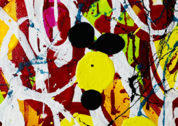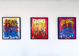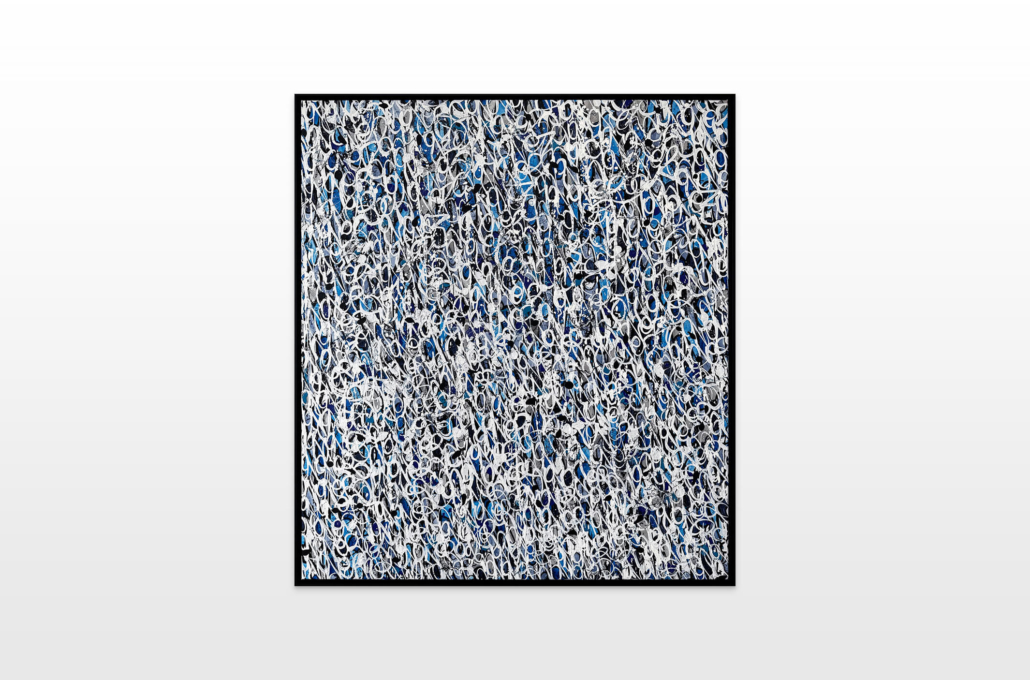 The works presented in the exhibition show the artist’s energetic, cryptic and polychrome canvases. Multiple layers and thick brushstrokes adorn his large-sized and explosive paintings. Profoundly rooted in the graffiti scene of the 1980s he made excellent use of his obsession with tagging. What might appear as abstract lines, cryptic shapes or intentional drips of paint to the viewer, actually represent his own tag ‚JONONE‘, sometimes also in variations as ‚JONONE ROCK‘.