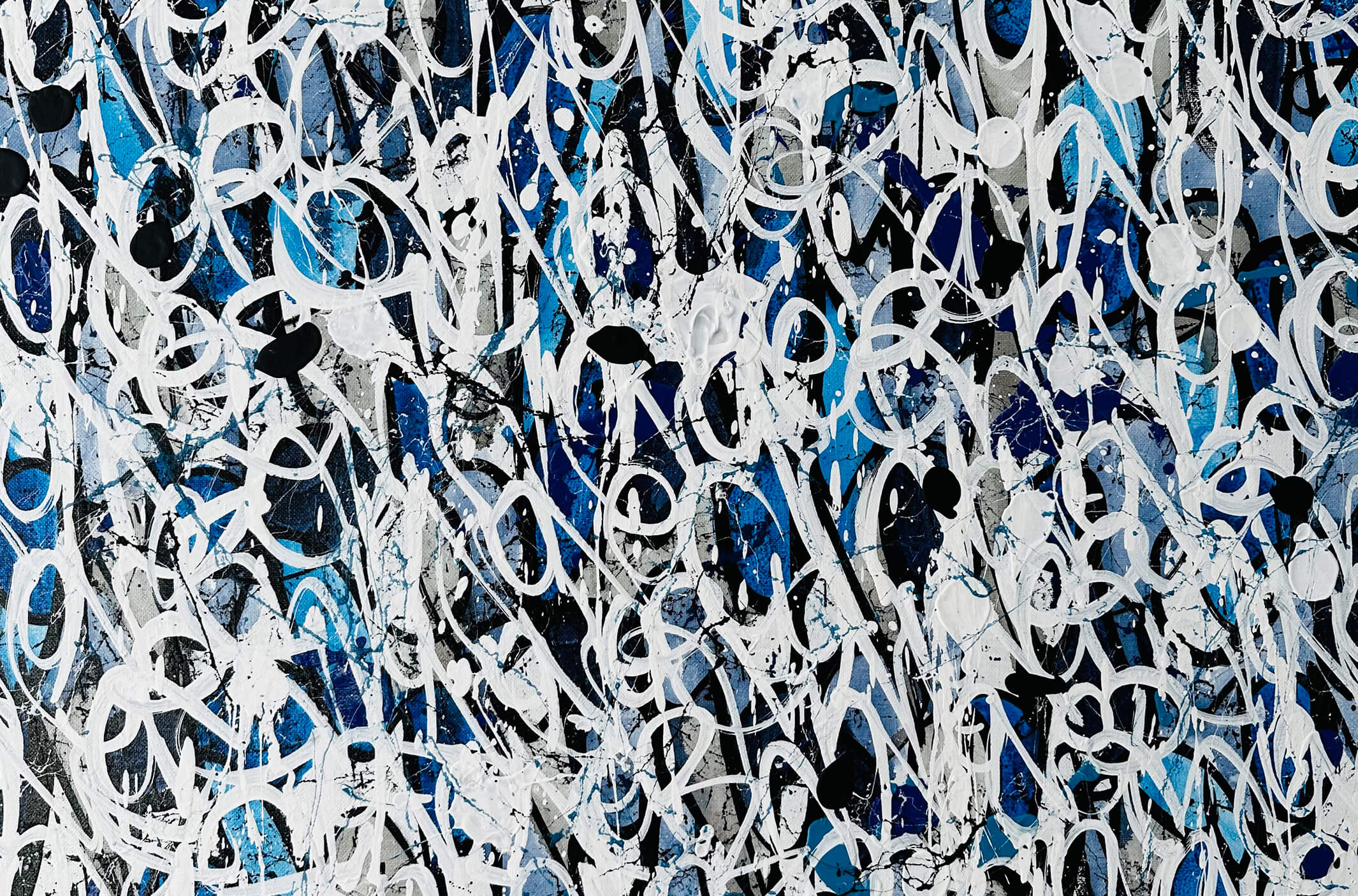 At a closer look, letters and even his tag are recognizable. The regularity of repeating his tag over and over again, is not monotonous, in contrary, it is divers, complex and rich. Eventually the writing develops into an abstract pattern within the beauty of infinity.