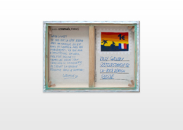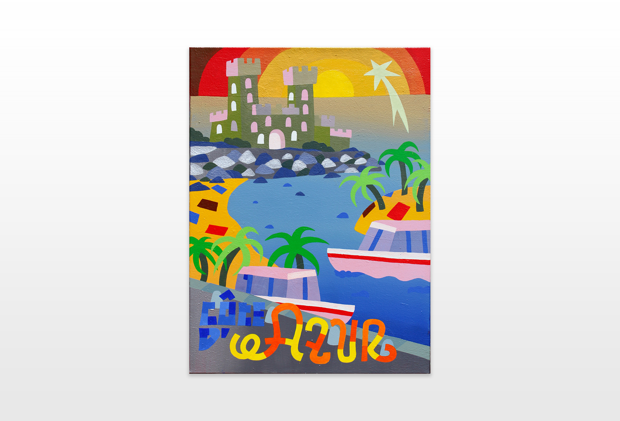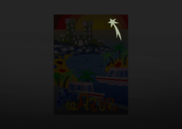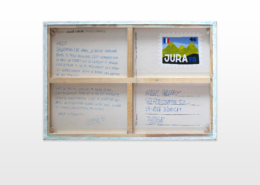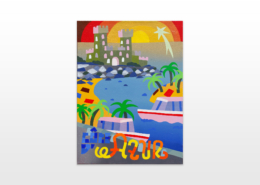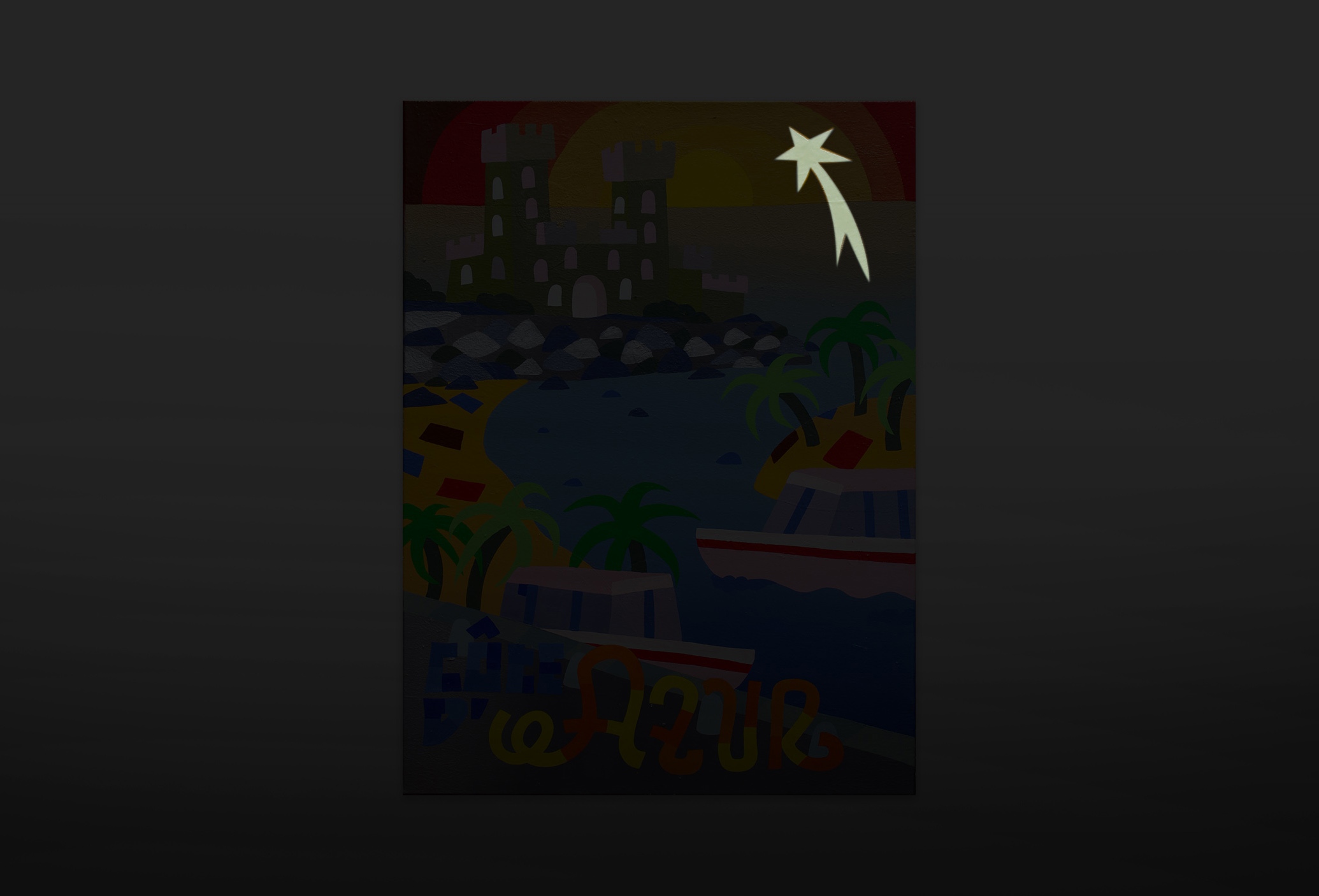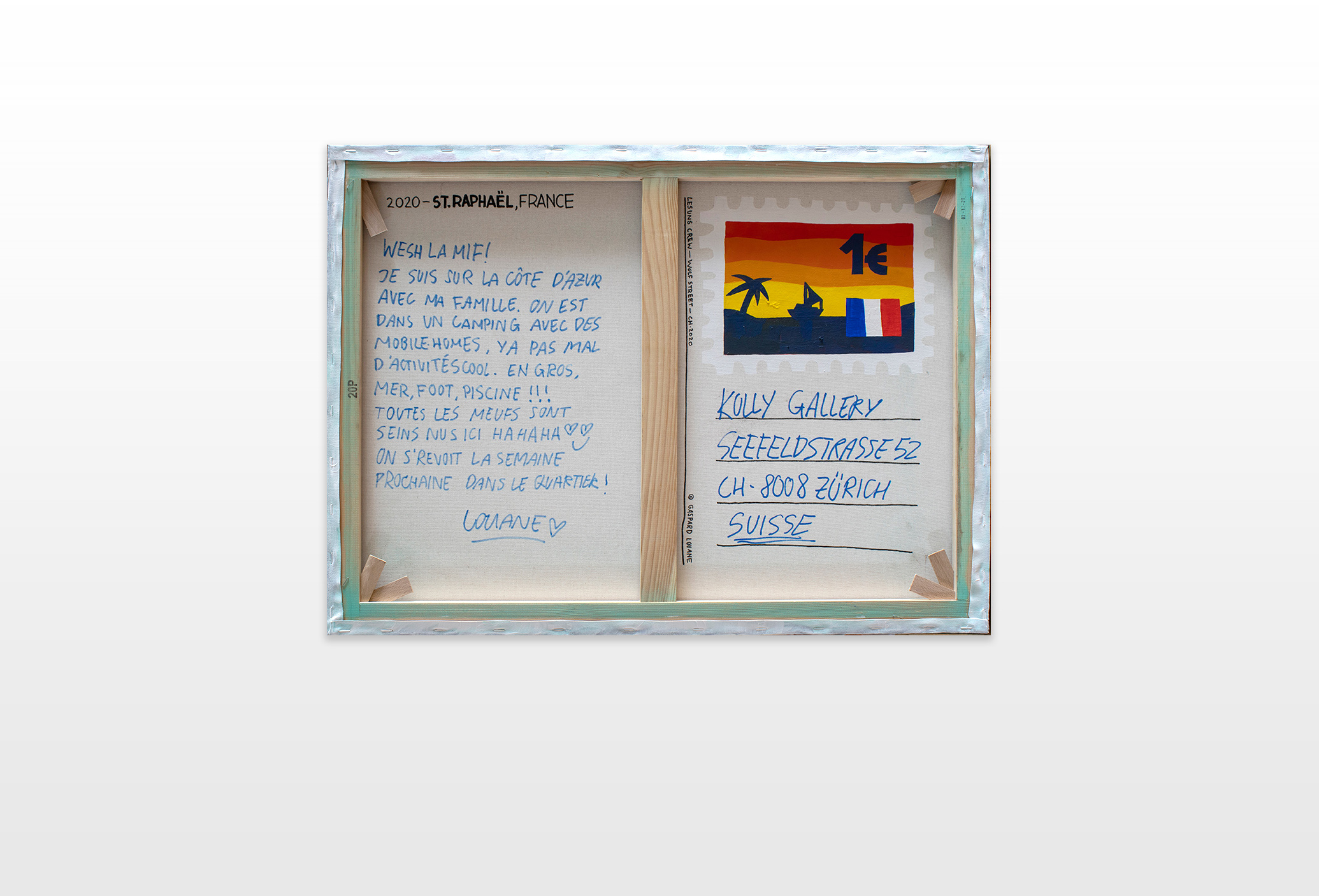 What appears to be an aesthetic decoration is the stylization of the lettering to designate the place. Style writing is always present in Louane’s art works. Also within the Holidays series the figurative motif is clearly in the foreground. Extraordinary is the multi-functionality of a canvas and its transformation in the dark, due to the fluorescent details. Moreover, they carry content on the front as well as the back.