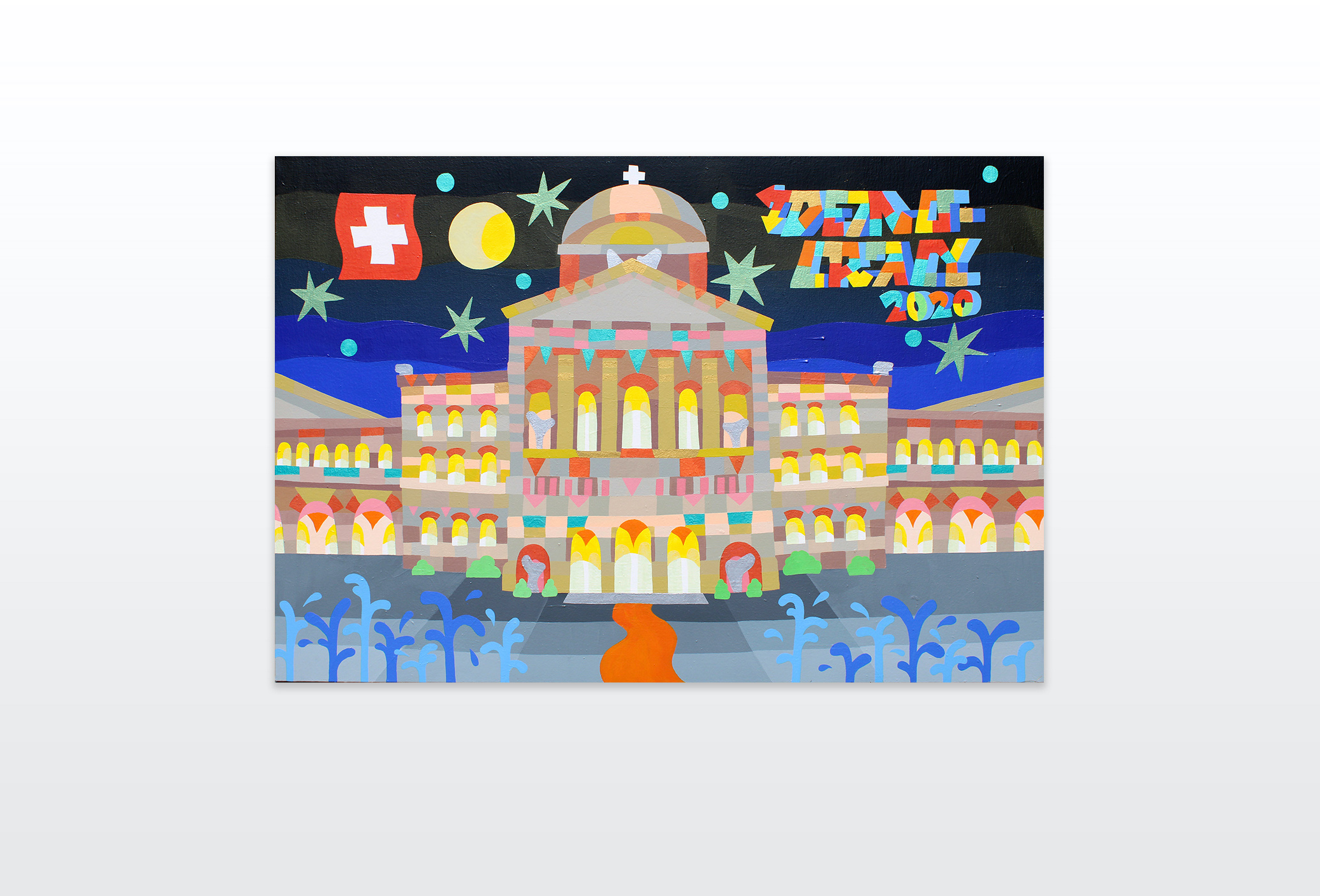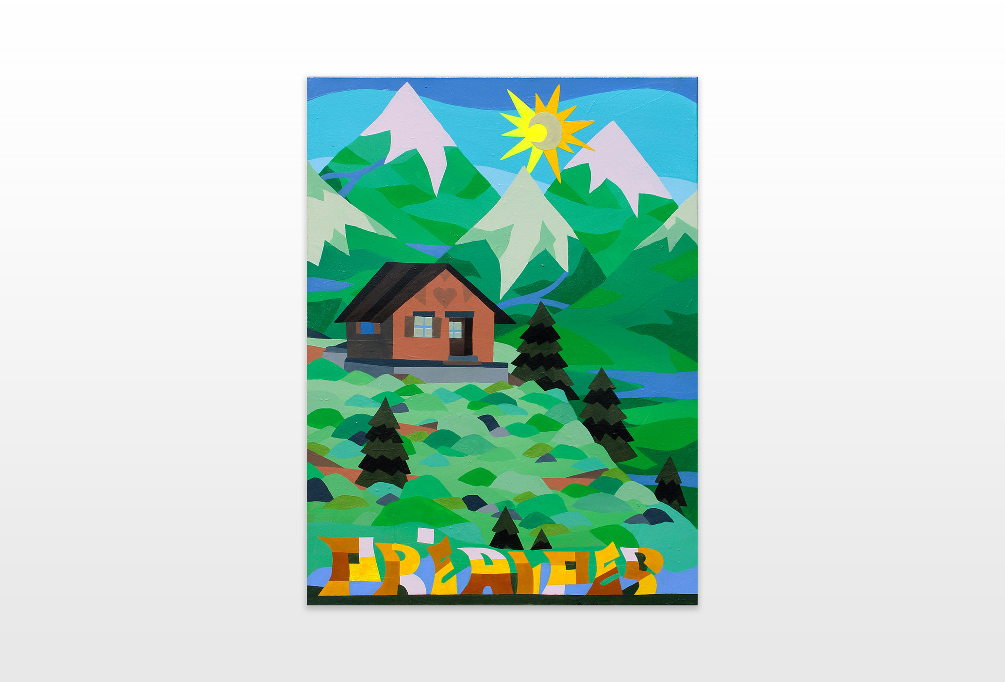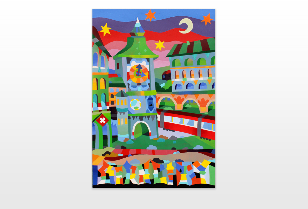 The aesthetic character of Louane’s works is expressionistic and free in use of colour. The depicted architectural motifs and landscapes seem almost sacral. The symmetry as well as the mosaic-like and detailed colour fields reinforce this impression. The forms and fields are geometric, precise yet slightly naive. The painting appears flat and bold, with little depth. Striking colour contrasts are complemented by a prevailing renunciation of perspective and shading. Due to the unrealistic colouring the art works seem slightly surreal.