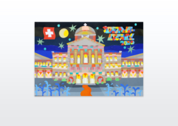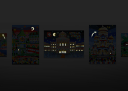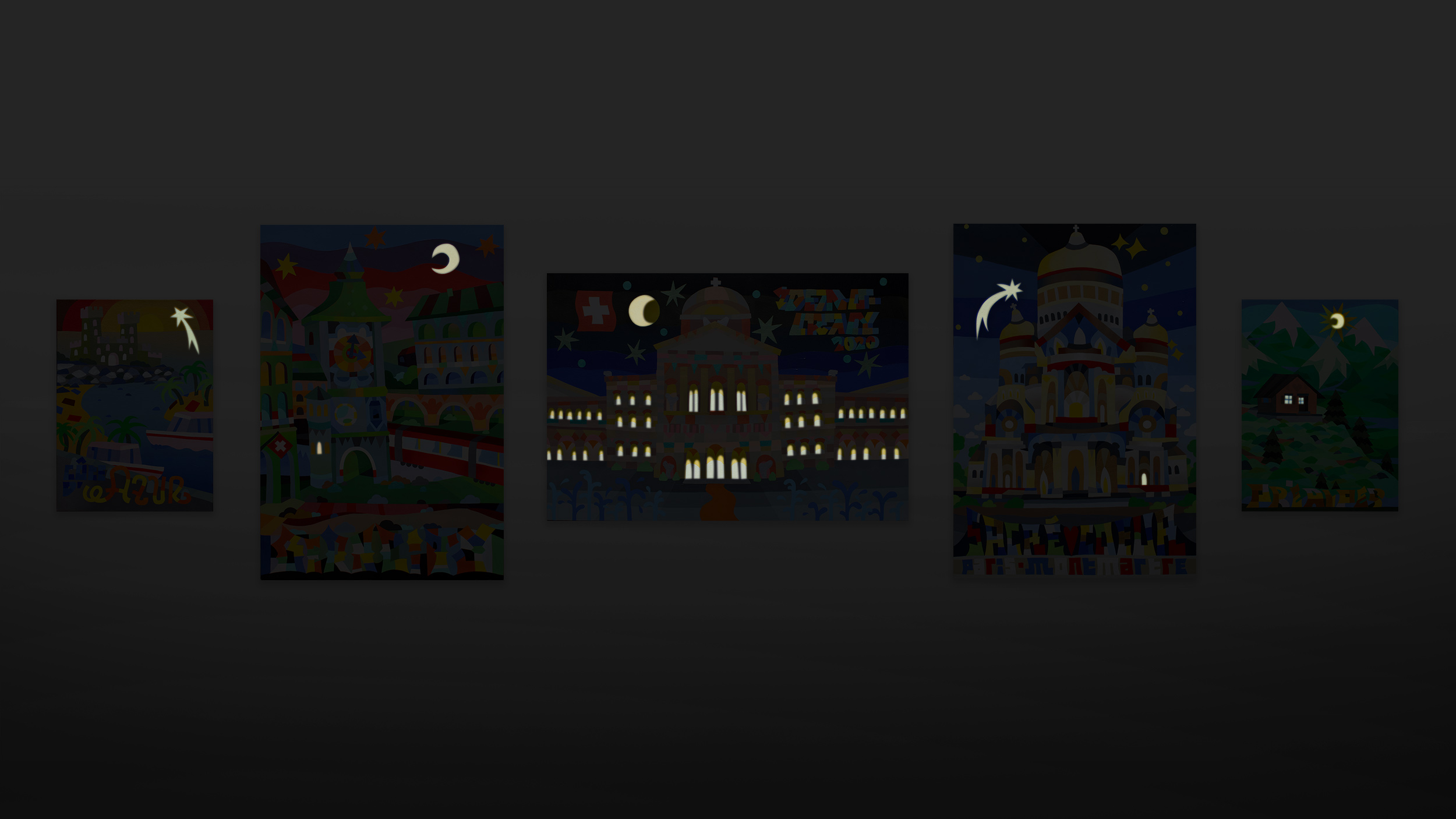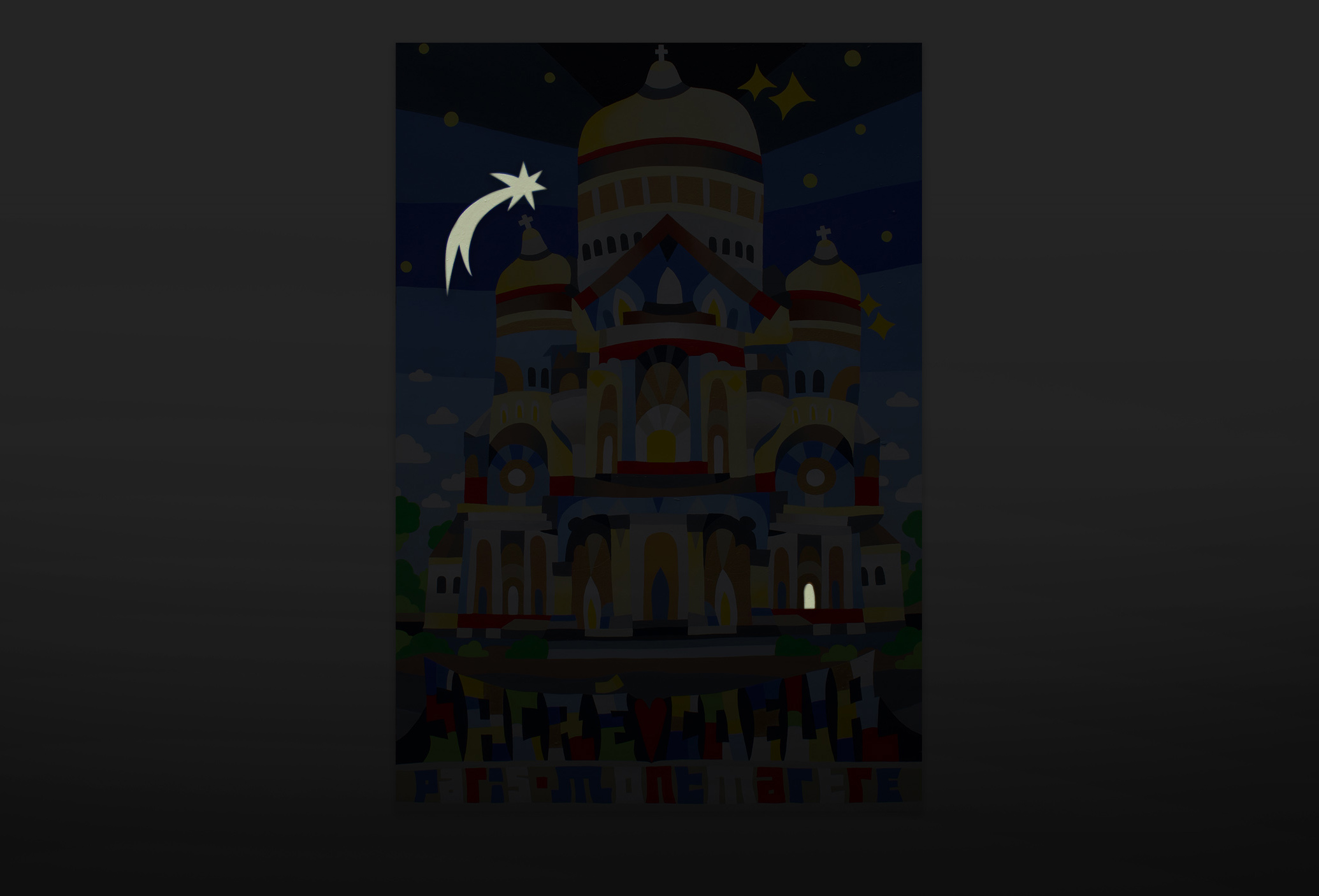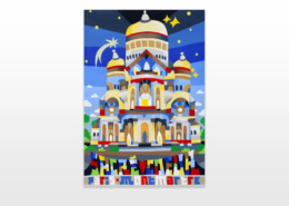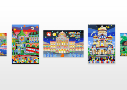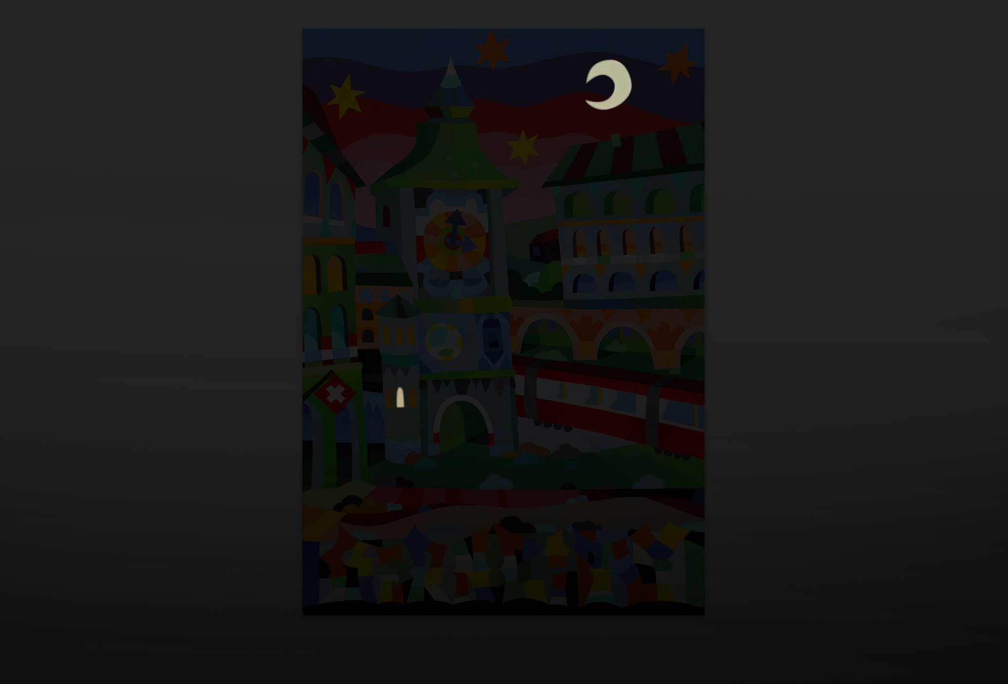 The aesthetic character of Louane’s works is expressionistic and free in use of colour. The depicted architectural motifs and landscapes seem almost sacral. The symmetry as well as the mosaic-like and detailed colour fields reinforce this impression. The forms and fields are geometric, precise yet slightly naive. The painting appears flat and bold, with little depth. Striking colour contrasts are complemented by a prevailing renunciation of perspective and shading. Due to the unrealistic colouring the art works seem slightly surreal.