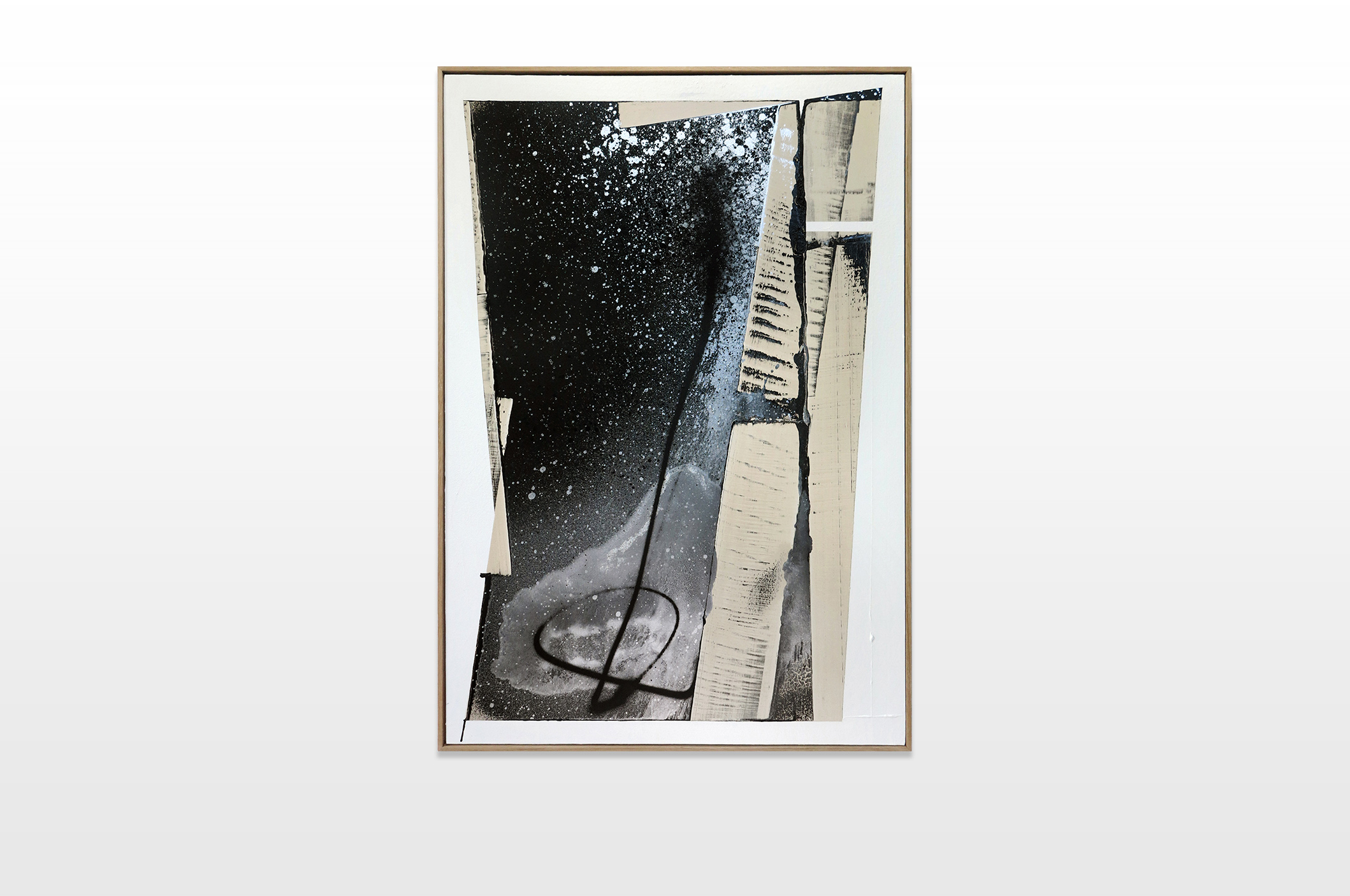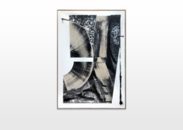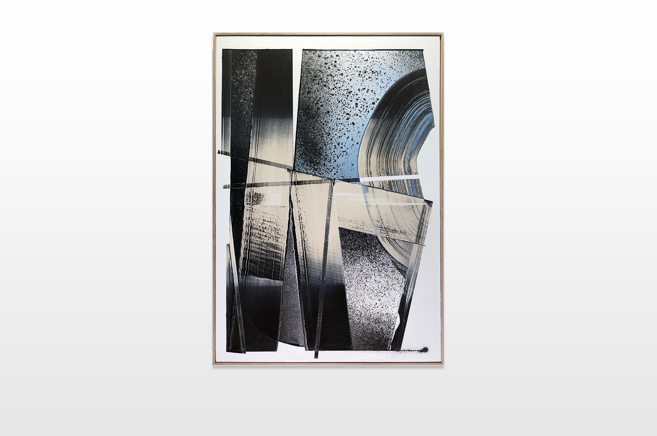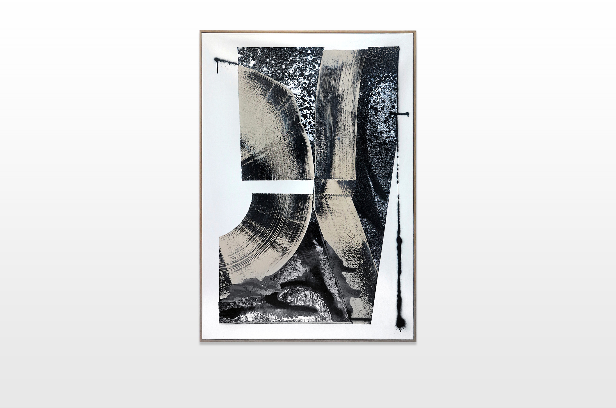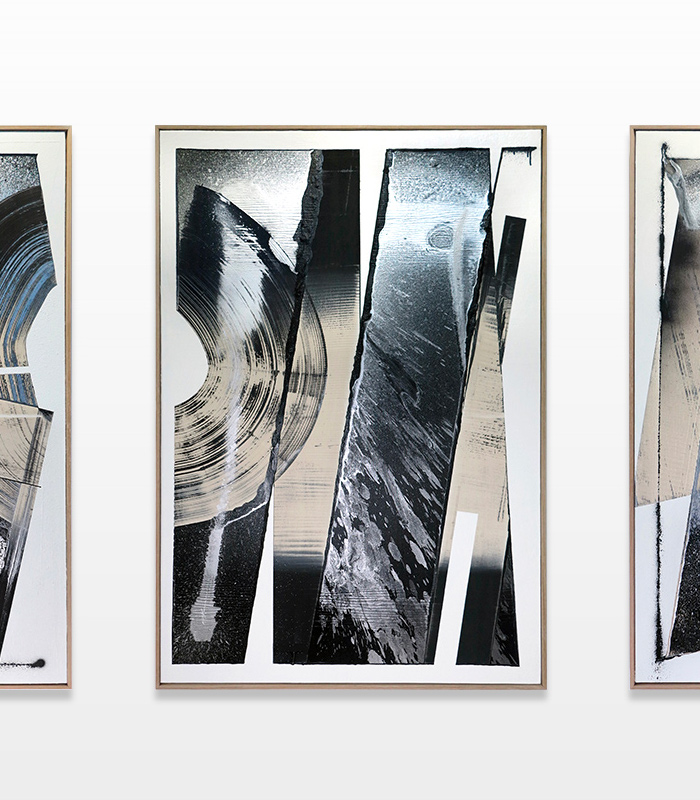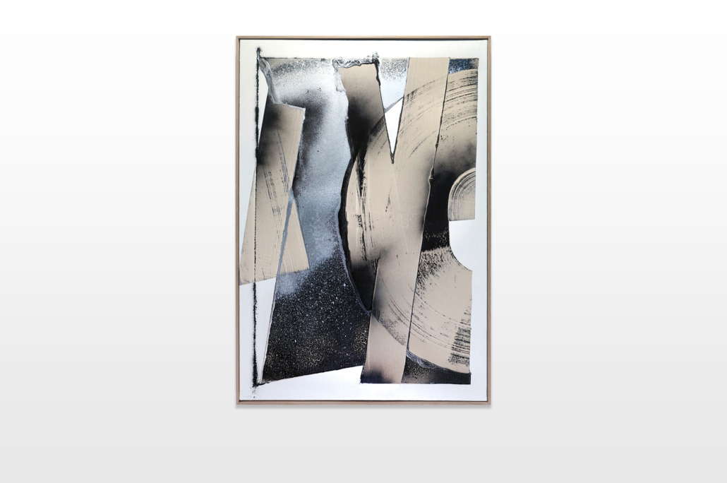 The color choices of his current series are directly inspired by graffiti. Beige represents restoration paint, whose neutrality is particularly interesting to the artist. In fact, he realized that the neutral colors, beiges, off-whites and light greys are associated in „our“ (western) latitudes with cleanness, save environment and high living standard, which additionally acts as societal and cultural marker. The seemingly neutral non-colours are also used by cleaning institutions to paint over graffiti or tags. Chrome is an obvious borrowing from graffiti. Its ability to cover all types of surfaces as well as its silvery, light-reflecting shade gives every graffiti an incomparable visual effectiveness. Therefore the chrome and black color combination has imposed itself as a must. The white backgrounds in L’outsiders art works emphasize the architectural balance between his forms and shapes.