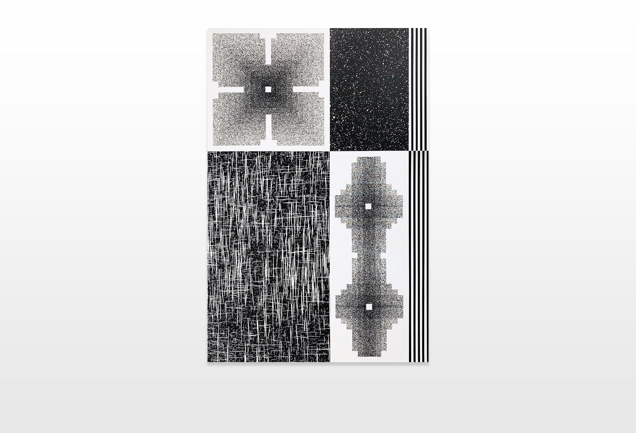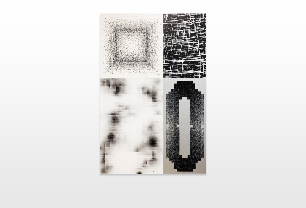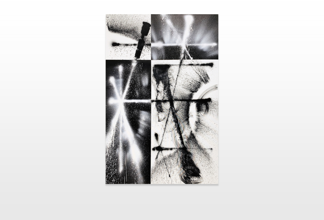 The canvases reflect his graffiti roots and therefore present abstract and planar compositions, complemented by wild splashes. Observing his visual imagery he developed a practice of graffiti that is no longer based on the deformation of the letter, but on a transposition of geometric shapes which inhere the elementary typography of letters.