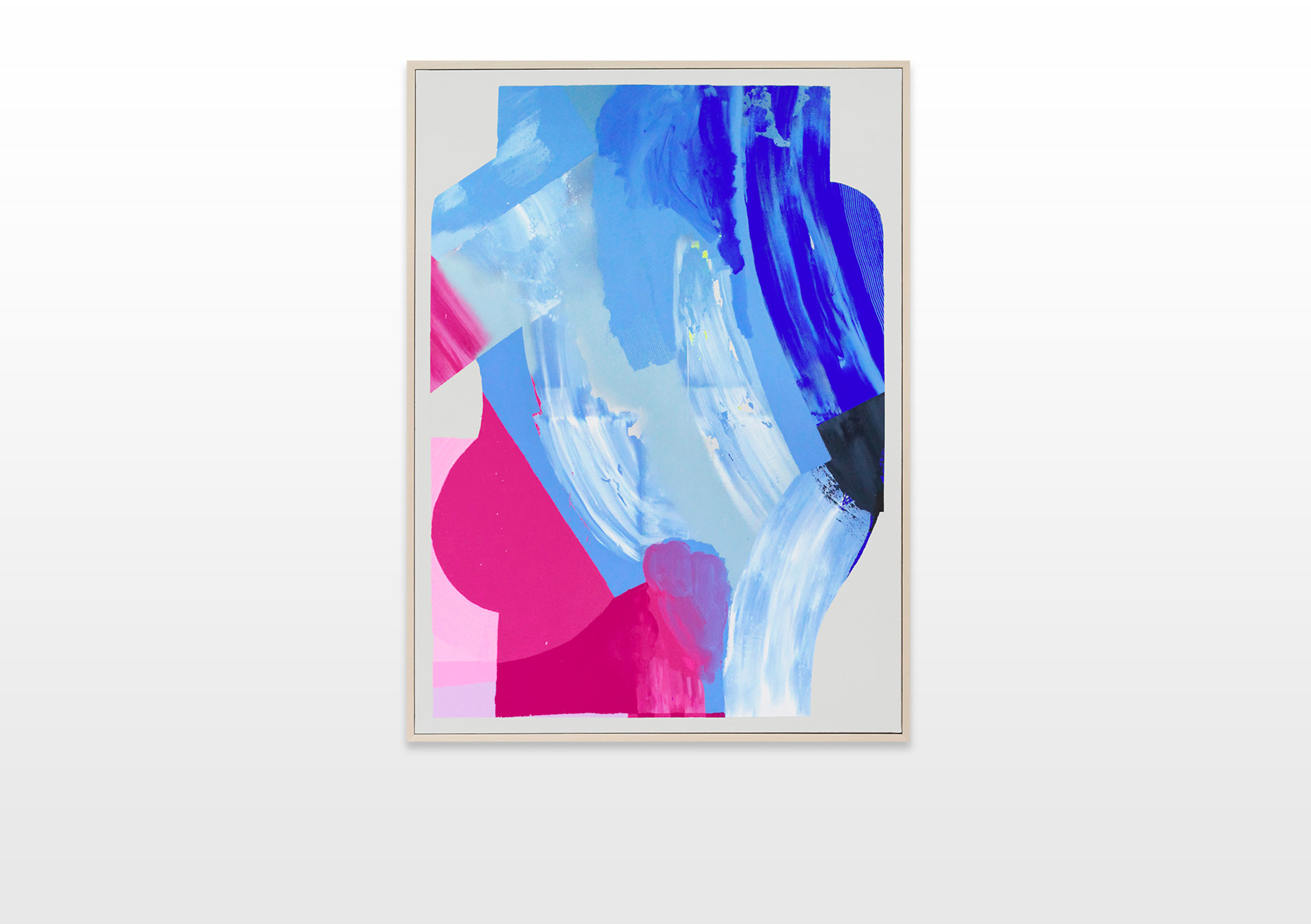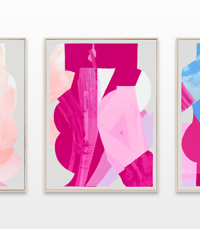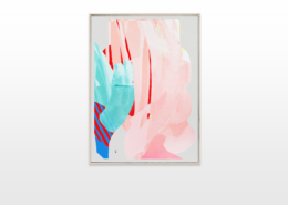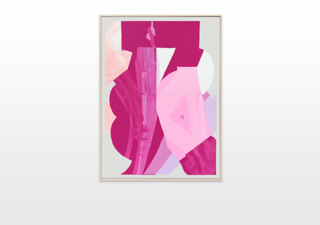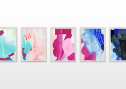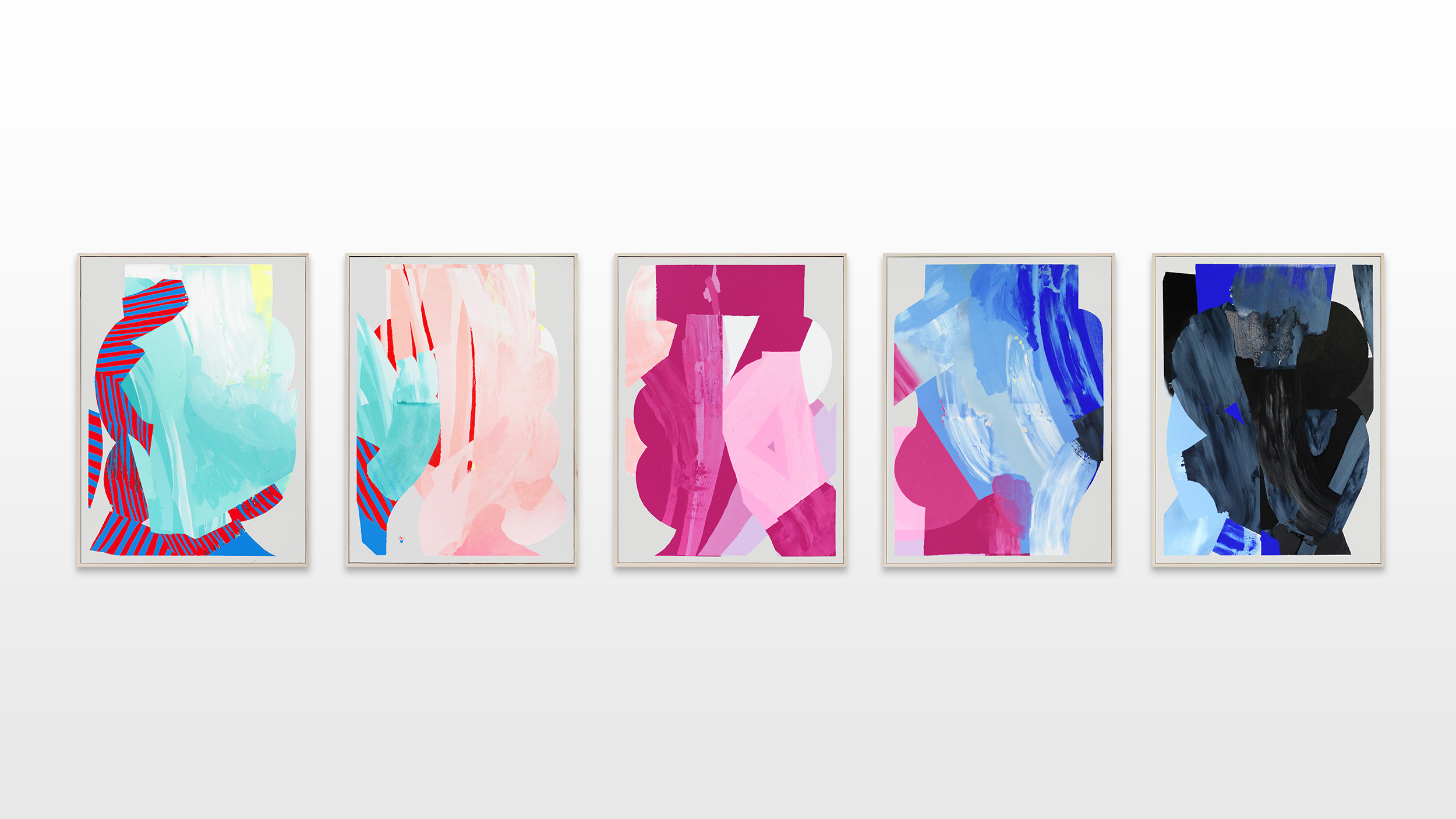 The color progression begins with a pastel turquoise and blue color palette, then merges to a pastel salmon color, which transforms to a bold pink-magenta. Slowly it merges to a sky blue, which passes to a transcended blue and ends with a very dark color palette. To emphasize his concept and the gradual color transition, Ilk integrates a color and shape fragment of the previous painting into the next one.