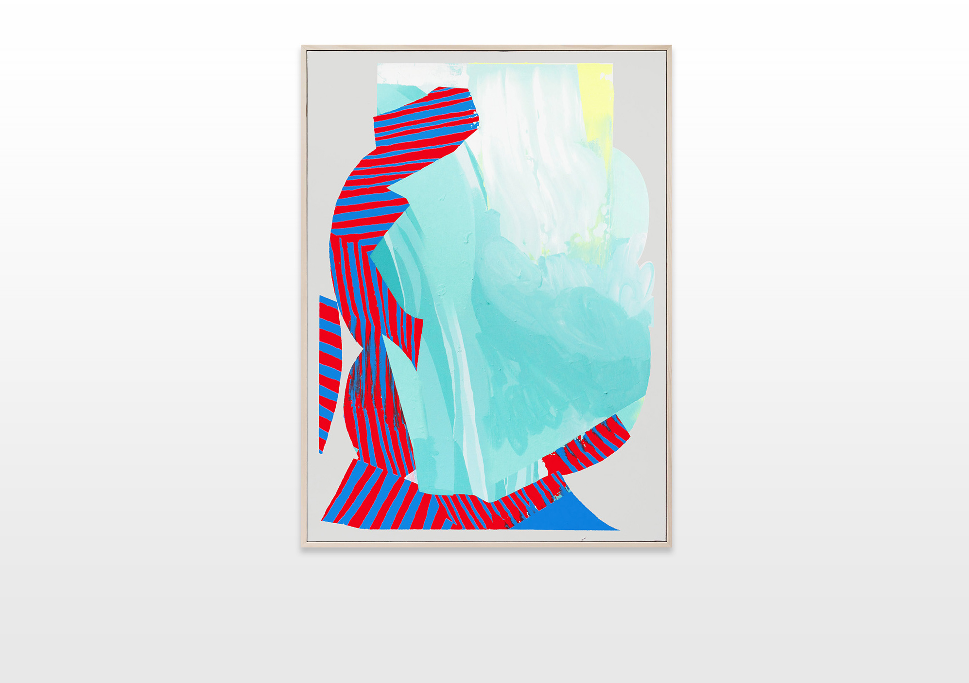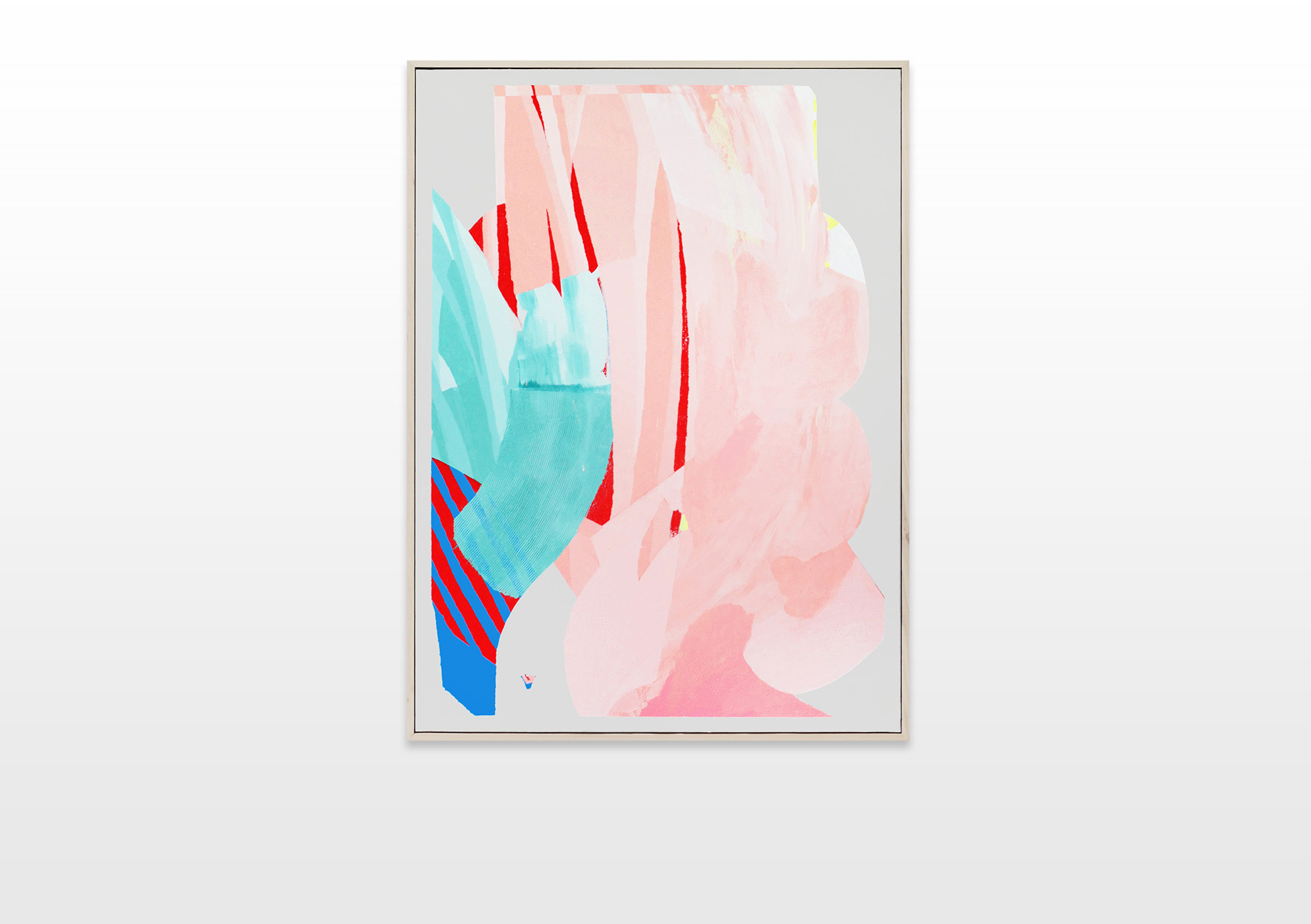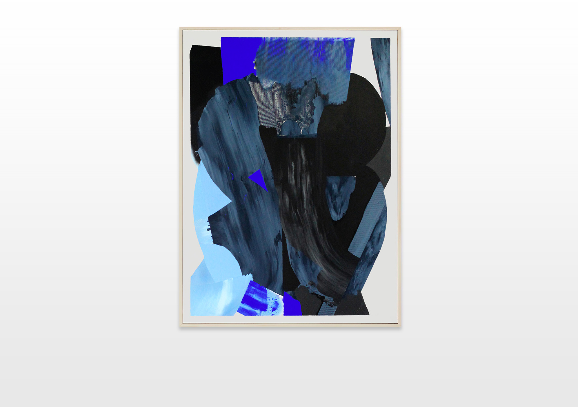 The color progression begins with a pastel turquoise and blue color palette, then merges to a pastel salmon color, which transforms to a bold pink-magenta. Slowly it merges to a sky blue, which passes to a transcended blue and ends with a very dark color palette. To emphasize his concept and the gradual color transition, Ilk integrates a color and shape fragment of the previous painting into the next one.