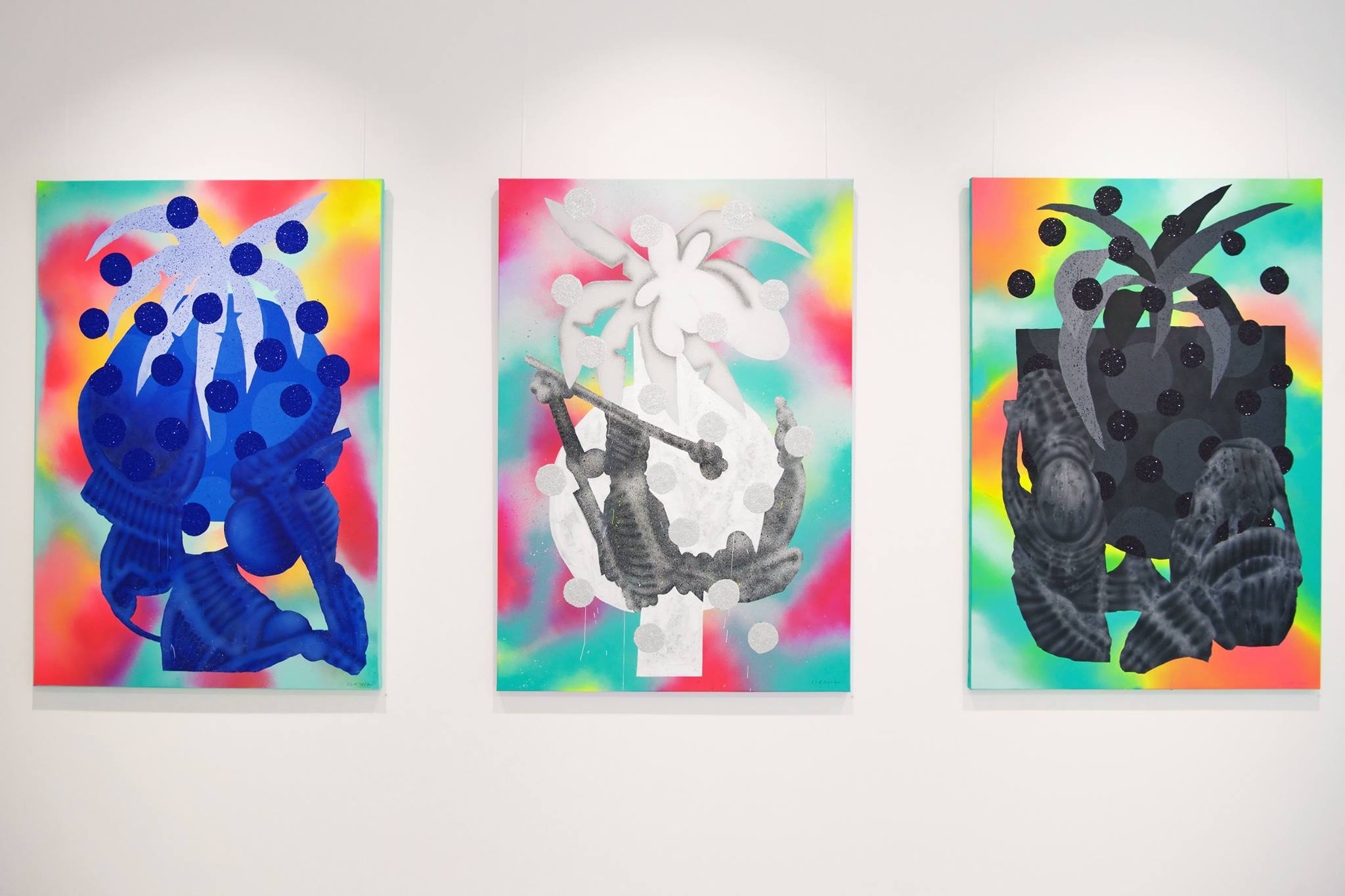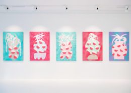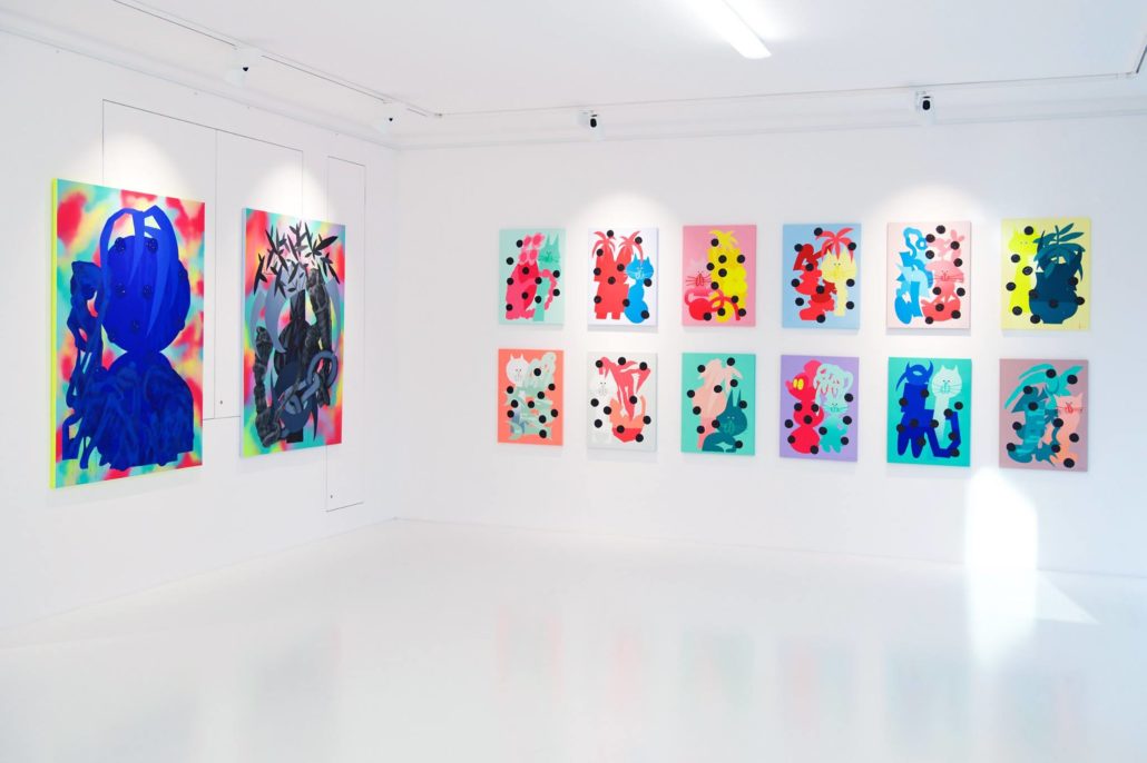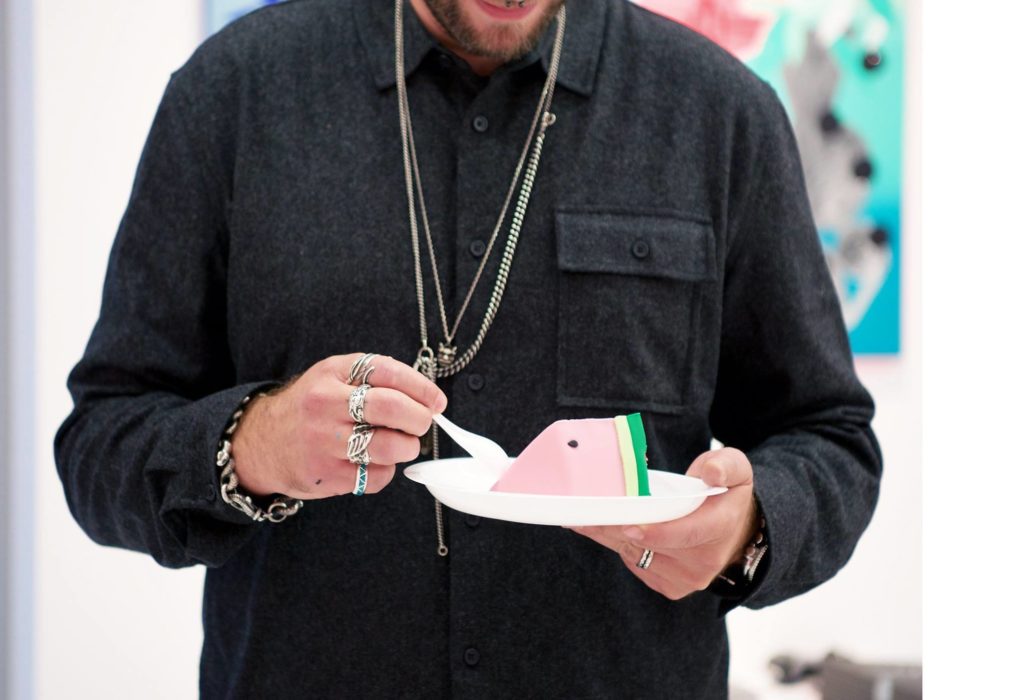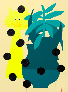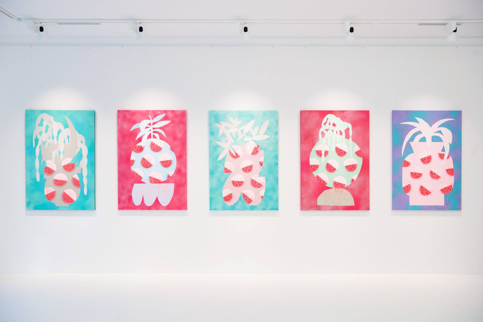 The two-folded title of the exhibition reveals the multi-interested and creative character of the artist. Not only cats as well as fashion but also… watermelons, plants and chains are part of Ilk’s visual repertoire and creative practice. Ludovilk Myers’s symbolic language merges elements of his daily life and his personal interests, which gives his artworks an organic yet graphic, surrealistic and psychedelic aesthetic.