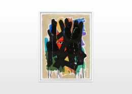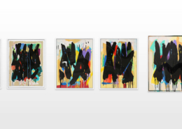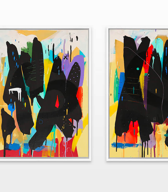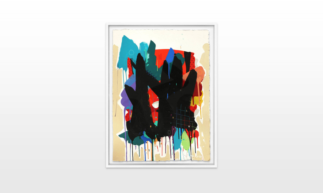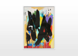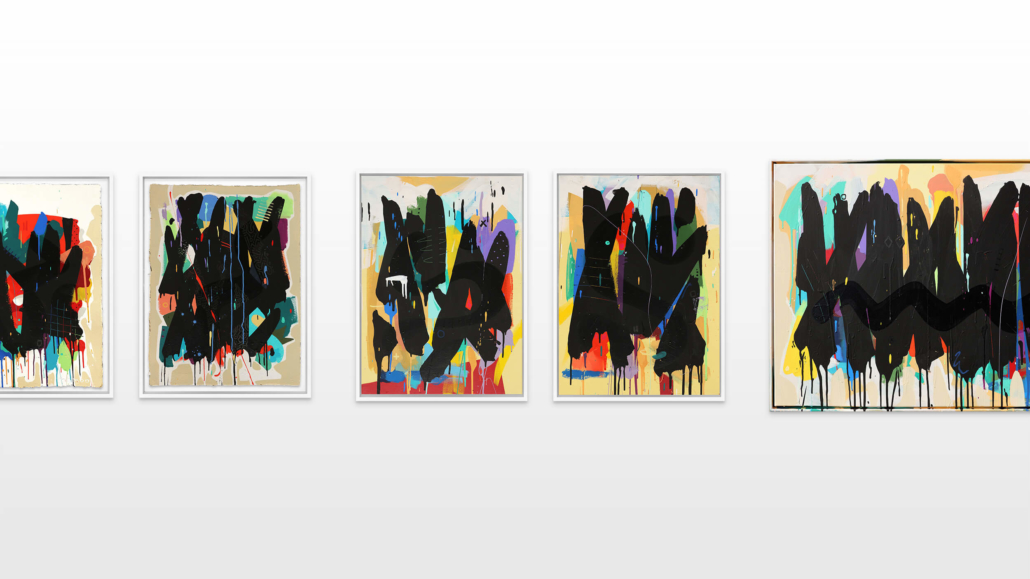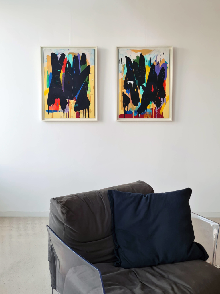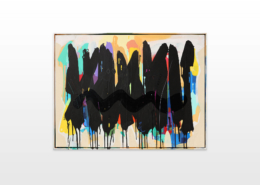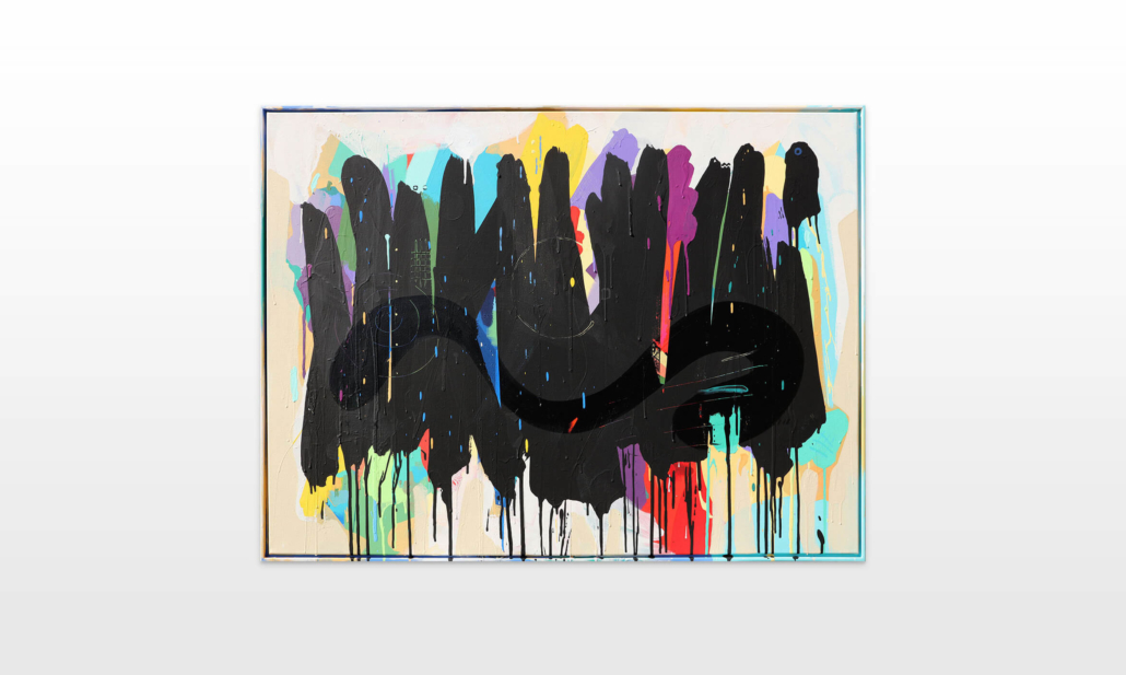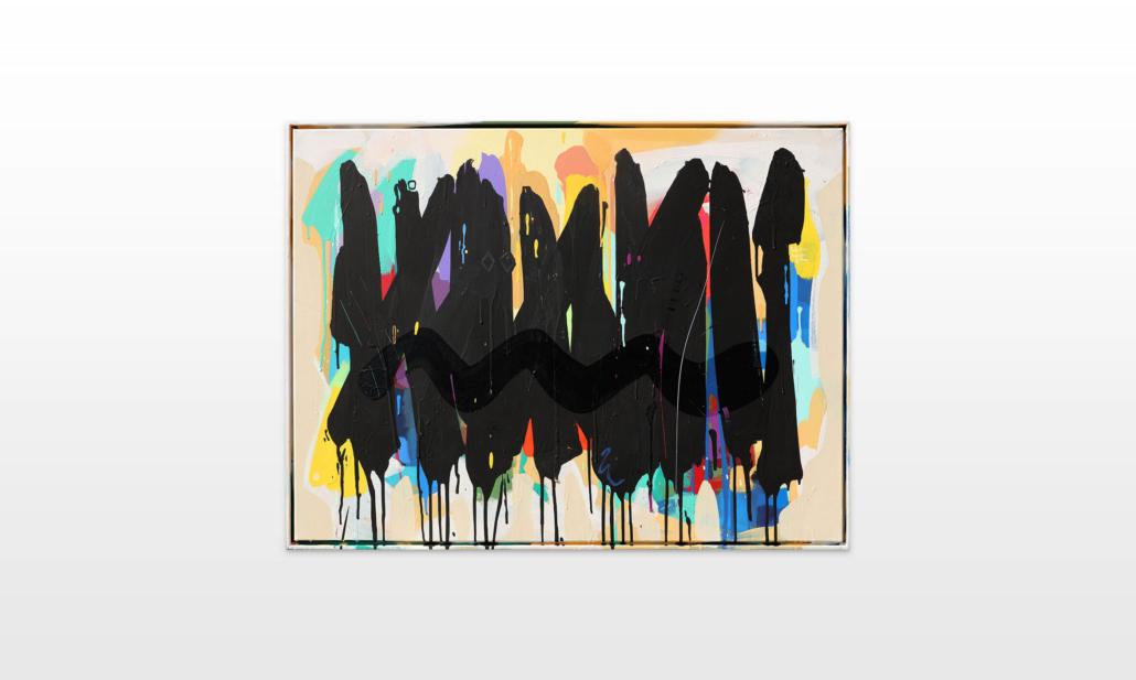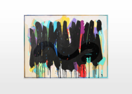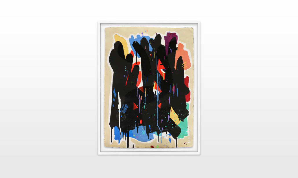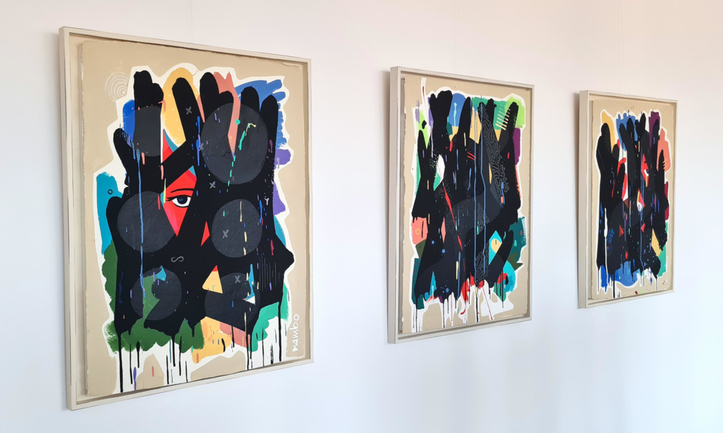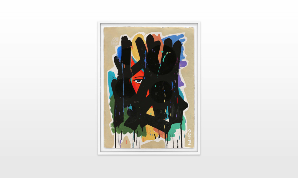 Mambo has gathered these pieces along several years, since his first studio in Los Angeles in 2011. He started to repaint and so to say “recycle“ artworks from the Humans and Brainology series, which did not feel complete and satisfying to him. The decision to do “something else” with it, slowly grew into a concept based on black painted gestures, which were covering colors, shapes and figures. This sharp intervention created a subtle interplay between joy and seriousness. Once the black paint was applied, the initially colorful and energetic artworks, expanded into a whole different dimension. They revive a fresh dynamic and nevertheless they contain fractions of their first life.