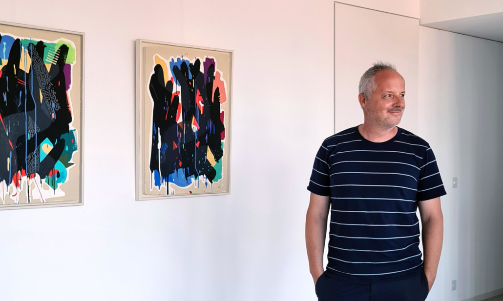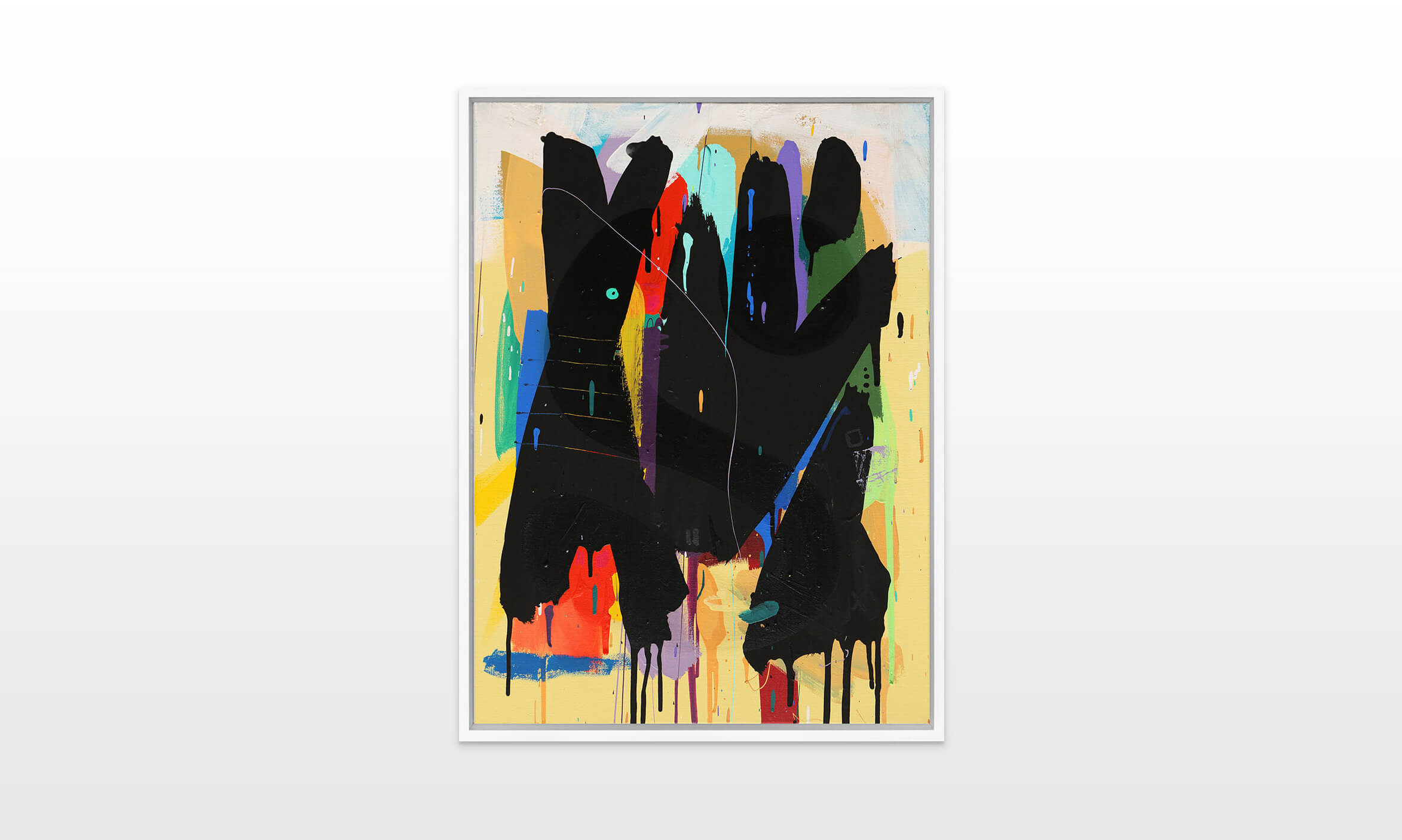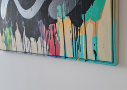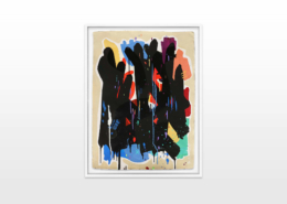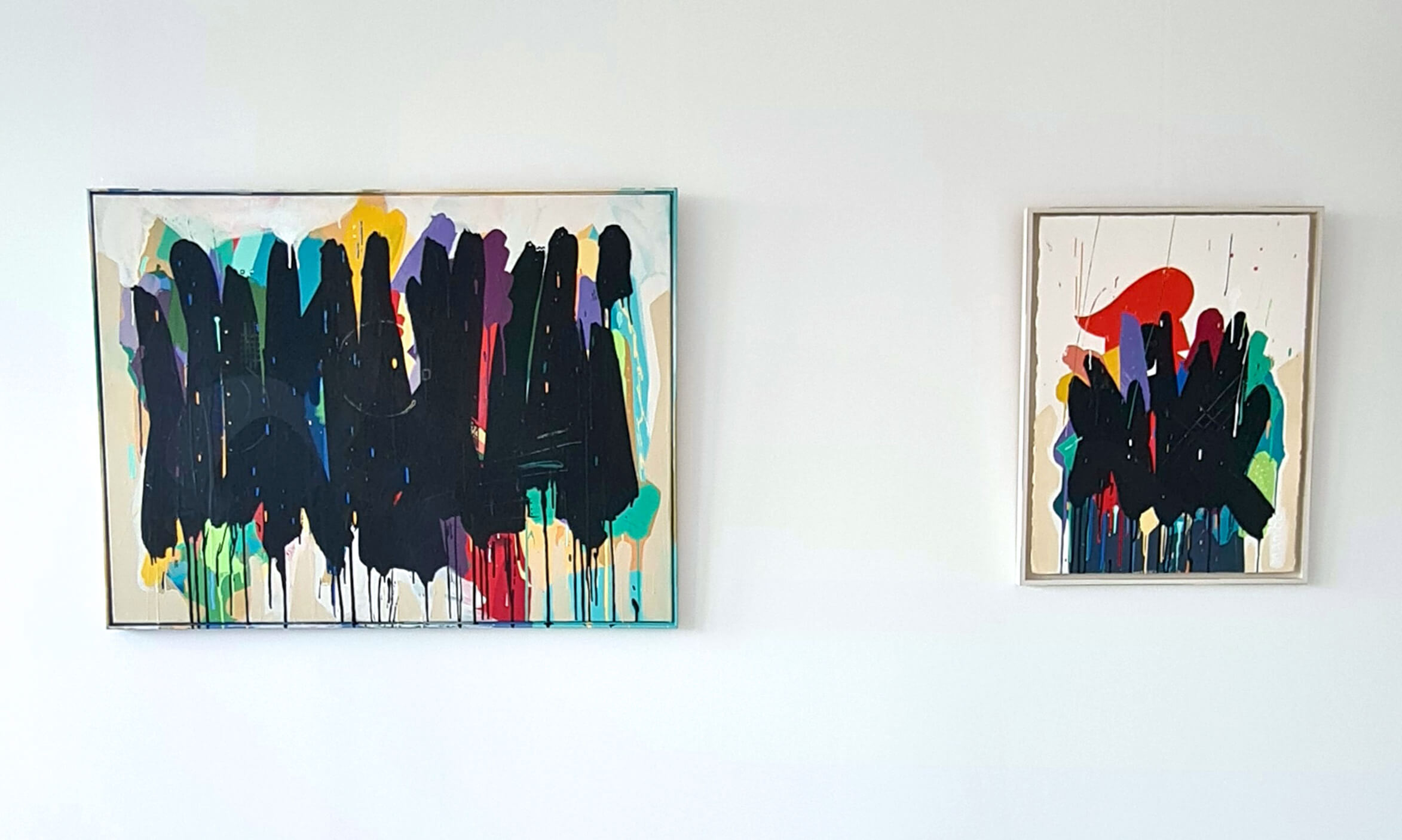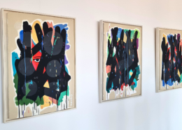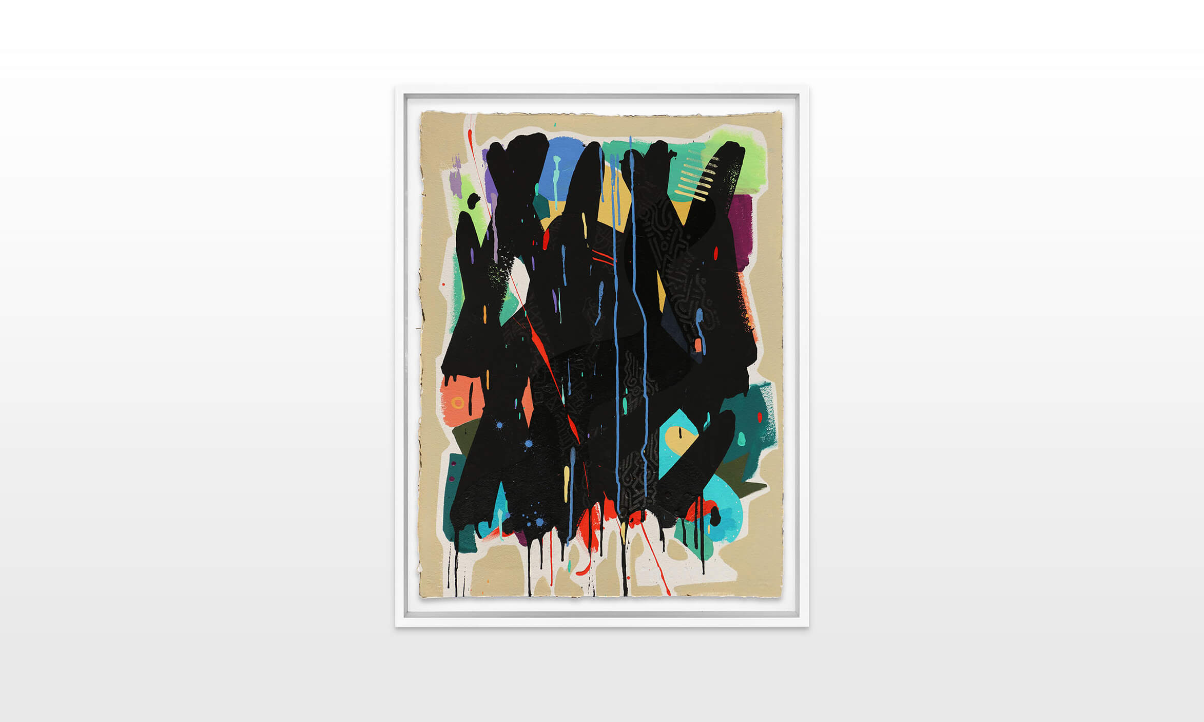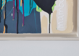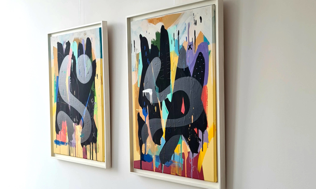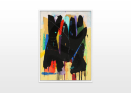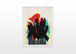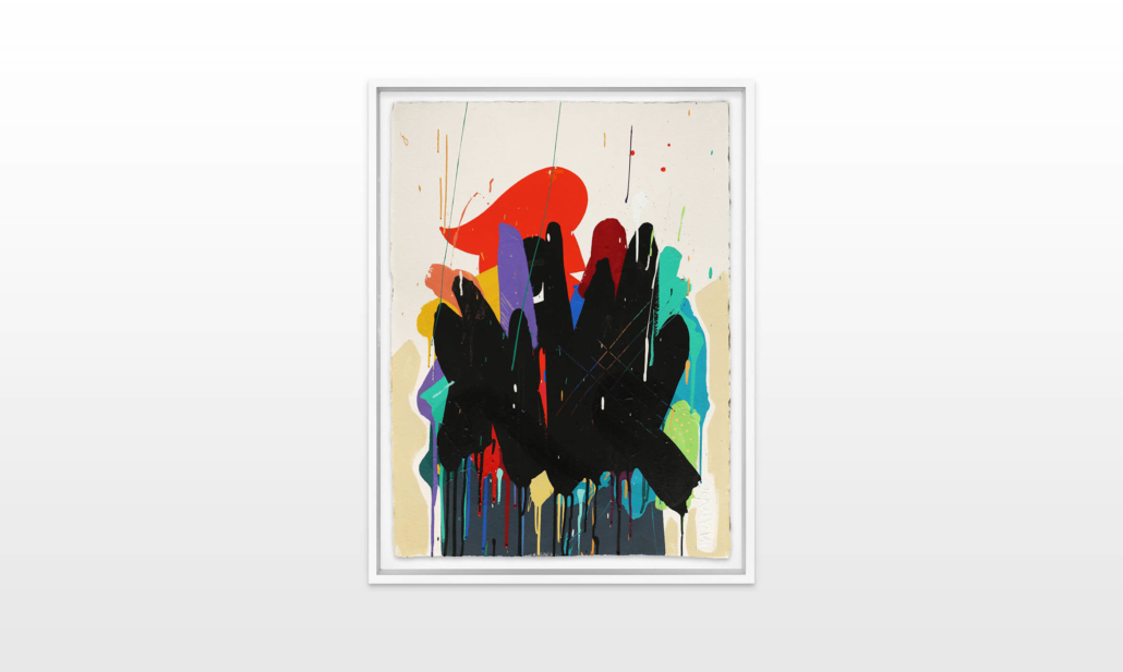 Mambo has gathered these pieces along several years, since his first studio in Los Angeles in 2011. He started to repaint and so to say “recycle“ artworks from the Humans and Brainology series, which did not feel complete and satisfying to him. The decision to do “something else” with it, slowly grew into a concept based on black painted gestures, which were covering colors, shapes and figures. This sharp intervention created a subtle interplay between joy and seriousness. Once the black paint was applied, the initially colorful and energetic artworks, expanded into a whole different dimension. They revive a fresh dynamic and nevertheless they contain fractions of their first life.