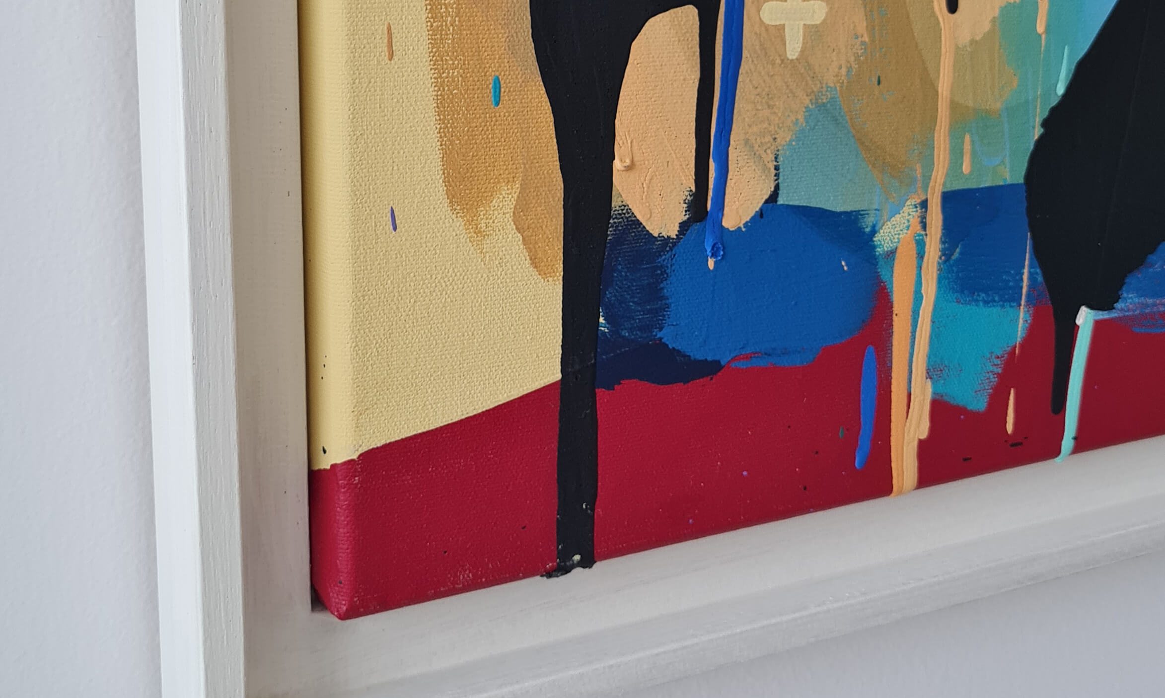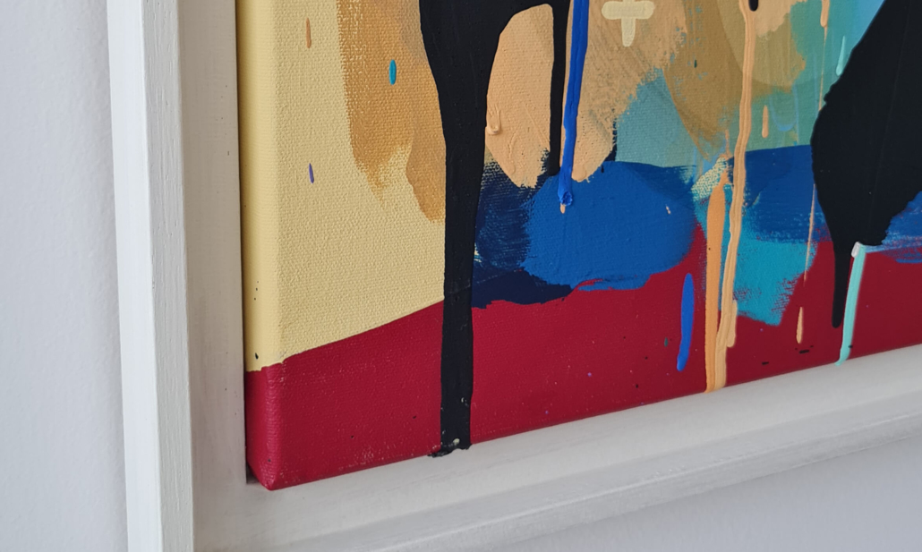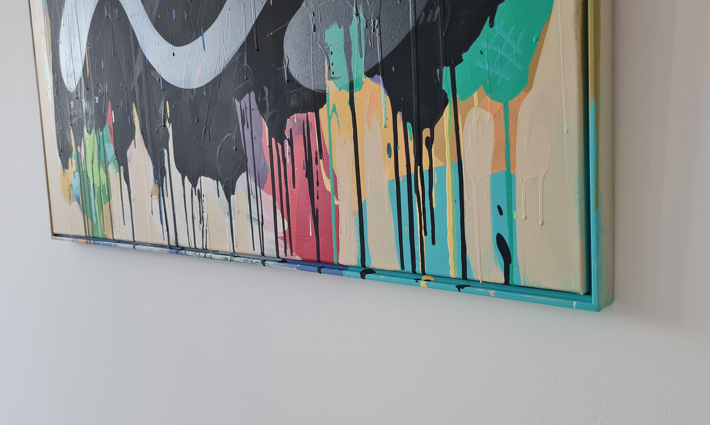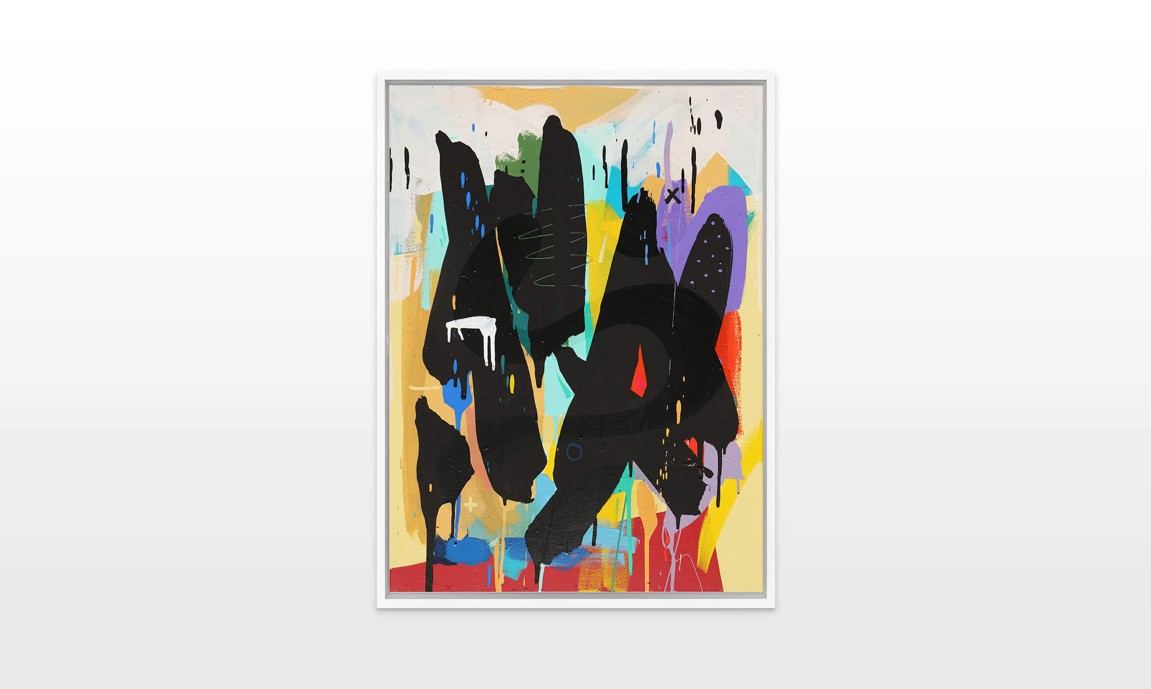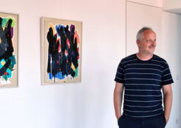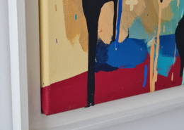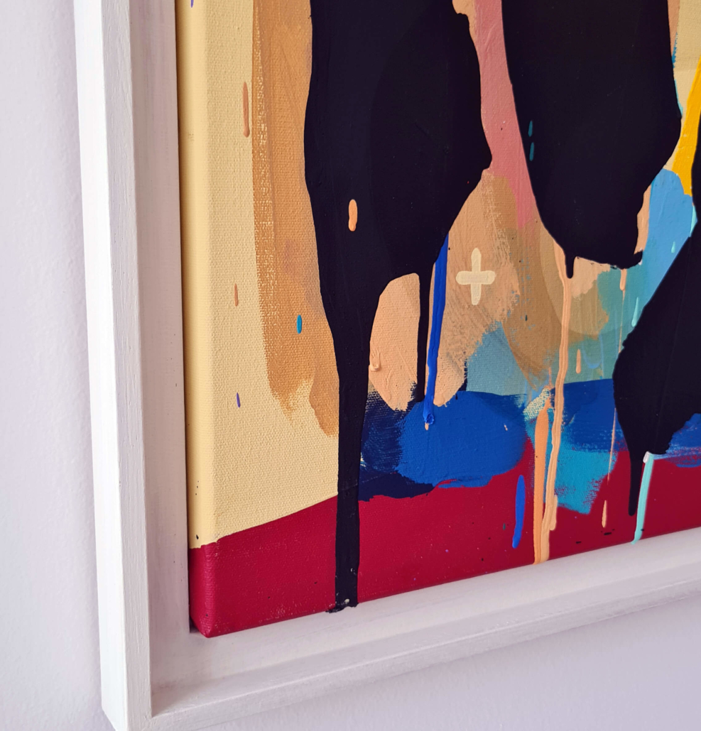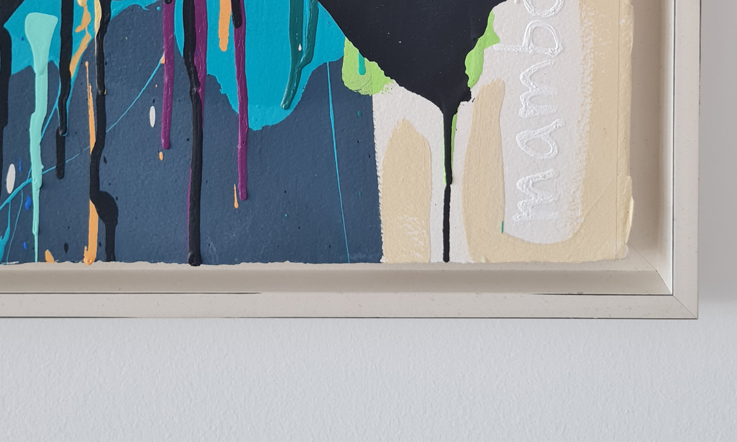 Mambo has gathered these pieces along several years, since his first studio in Los Angeles in 2011. He started to repaint and so to say “recycle“ artworks from the Humans and Brainology series, which did not feel complete and satisfying to him. The decision to do “something else” with it, slowly grew into a concept based on black painted gestures, which were covering colors, shapes and figures. This sharp intervention created a subtle interplay between joy and seriousness. Once the black paint was applied, the initially colorful and energetic artworks, expanded into a whole different dimension. They revive a fresh dynamic and nevertheless they contain fractions of their first life.