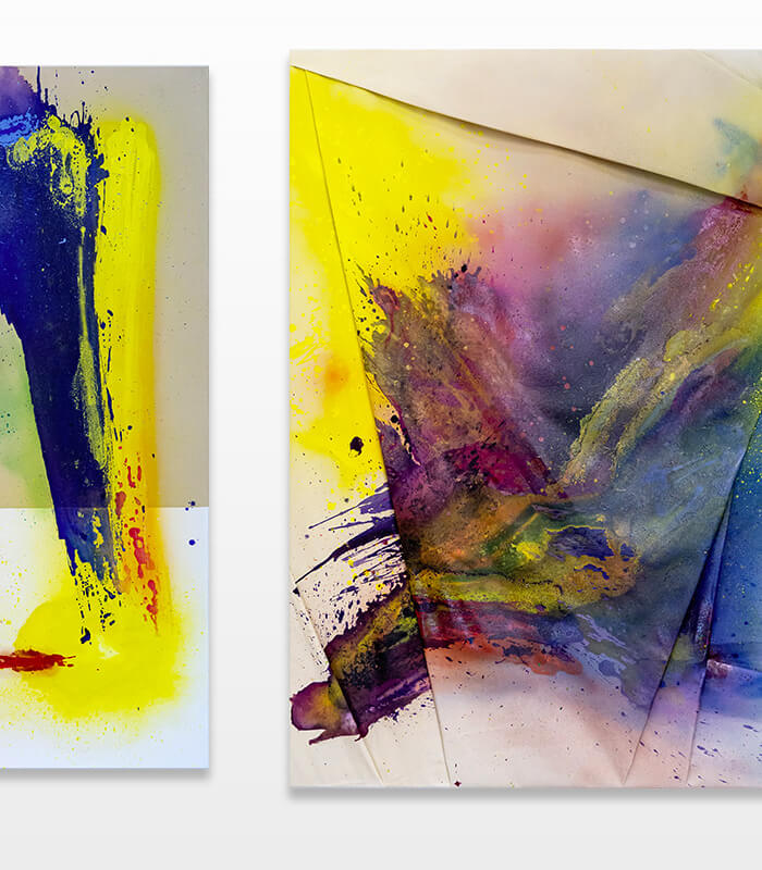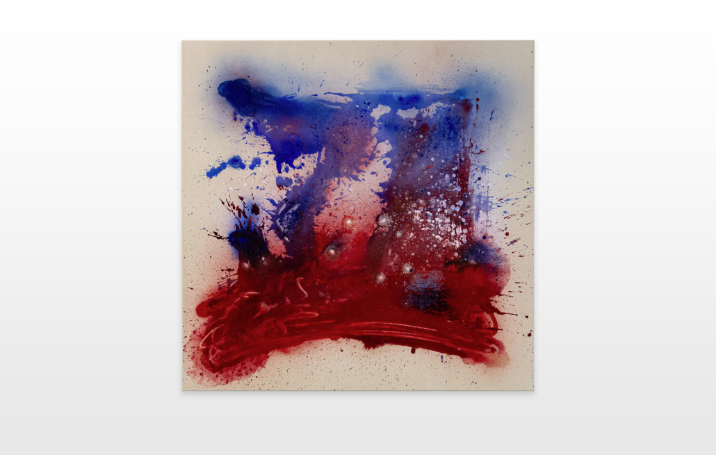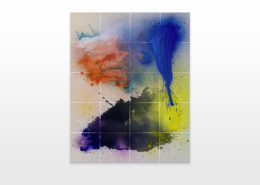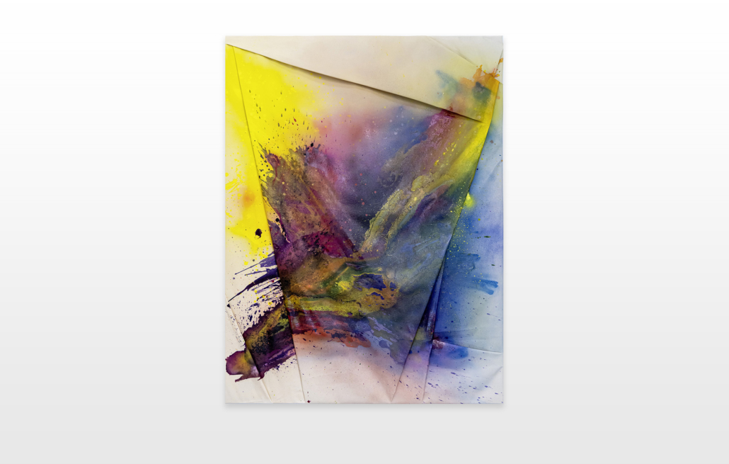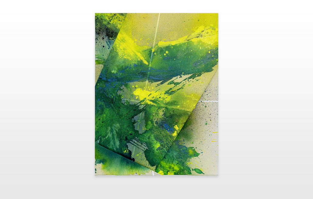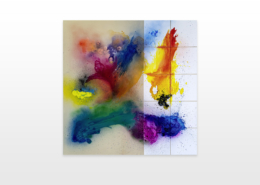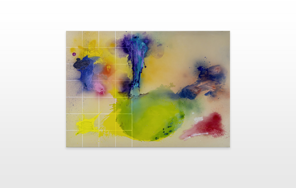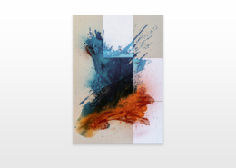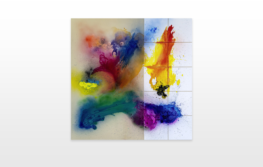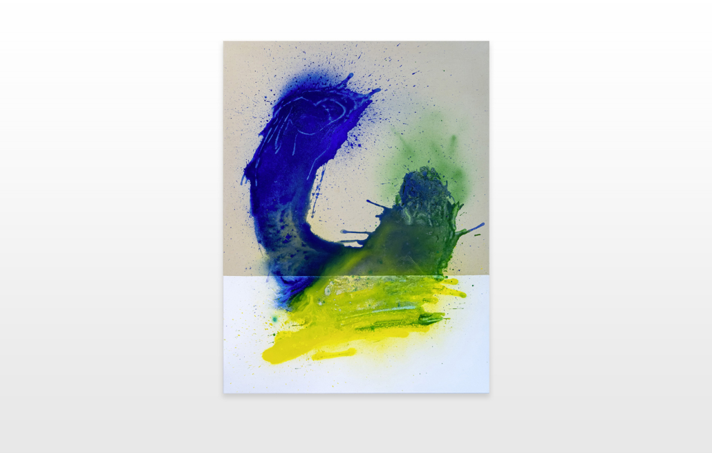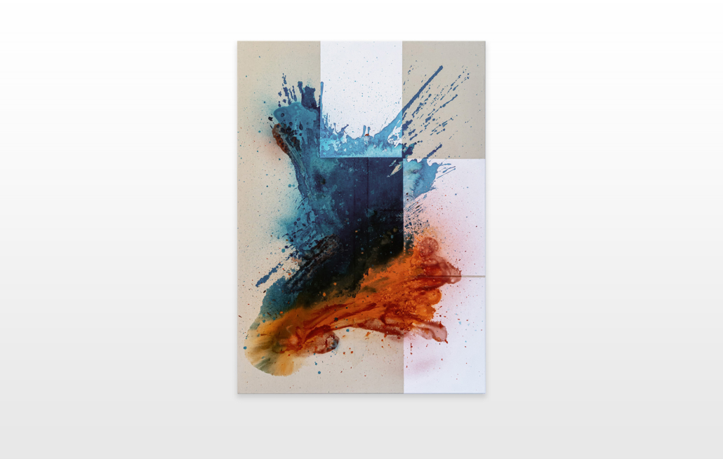 Moses & Taps™’s most recent artworks are increasingly detached from the representational, not only on an intellectual-conceptual level, but also on a visual-aesthetic level. While the works of this series might appear similar to „SPLASH™“, they are conceptually more differentiated. After Moses & Taps™’s breakout through „SPLASH™“, they have learned to master the seemingly uncontrollable technique and utilize it to create. The artworks on view represent the juxtaposition of coincidence and order, creating a shift between foreground and background through the differently coated surfaces. This concept is reinforced by the geometric order of the rectangular canvas and the coated surfaces, but more importantly by the interaction and reaction of different paints, dissolvent and its varying background. This results not in a randomly created amorphous form, but in compositionally arranged painting.