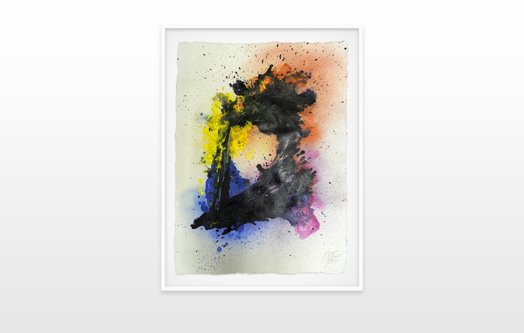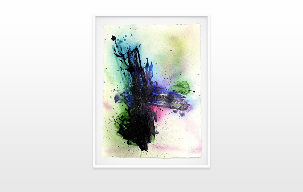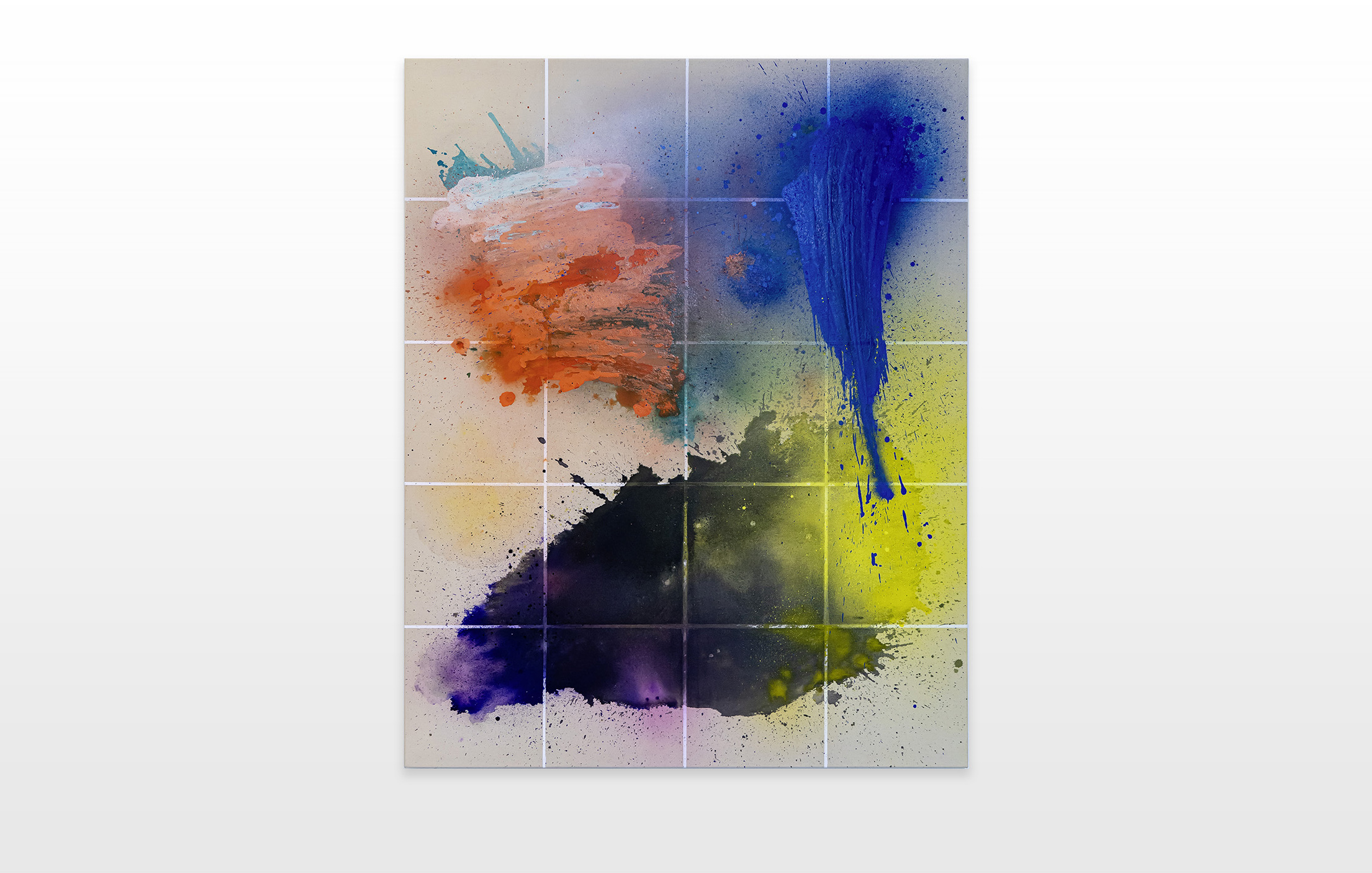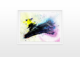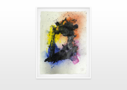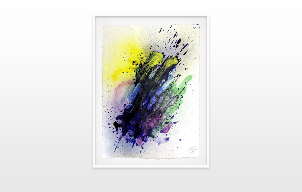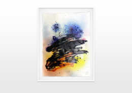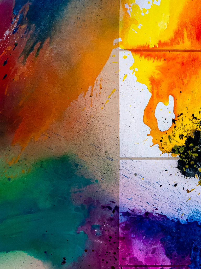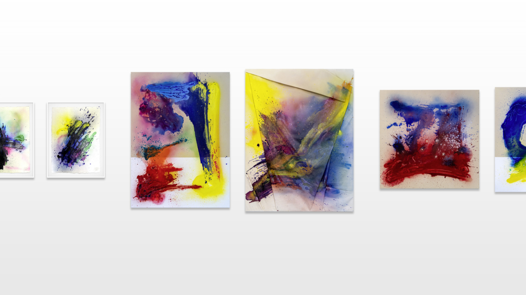Moses & Taps™’s most recent artworks are increasingly detached from the representational, not only on an intellectual-conceptual level, but also on a visual-aesthetic level. While the works of this series might appear similar to „SPLASH™“, they are conceptually more differentiated. After Moses & Taps™’s breakout through „SPLASH™“, they have learned to master the seemingly uncontrollable technique and utilize it to create. The artworks on view represent the juxtaposition of coincidence and order, creating a shift between foreground and background through the differently coated surfaces. This concept is reinforced by the geometric order of the rectangular canvas and the coated surfaces, but more importantly by the interaction and reaction of different paints, dissolvent and its varying background. This results not in a randomly created amorphous form, but in compositionally arranged painting.
