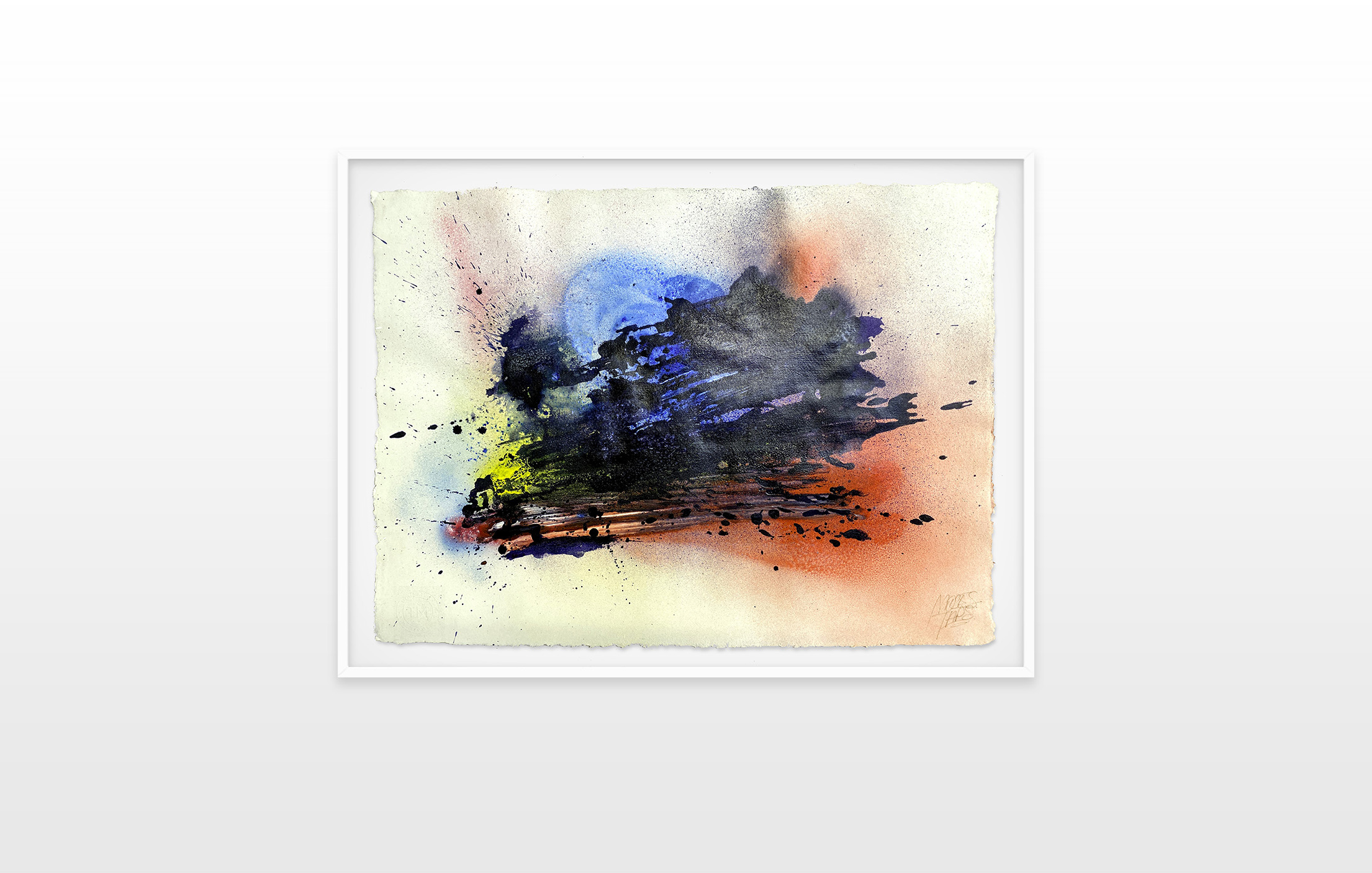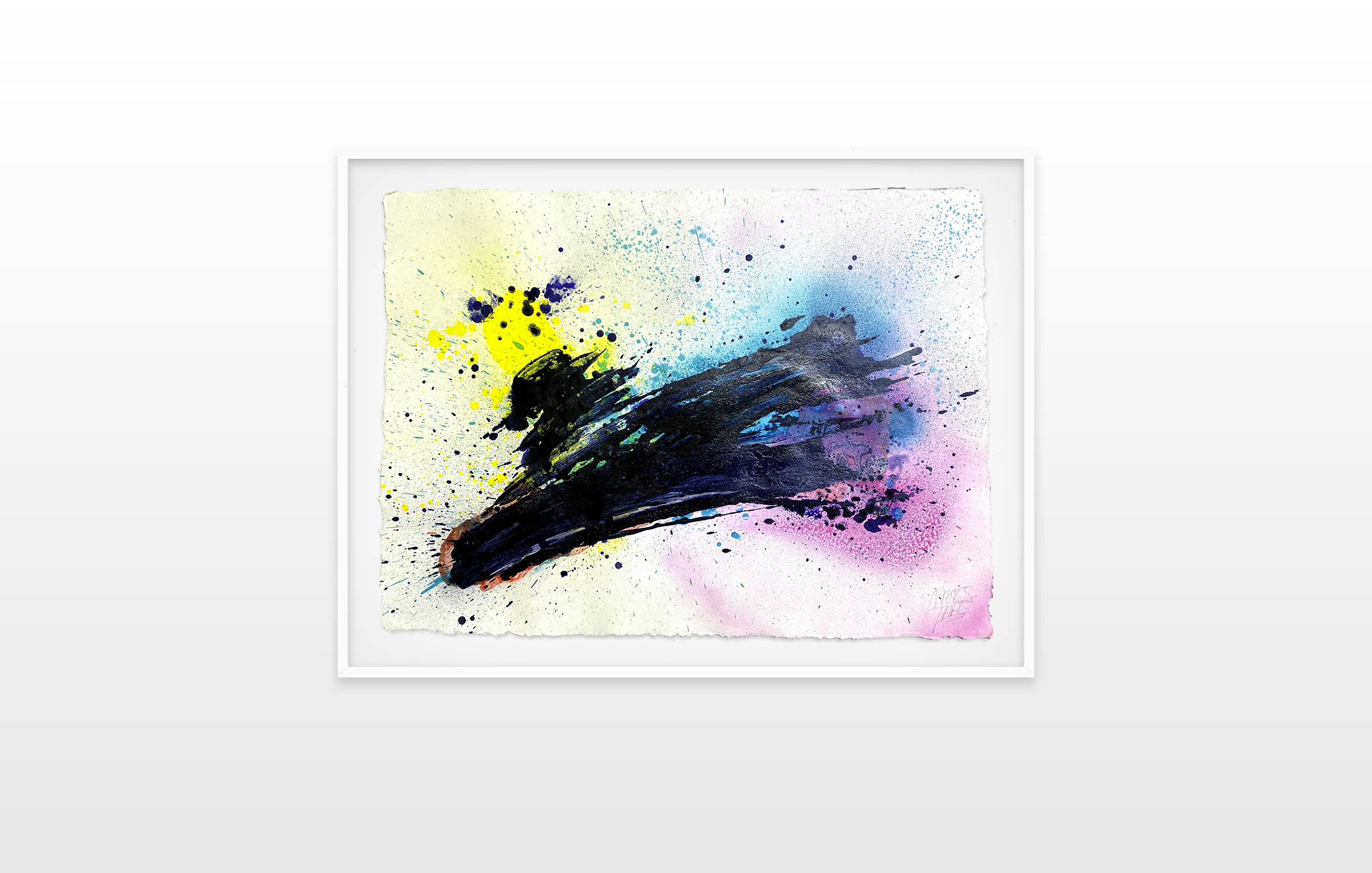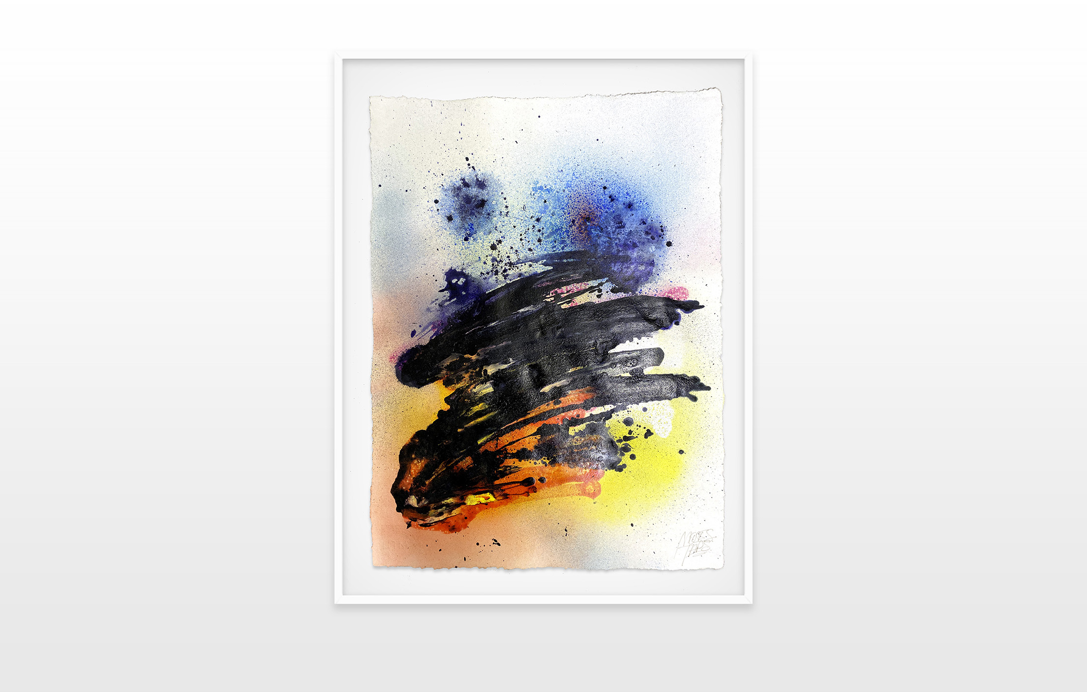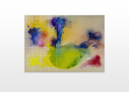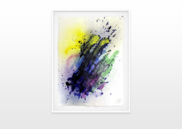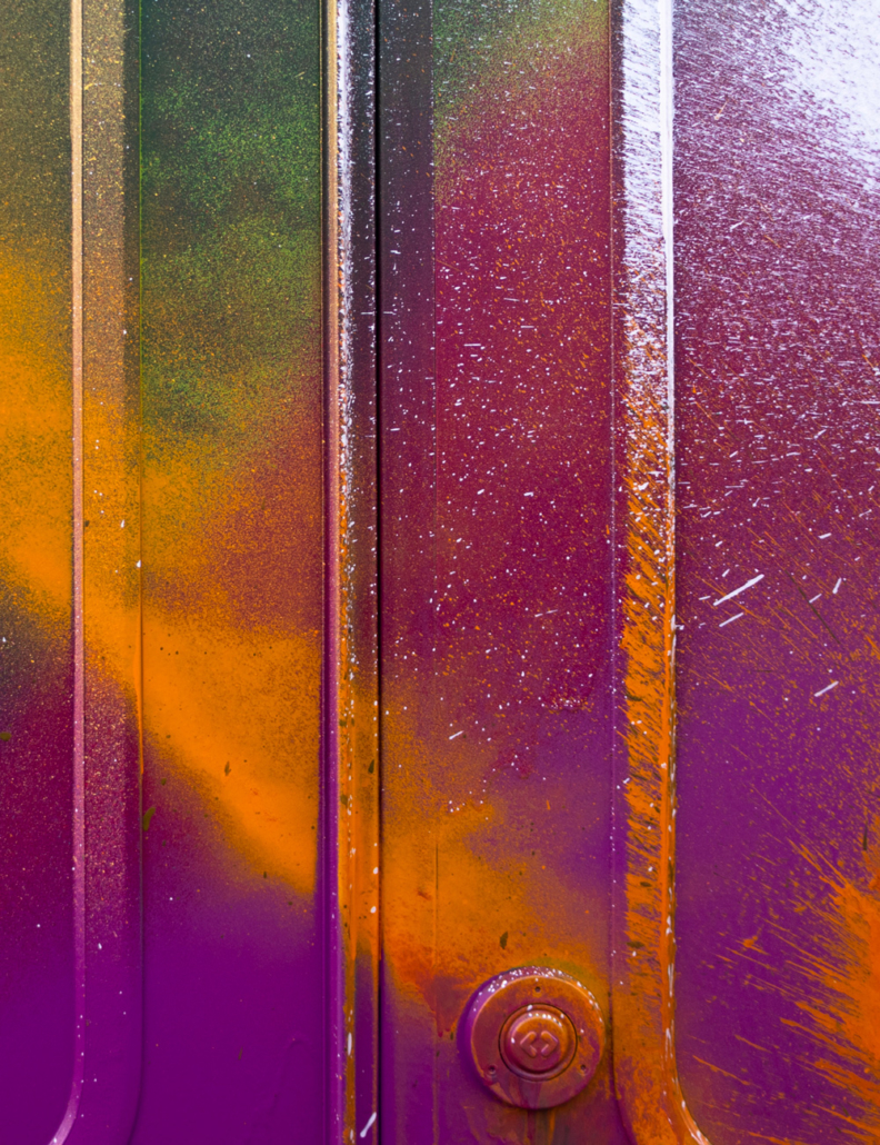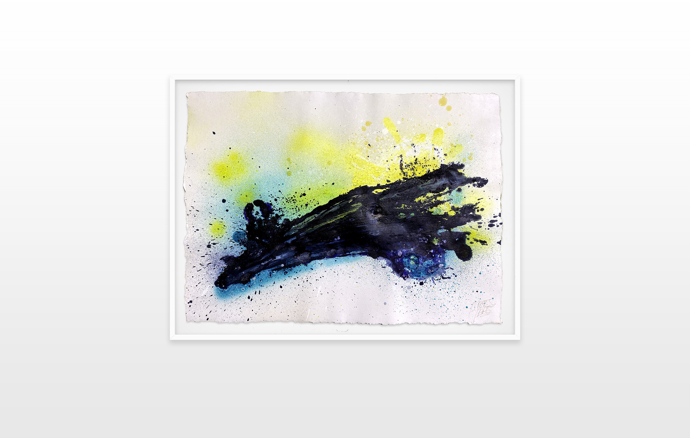 Moses & Taps™’s most recent artworks are increasingly detached from the representational, not only on an intellectual-conceptual level, but also on a visual-aesthetic level. While the works of this series might appear similar to „SPLASH™“, they are conceptually more differentiated. After Moses & Taps™’s breakout through „SPLASH™“, they have learned to master the seemingly uncontrollable technique and utilize it to create. The artworks on view represent the juxtaposition of coincidence and order, creating a shift between foreground and background through the differently coated surfaces. This concept is reinforced by the geometric order of the rectangular canvas and the coated surfaces, but more importantly by the interaction and reaction of different paints, dissolvent and its varying background. This results not in a randomly created amorphous form, but in compositionally arranged painting.