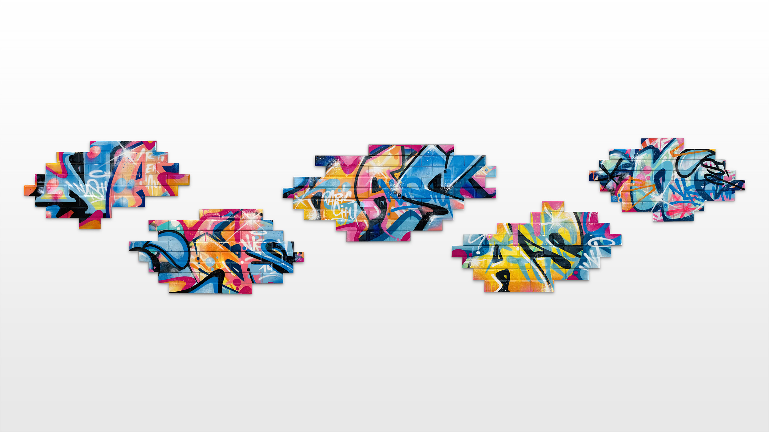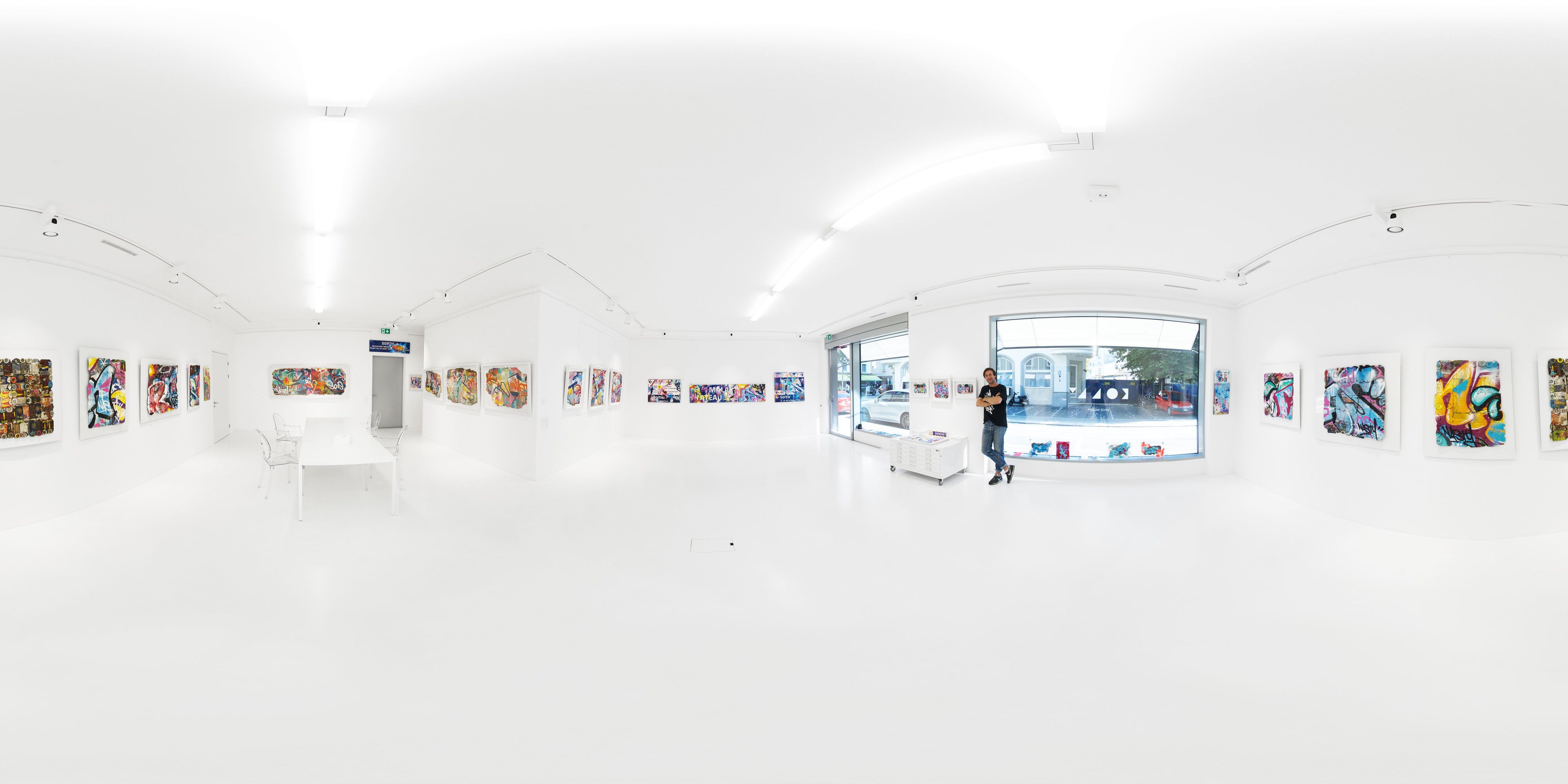 Nasty found his creativity especially in spraying metro plans and ceramic tiles from Parisian subways. Thus he gave the streets, trains and subways some new calligraphic style and colorful life. His style is characterized by bright colors, as pink, purple or blue, to break the boring gray or white of the public buildings. To interrupt the monotony of urban walls his throw ups diverge from the vertical as well as the horizontal construction dimensions of the walls. Therefore passengers recognizes his distinctive style in his throw ups. Still using the classical materials such as metro maps, signs, tiles and flat pressed spray cans and his notorious calligraphic lettering he keeps the graffiti spirit alive and yet comes up with new as well as unique pieces.