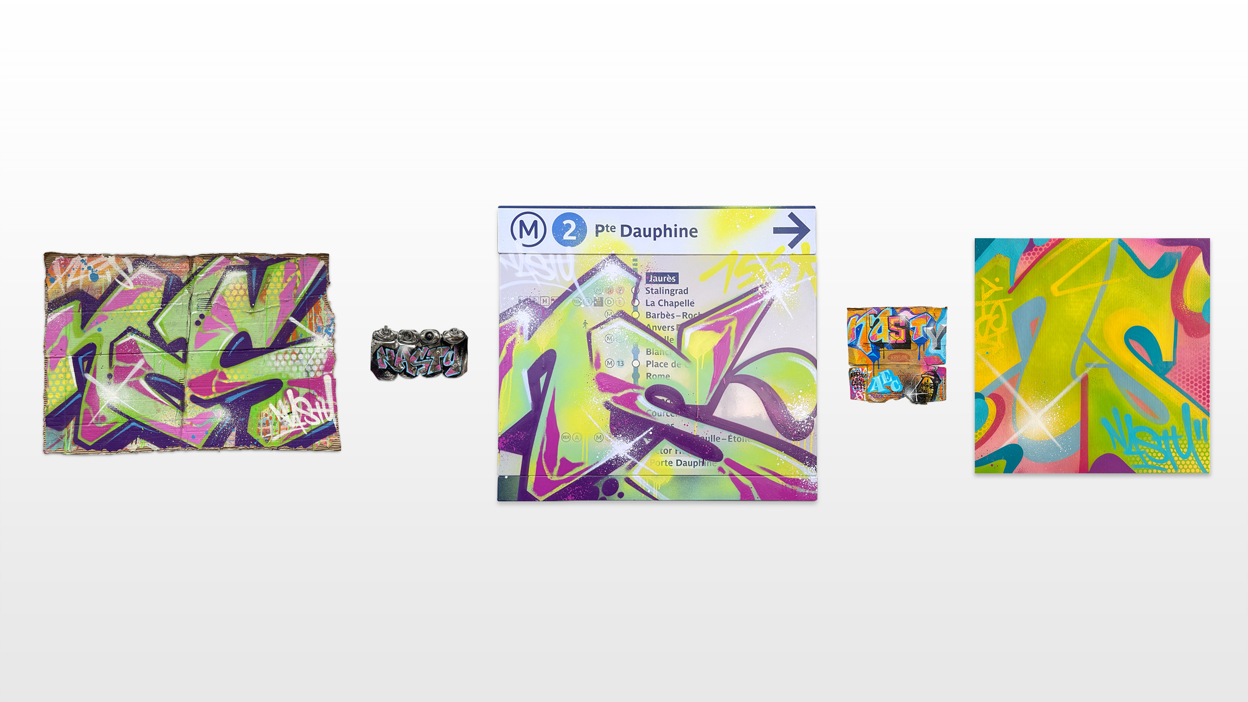 Soon Nasty noticed that he always preferred and practiced more „artistic vandalism“ that the act of vandalism itself. Therefore Nasty began to kidnapped outdated or unused subway signs, which he transformed into artful objects using his spray cans and his particular lettering style. His artistic work since 1988 was recorded in the Book “Nasty and Slice, Artists On The Run”. 2009 the cultural channel Arte has produced a documentary of the Nasty’s work on the streets of Paris. So far prestigious galleries and institutions have exposed his work, as for example Danisz Magda Gallery, Palais de Chaillot, the Galerie Hélène Bailly, the Grand Palais or the Musée en Herbe.