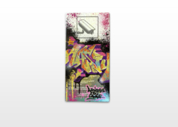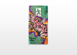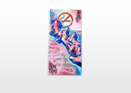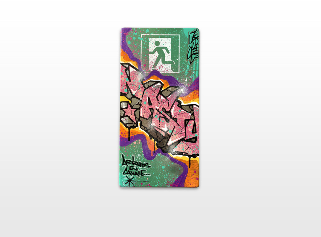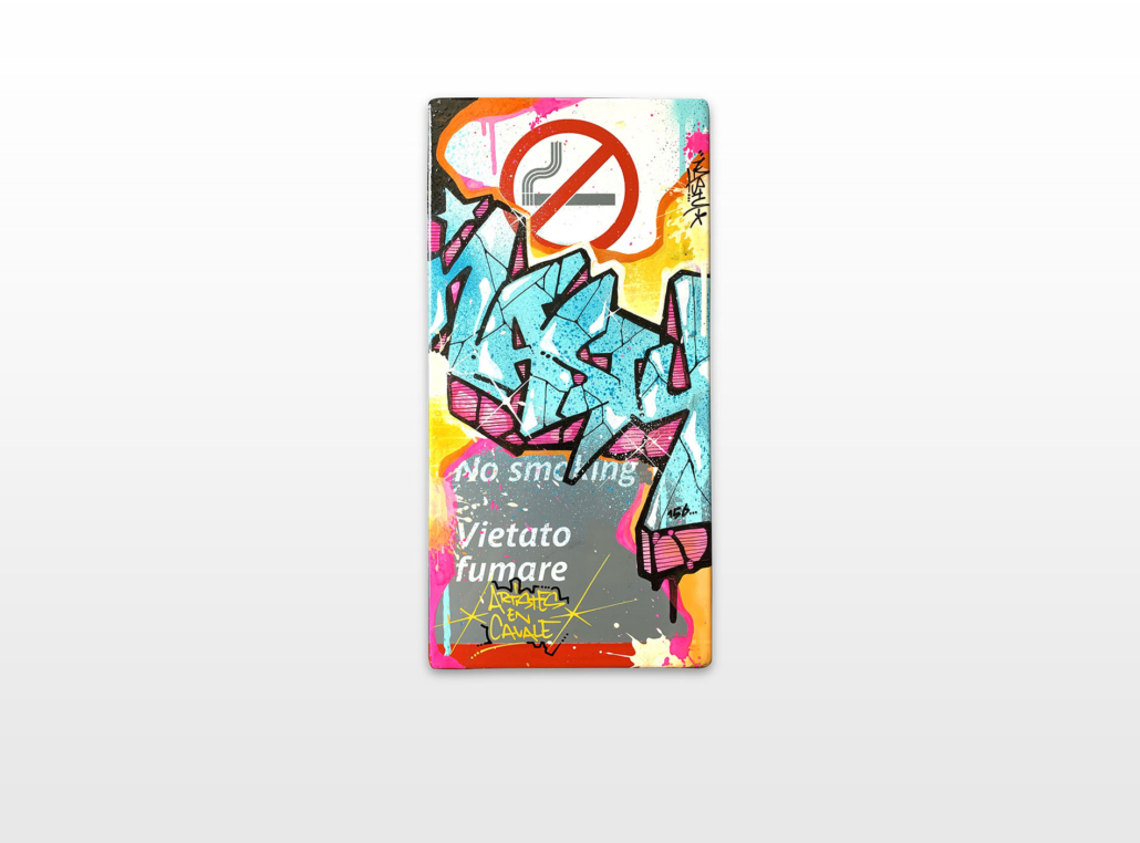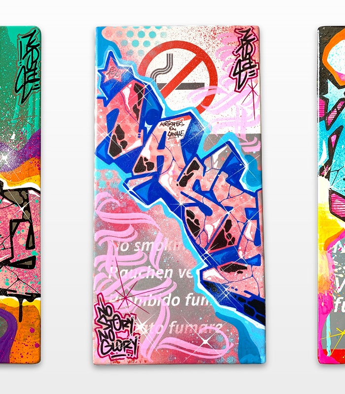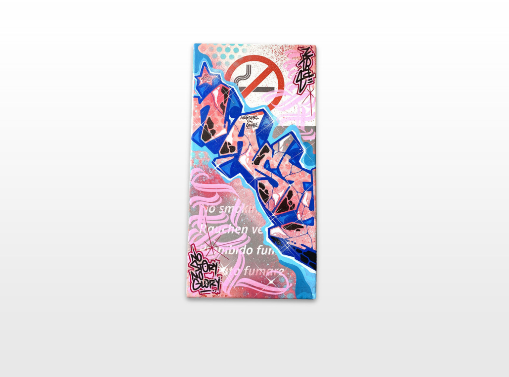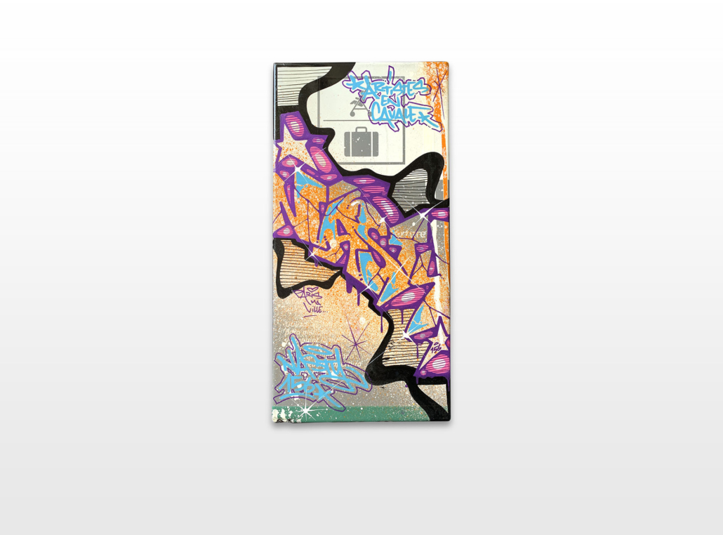 Nasty found his creativity especially in spraying metro plans, aluminum plates and ceramic tiles from Parisian subways. Thus he gave the streets, trains and subways new calligraphic style and a colorful life. His style is characterized by bright colors, as pink, purple or blue, to break the boring gray or white of the public buildings. His longstanding dedication to graffiti as a form of expression is a central element of his oeuvre. He contrasts the urban, wild and unrestrained energy and aesthetic of the streets with the sometimes rigid and cold walls of art institutions.