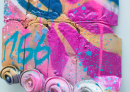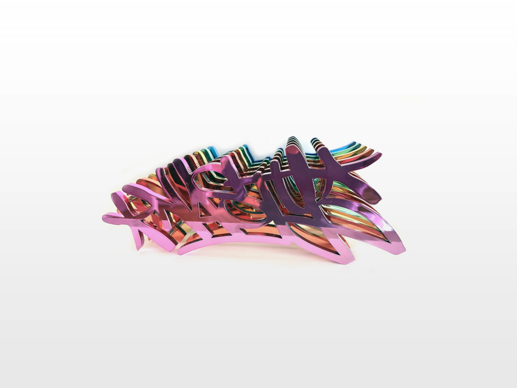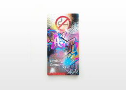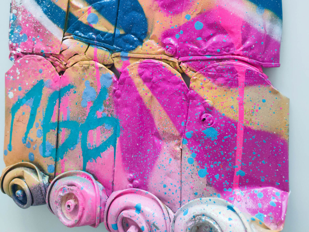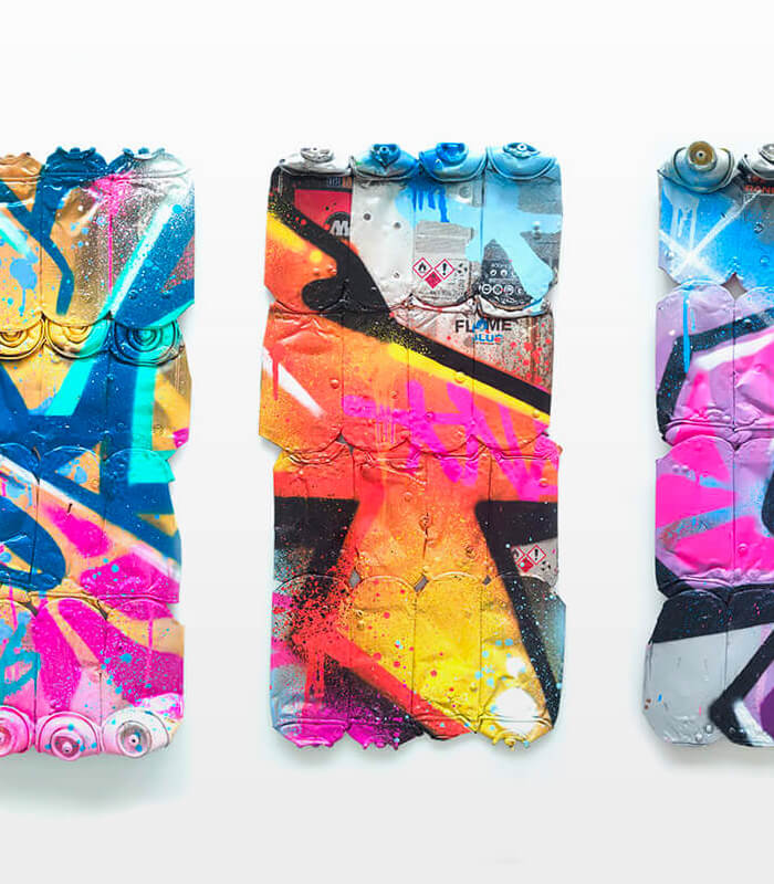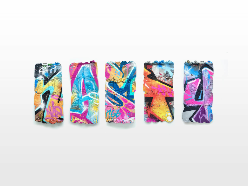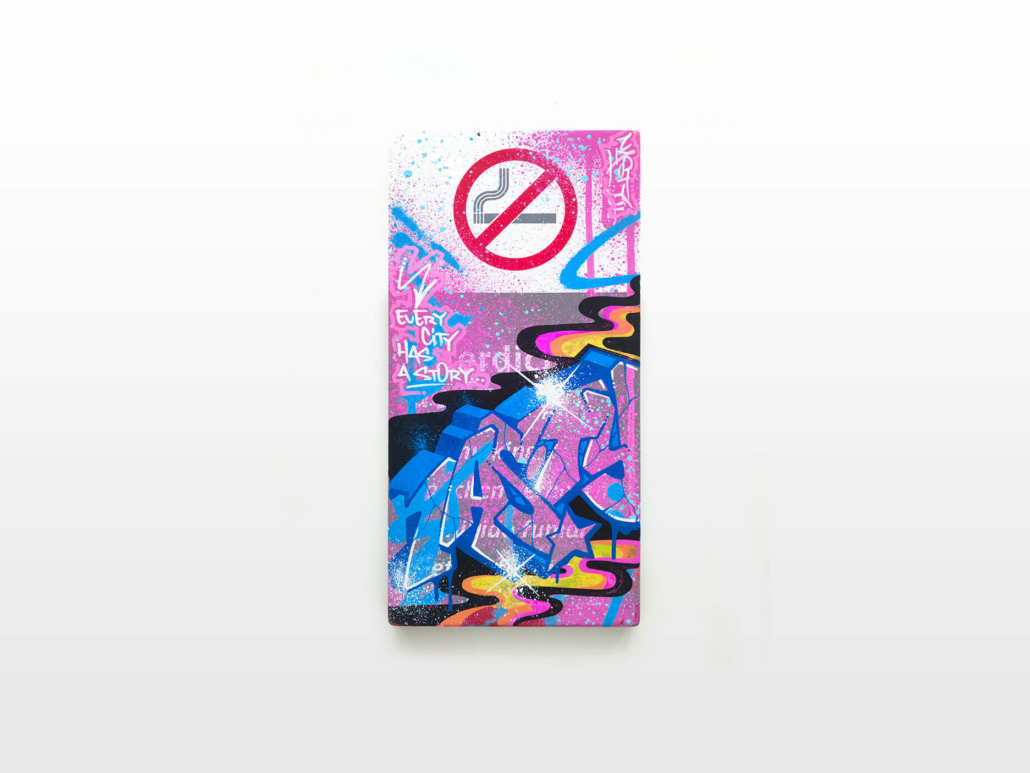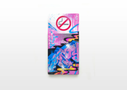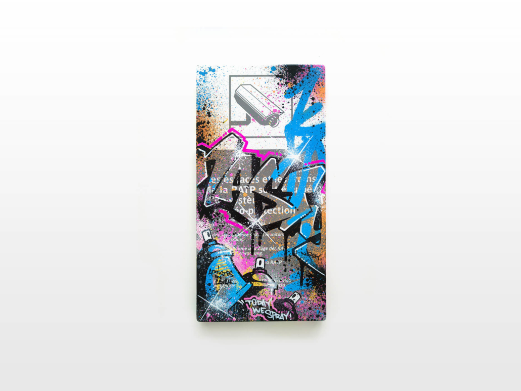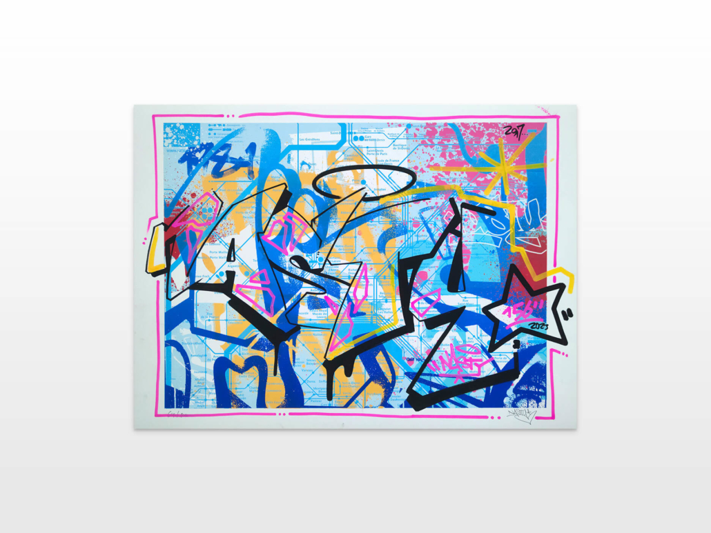 In the current exhibition you can find iconic series that Nasty established throughout his career. The artist began to kidnap outdated or unused subway signs, which he transformed into artful objects using his spray cans and his particular lettering style. In addition, he found his creativity especially in spraying metro plans from Parisian subways. Thus he gave the streets, trains and subways some new calligraphic style and colorful life. From early on Nasty recognized the high potential of the spray can as the ideal object for re- and up-cycling, but at the same time he knew how to turn the presumed leftover of graffiti into a nostalgic cultural asset and piece of history. Who knew that spray cans would develop into iconic symbols and insignia representing the graffiti art movement? Still using the classical materials such as metro maps, signs, tiles and flat pressed spray cans and his notorious calligraphic lettering he keeps the graffiti spirit alive and yet comes up with new as well as unique pieces.