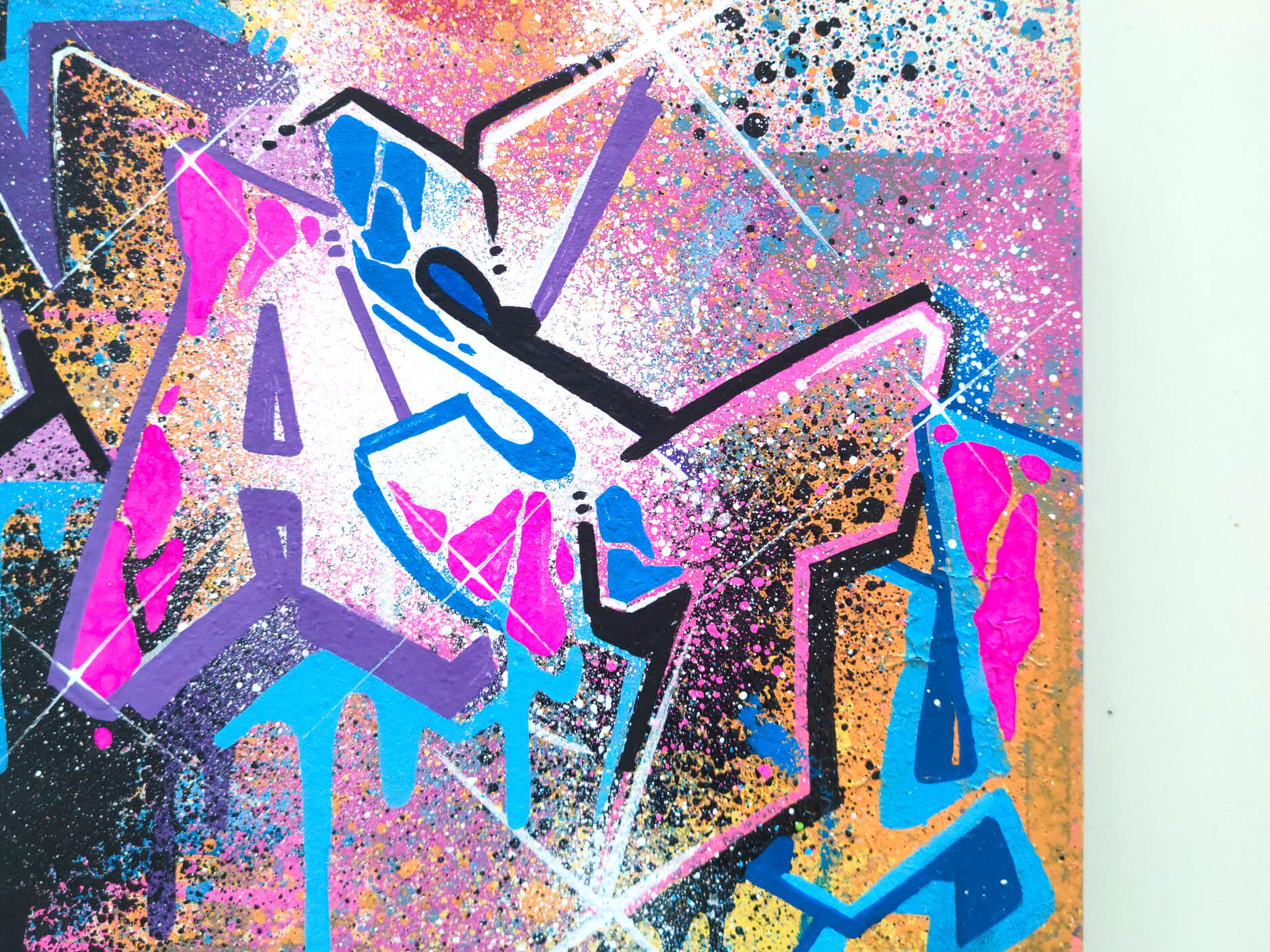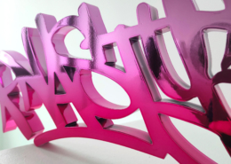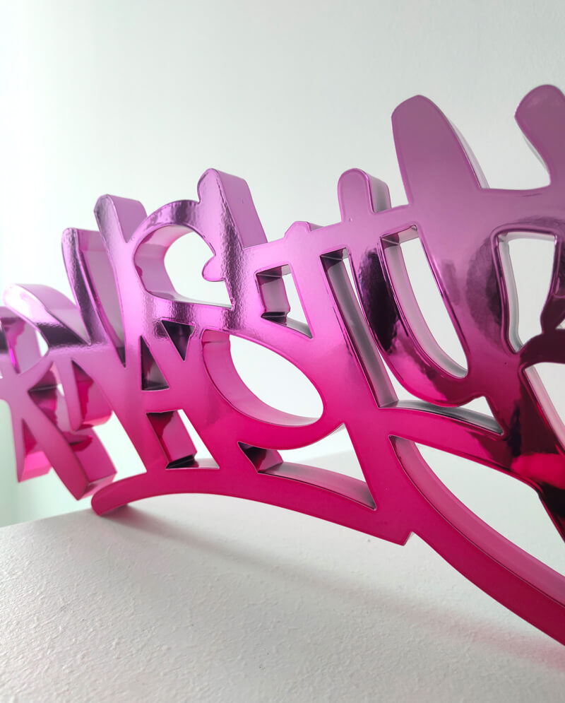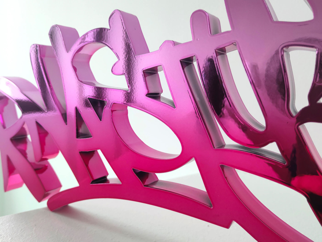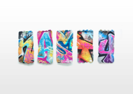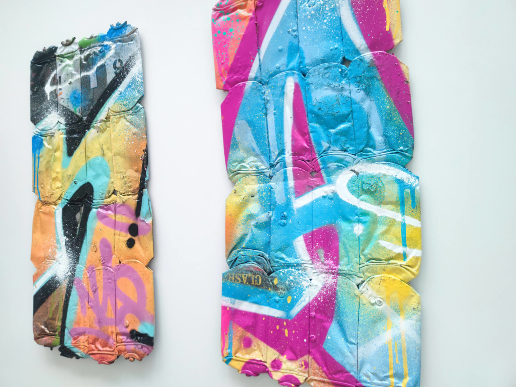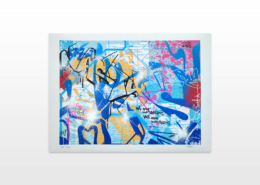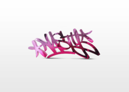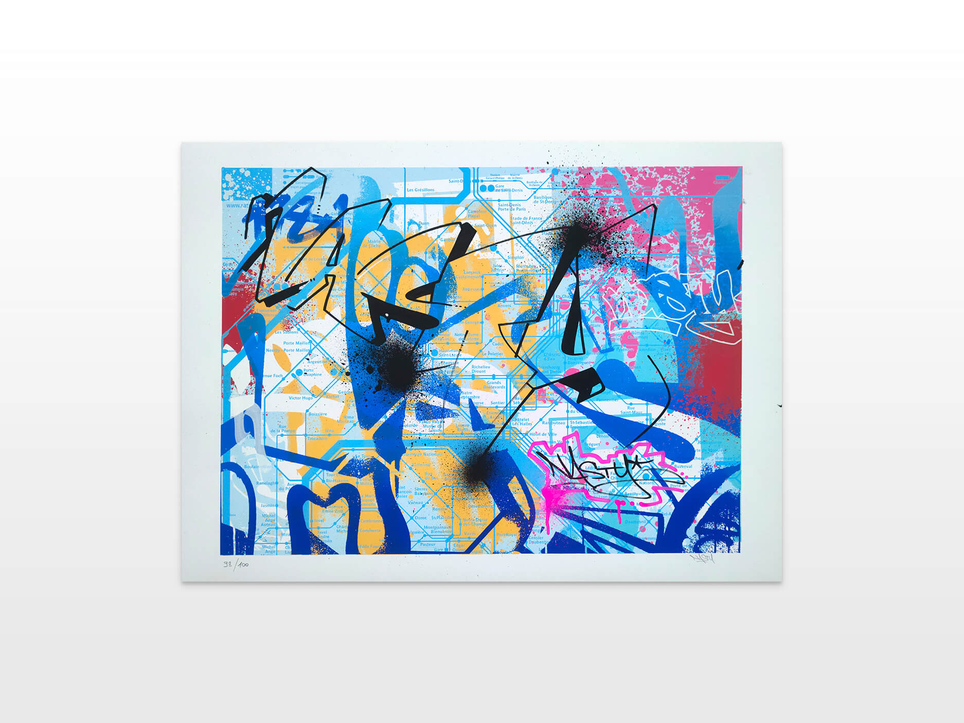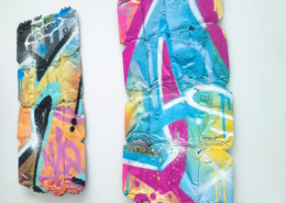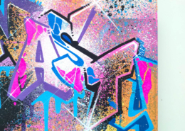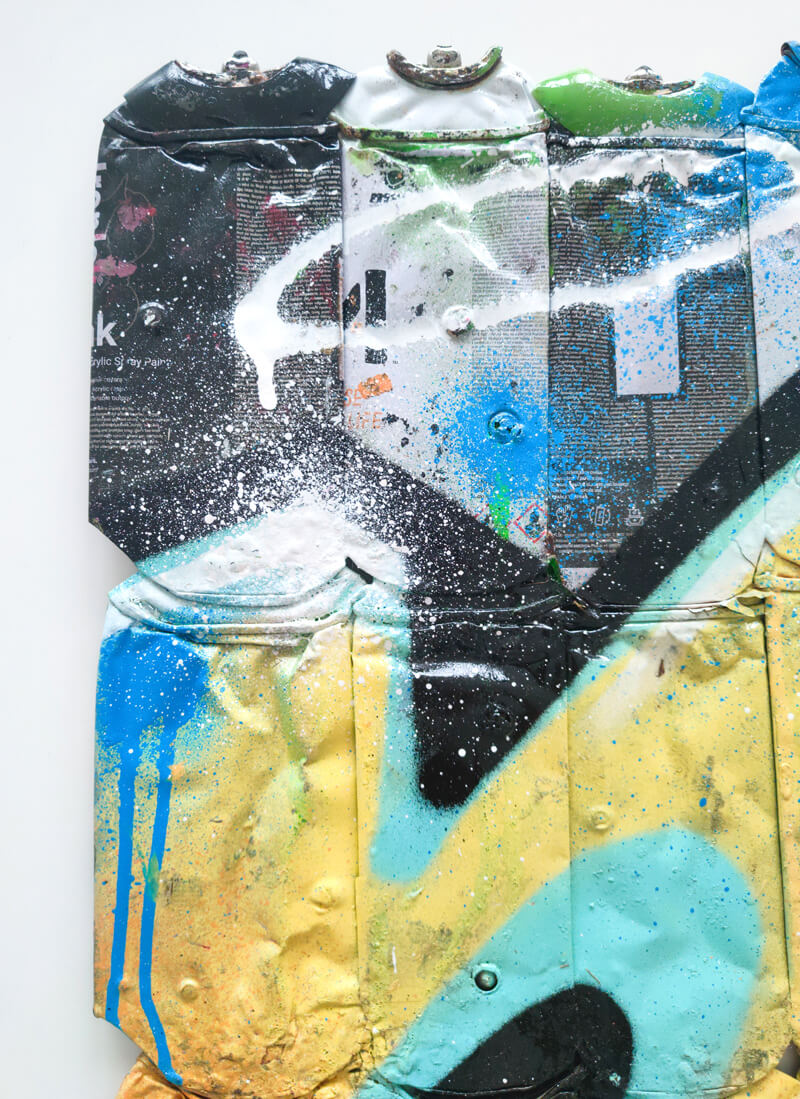 In the current exhibition you can find iconic series that Nasty established throughout his career. The artist began to kidnap outdated or unused subway signs, which he transformed into artful objects using his spray cans and his particular lettering style. In addition, he found his creativity especially in spraying metro plans from Parisian subways. Thus he gave the streets, trains and subways some new calligraphic style and colorful life. From early on Nasty recognized the high potential of the spray can as the ideal object for re- and up-cycling, but at the same time he knew how to turn the presumed leftover of graffiti into a nostalgic cultural asset and piece of history. Who knew that spray cans would develop into iconic symbols and insignia representing the graffiti art movement? Still using the classical materials such as metro maps, signs, tiles and flat pressed spray cans and his notorious calligraphic lettering he keeps the graffiti spirit alive and yet comes up with new as well as unique pieces.