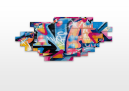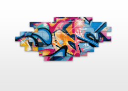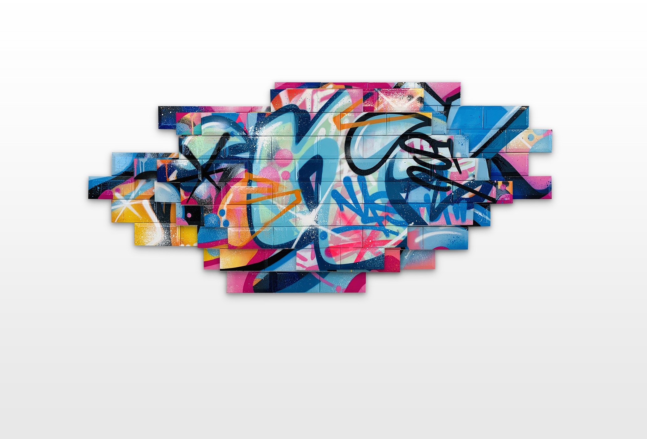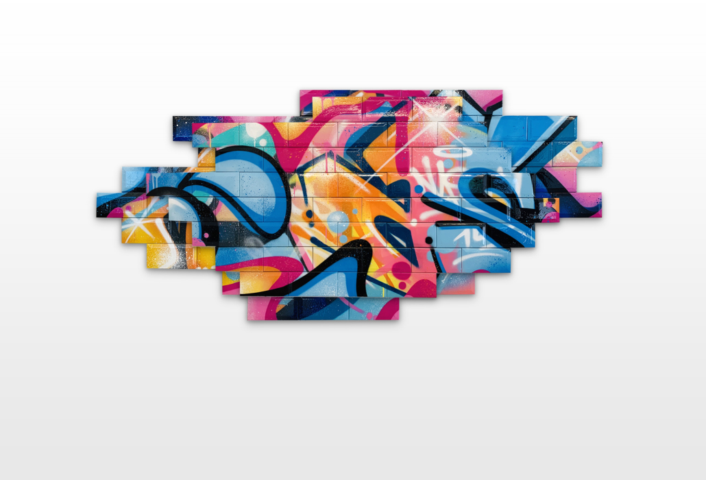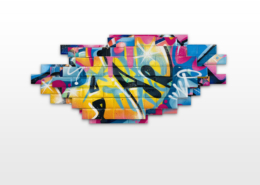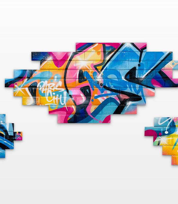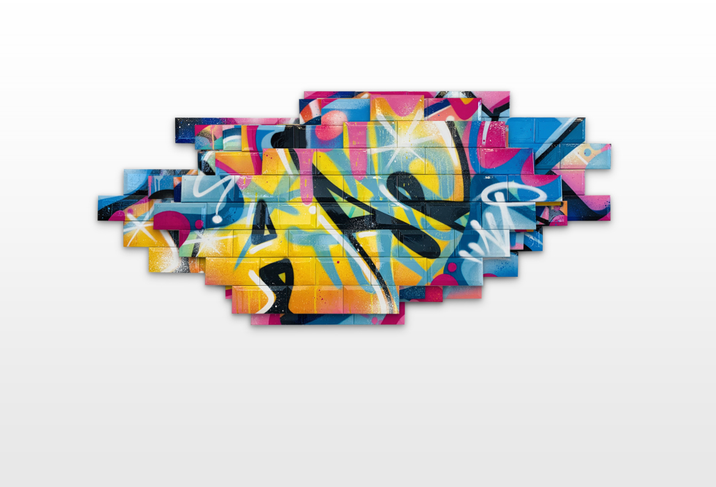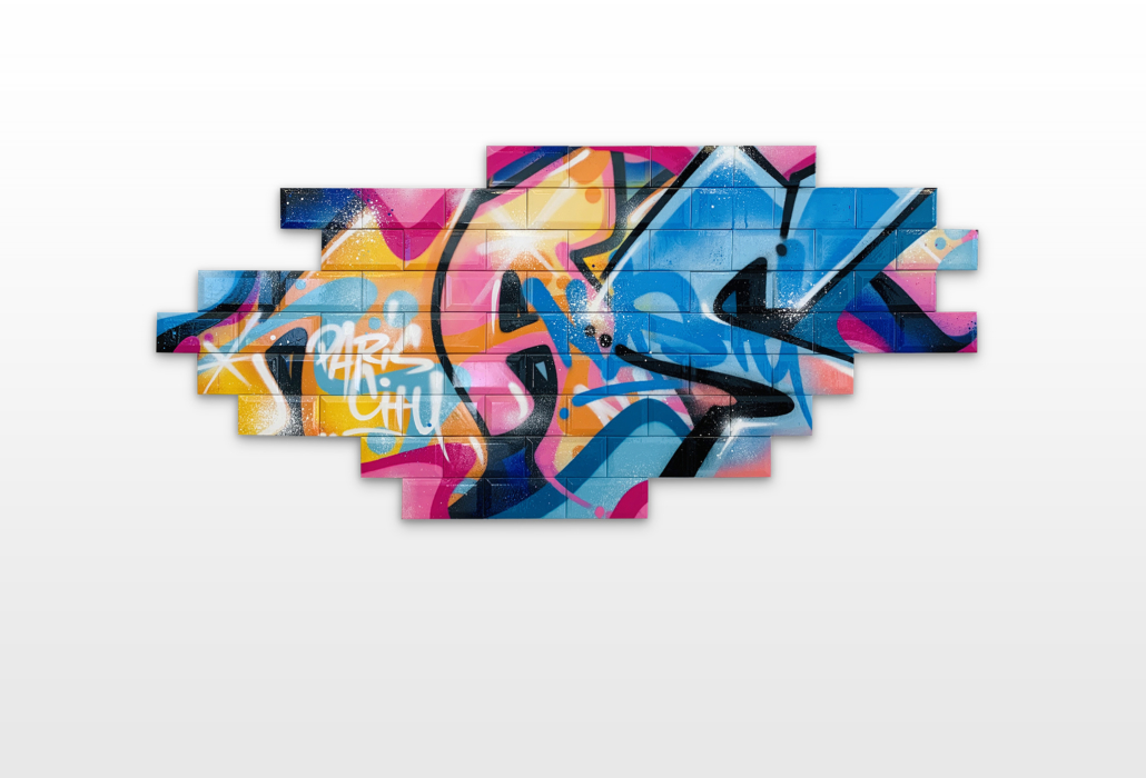 Nasty found his creativity especially in spraying metro plans, aluminum plates and ceramic tiles from Parisian subways. Thus he gave the streets, trains and subways new calligraphic style and a colorful life. His style is characterized by bright colors, as pink, purple or blue, to break the boring gray or white of the public buildings. To interrupt the monotony of urban walls his throw ups diverge from the vertical as well as the horizontal construction dimensions of the walls. Therefore passengers recognizes his distinctive style in his throw ups. Today he is still using the traditional surfaces and materials such as metro maps, signs, tiles and flat pressed spray cans and with his striking calligraphic lettering he keeps the graffiti spirit alive and yet comes up with unique pieces.