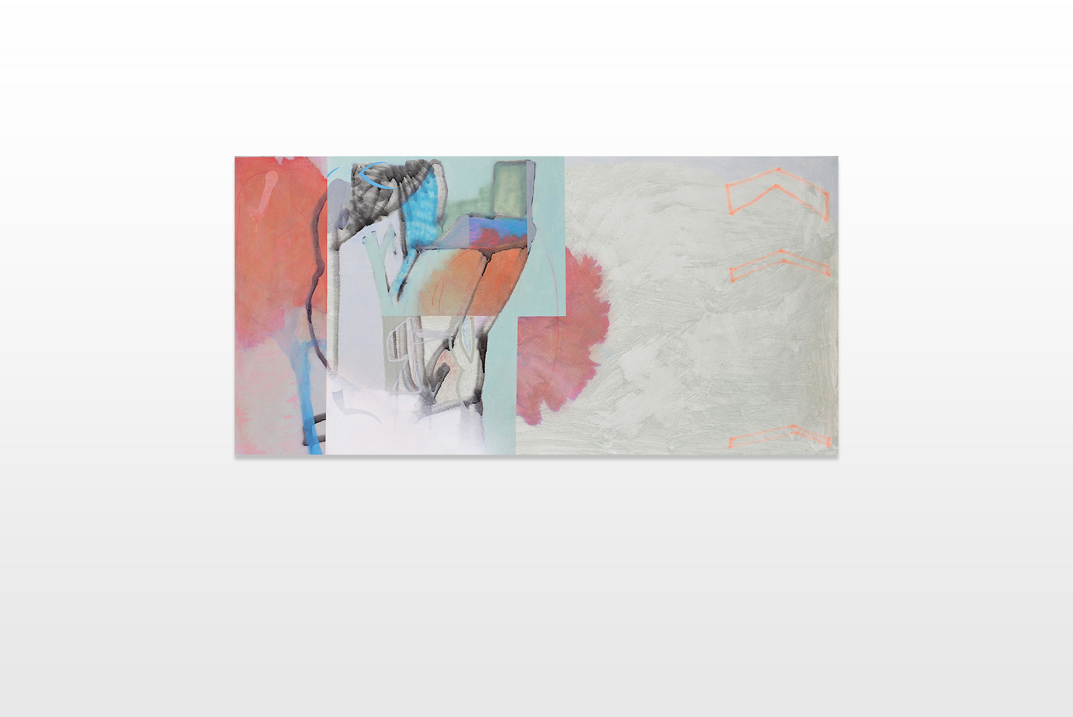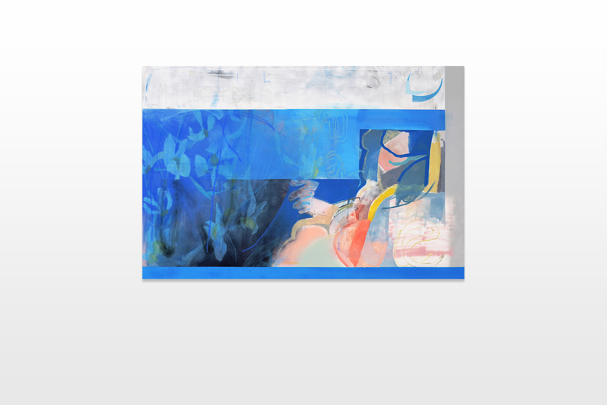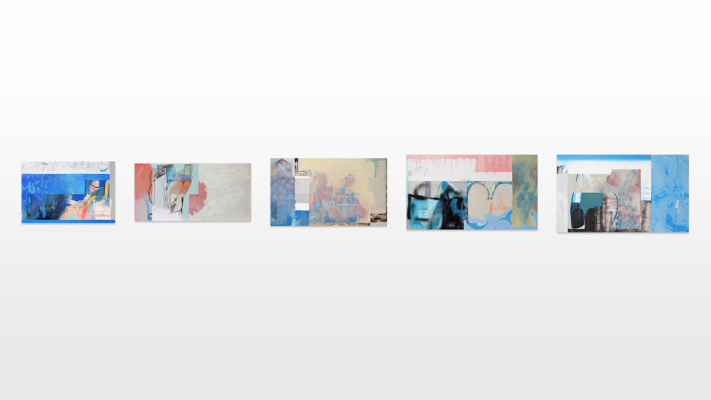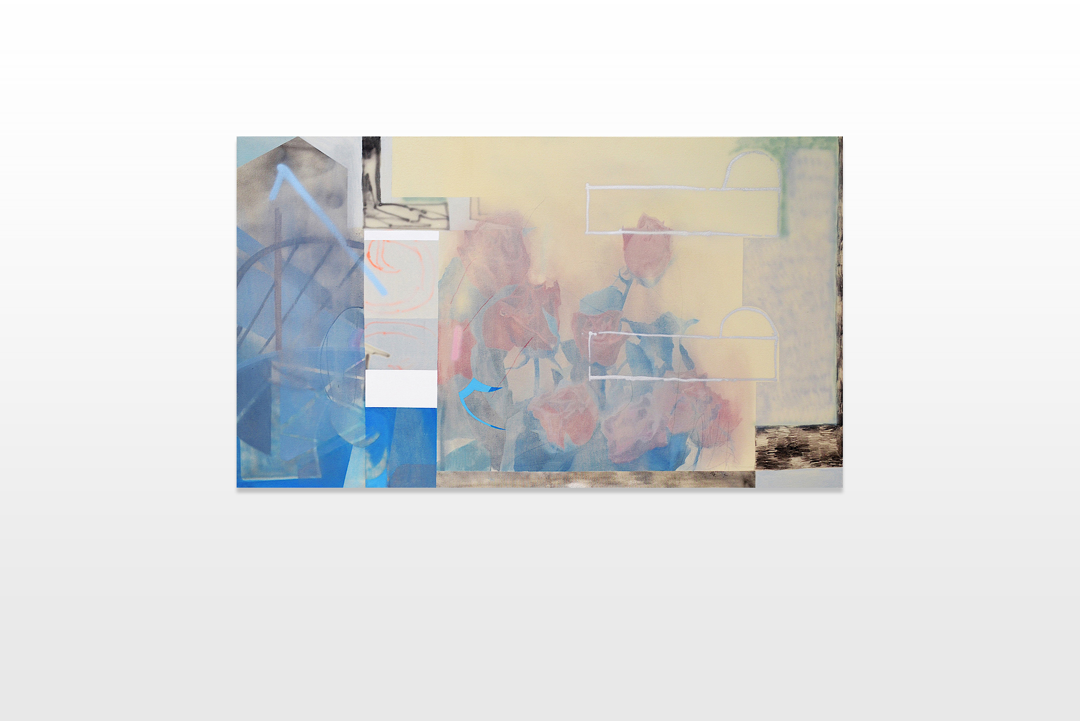 These questions fueled the inspiration and concept for his recent series. Each canvas includes a representation of a dry flower or flower bouquet. These motifs are extended, supplemented or superimposed by geometrical as well as organic colour fields. Furthermore, abstract gestures, textures, clouds and spots of brushes as well as spray cans are recognizable. The artist mostly used calm and attuned colour combinations in order to add a certain softness and atmosphere to the paintings.