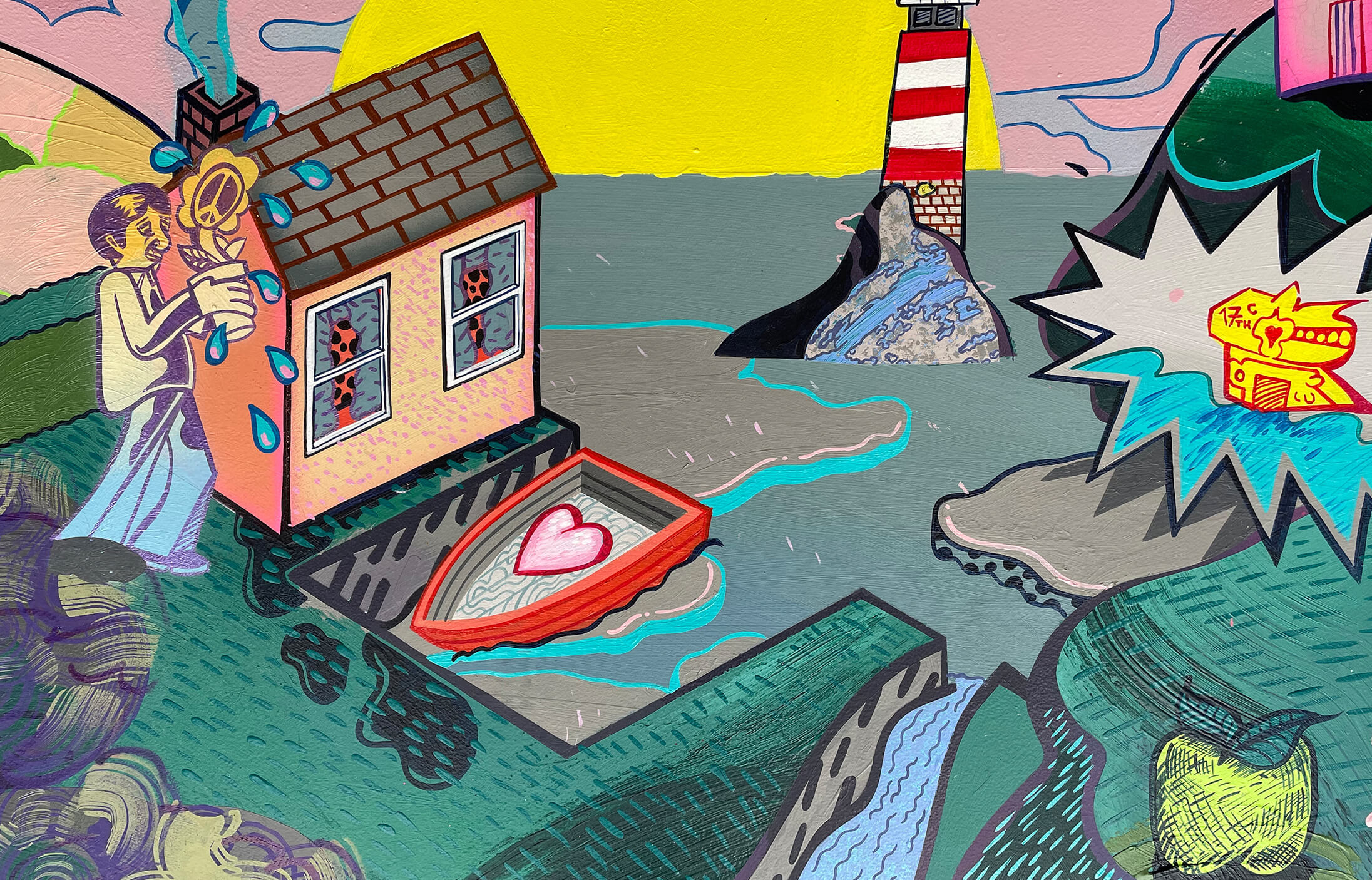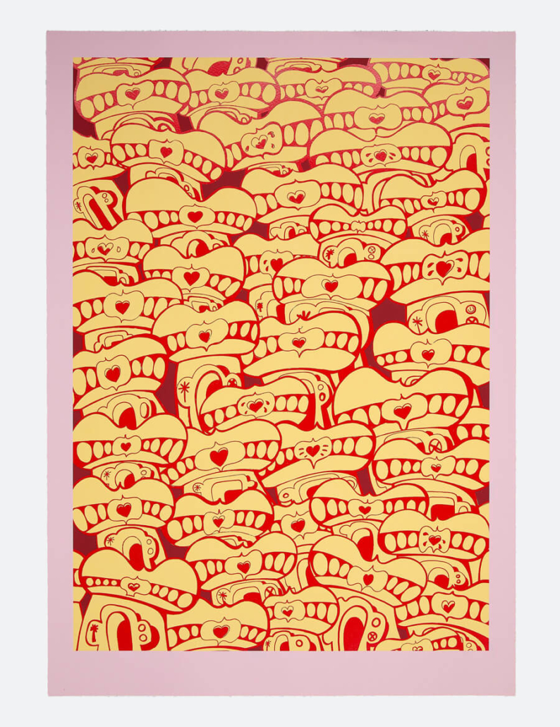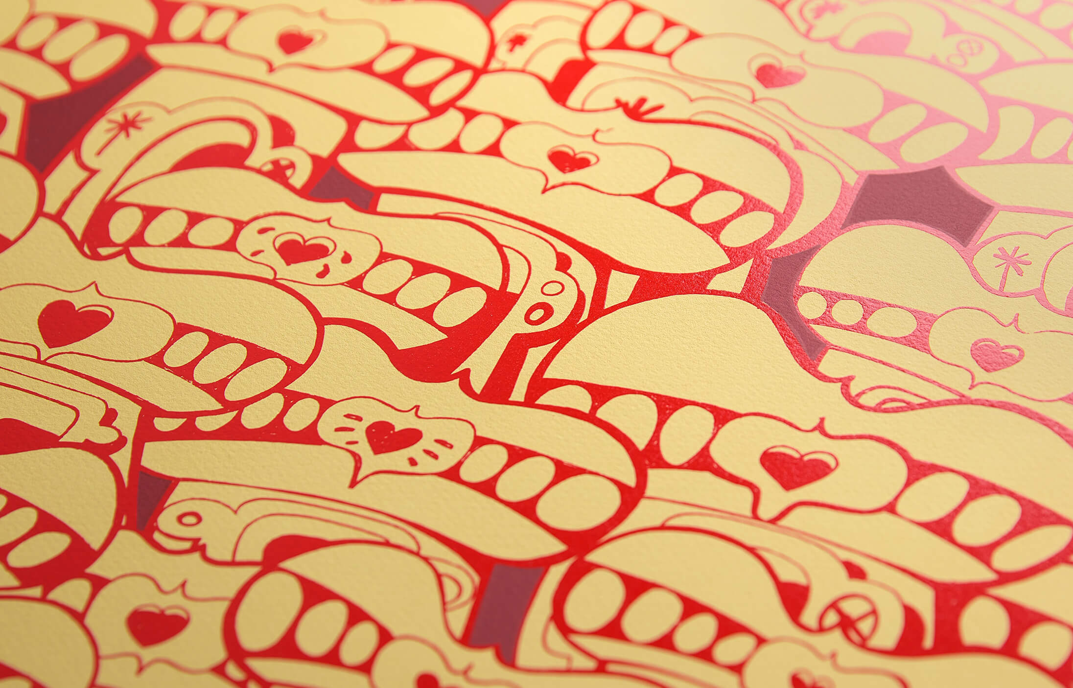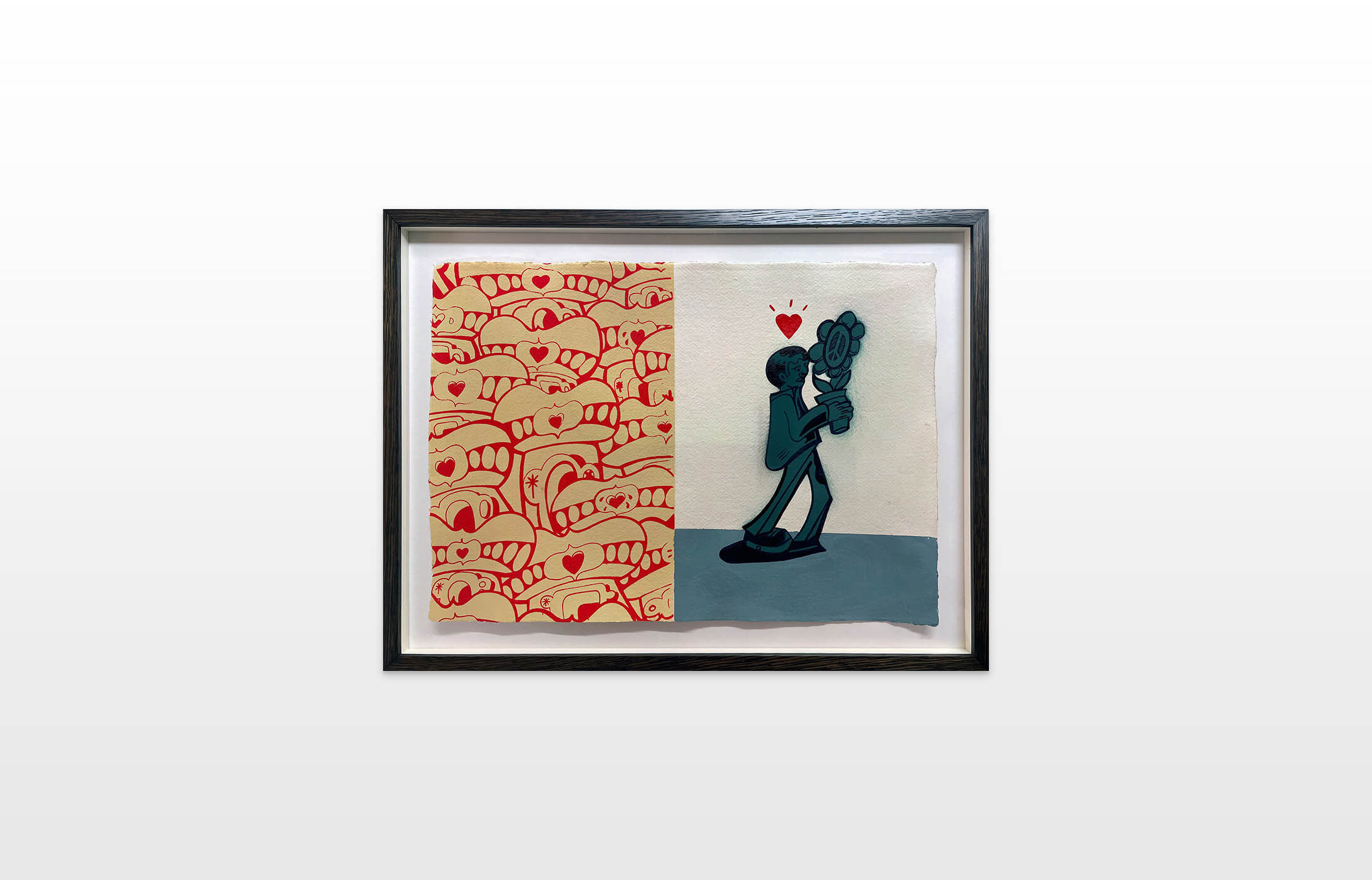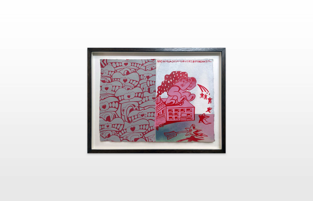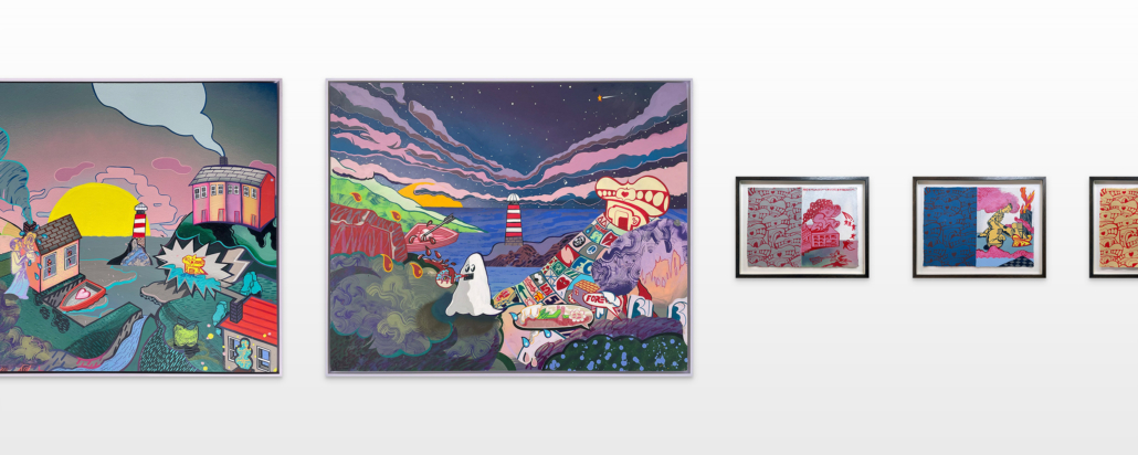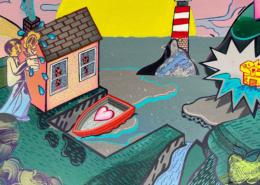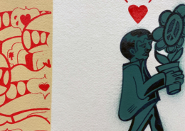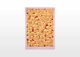For his first exhibition at Kolly Gallery he created a new series entitled Sanctuaries of landscapes, that combine his different signs and symbols. At the center of the attention is his iconic yellow and red-outlined symbol of the ‚Temple‘, indeed one of his most famous sanctuary. It is believed that Sickboy was indeed the first artist in the UK using a logo rather than the ‚Tag‘. Sickboy’s signature symbol, features a broken Temple that has been reassembled to form a heart shape. It represents the a tribute to that merry, mesmeric little house of worship which has become synonymous with his work and his message of hope, unity, and positivity.
