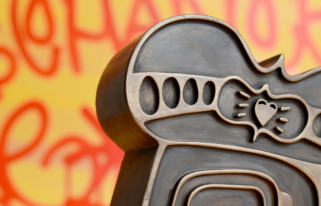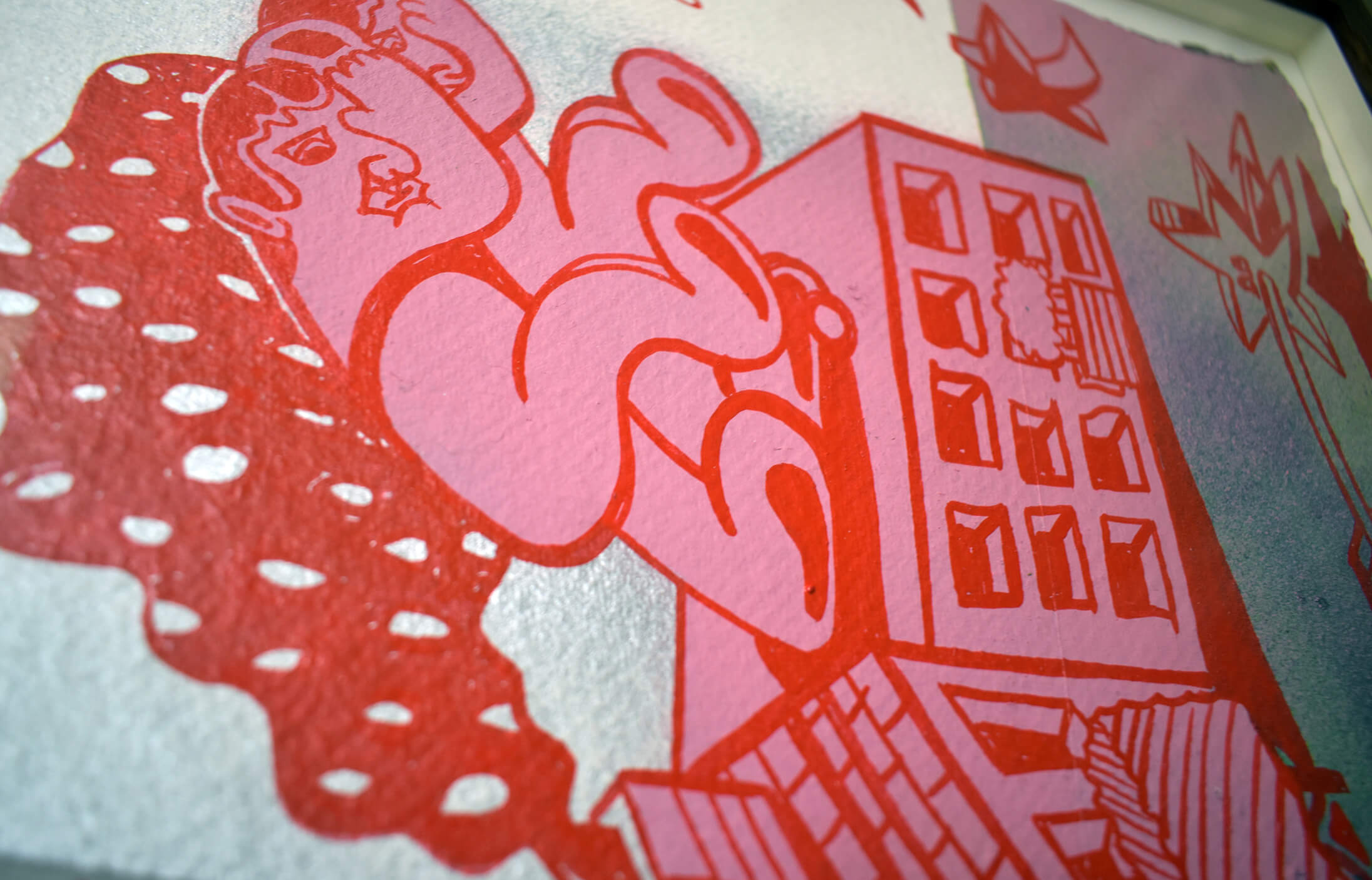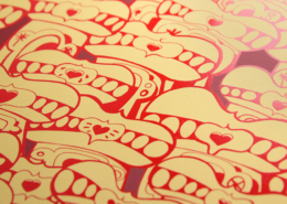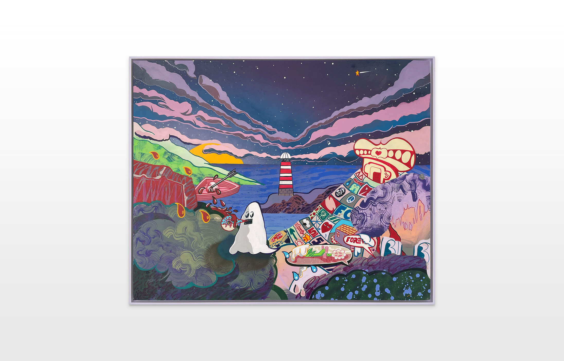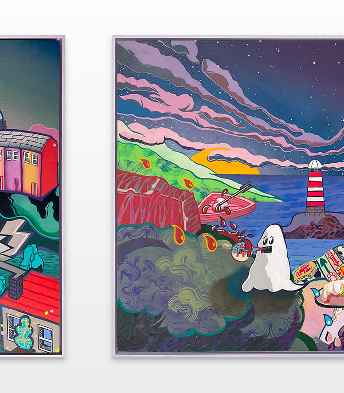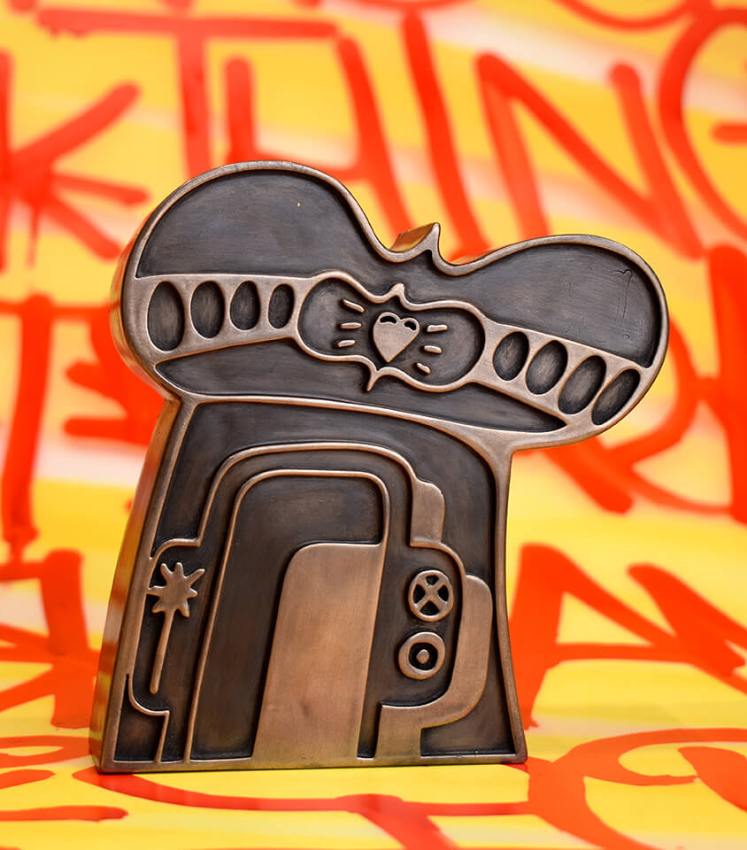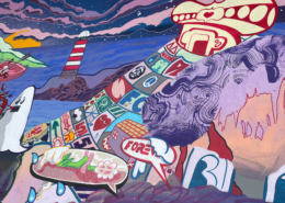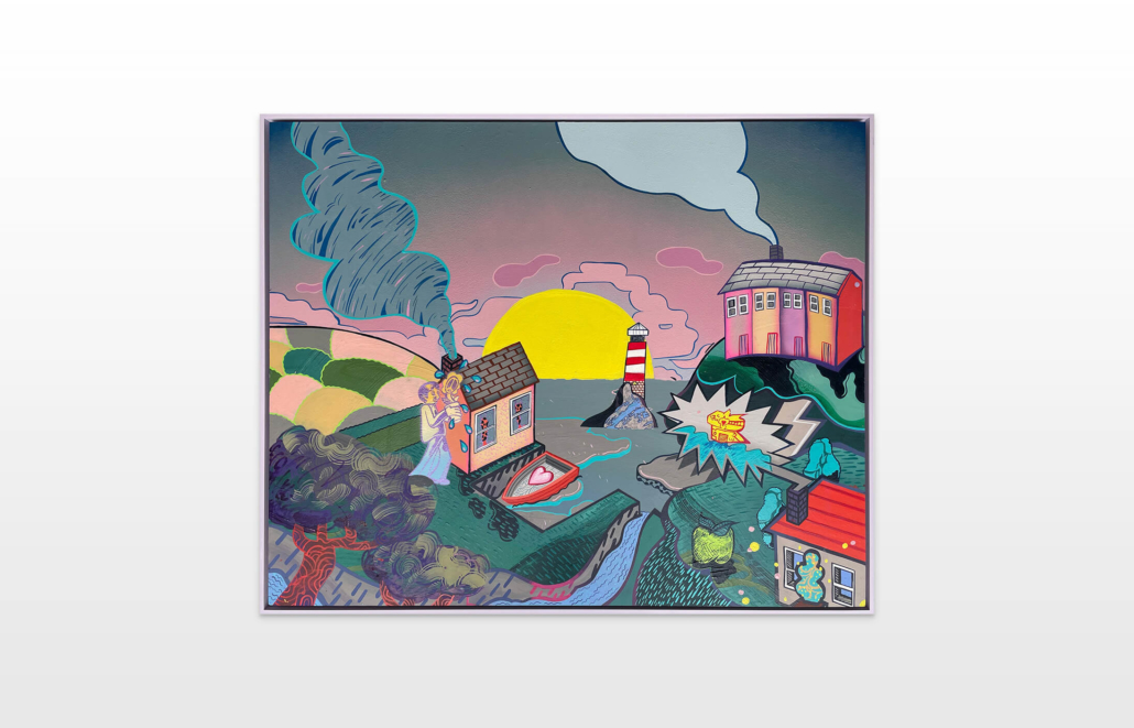For his first exhibition at Kolly Gallery he created a new series entitled Sanctuaries of landscapes, that combine his different signs and symbols. At the center of the attention is his iconic yellow and red-outlined symbol of the ‚Temple‘, indeed one of his most famous sanctuary. It is believed that Sickboy was indeed the first artist in the UK using a logo rather than the ‚Tag‘. Sickboy’s signature symbol, features a broken Temple that has been reassembled to form a heart shape. It represents the a tribute to that merry, mesmeric little house of worship which has become synonymous with his work and his message of hope, unity, and positivity.