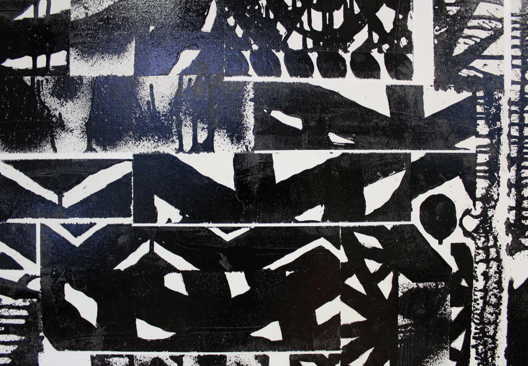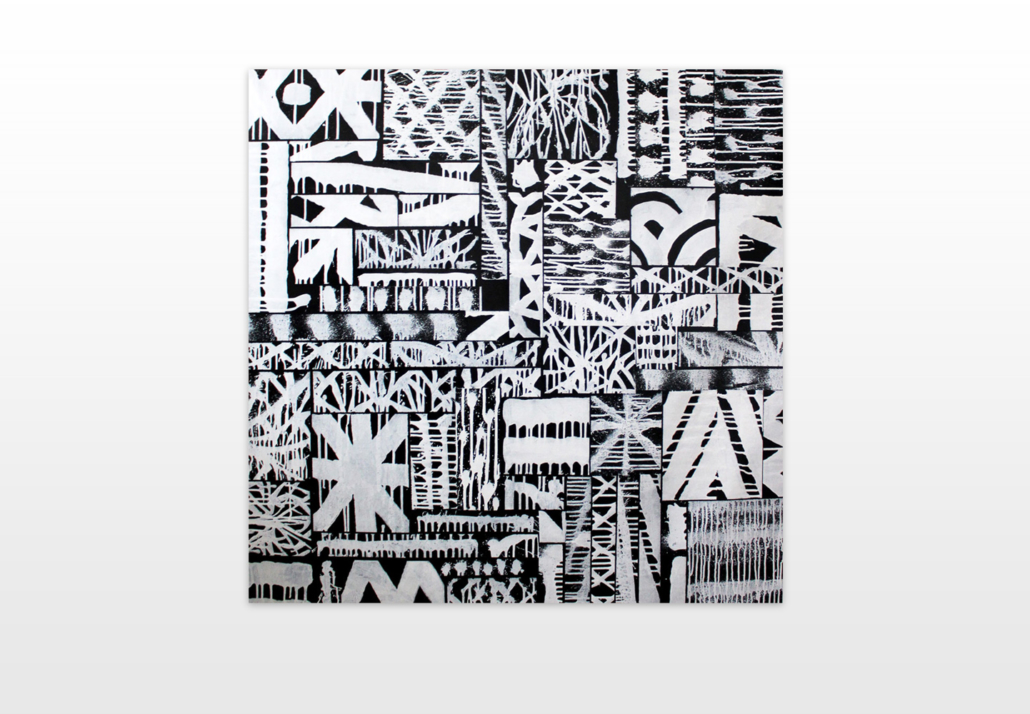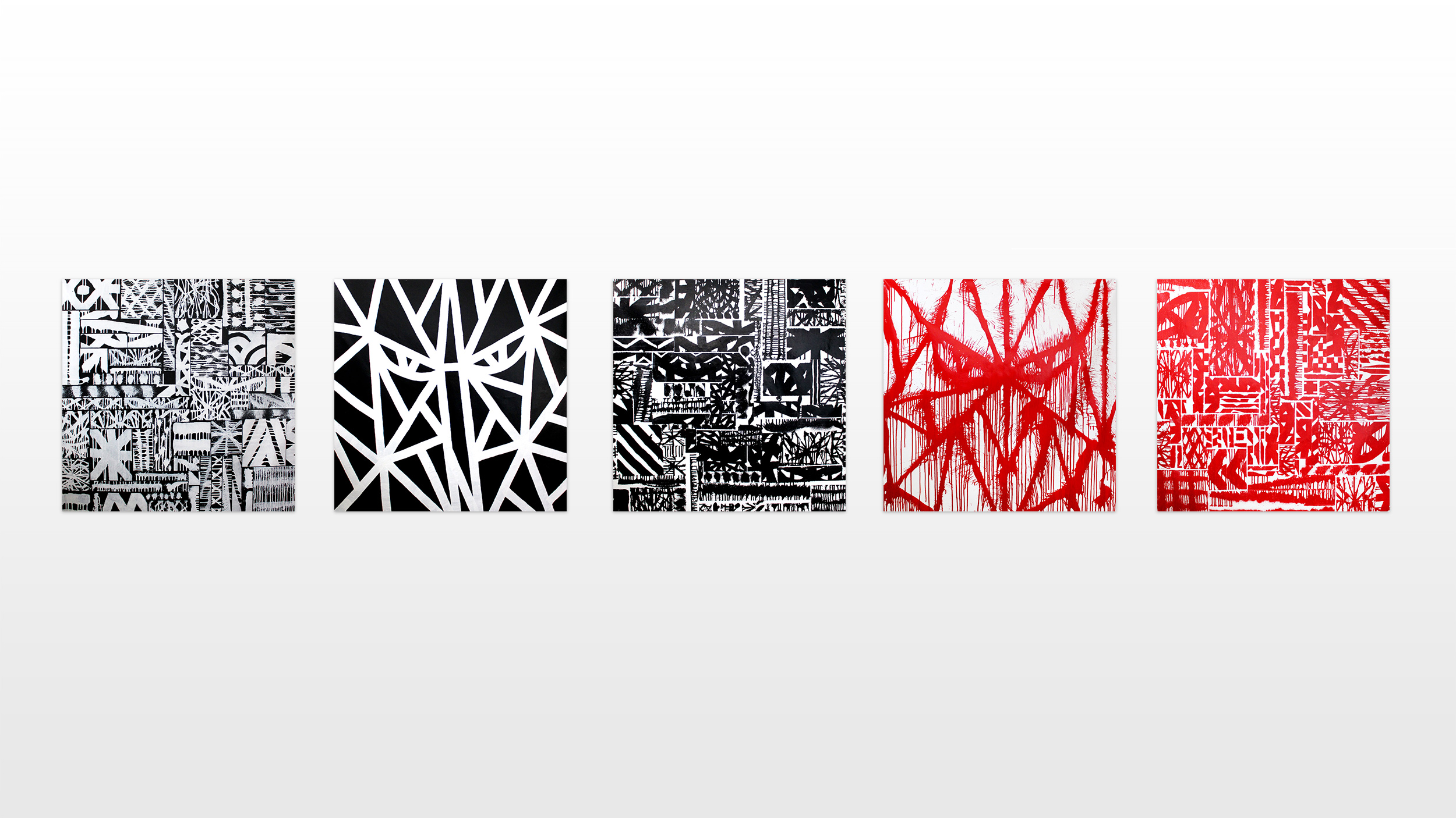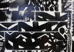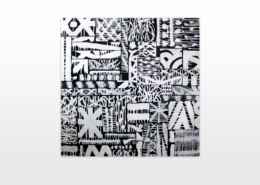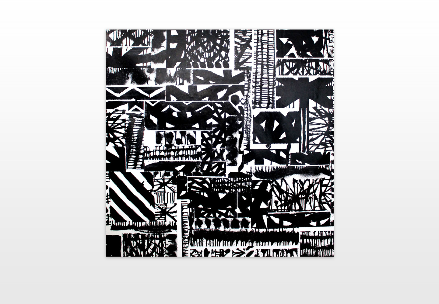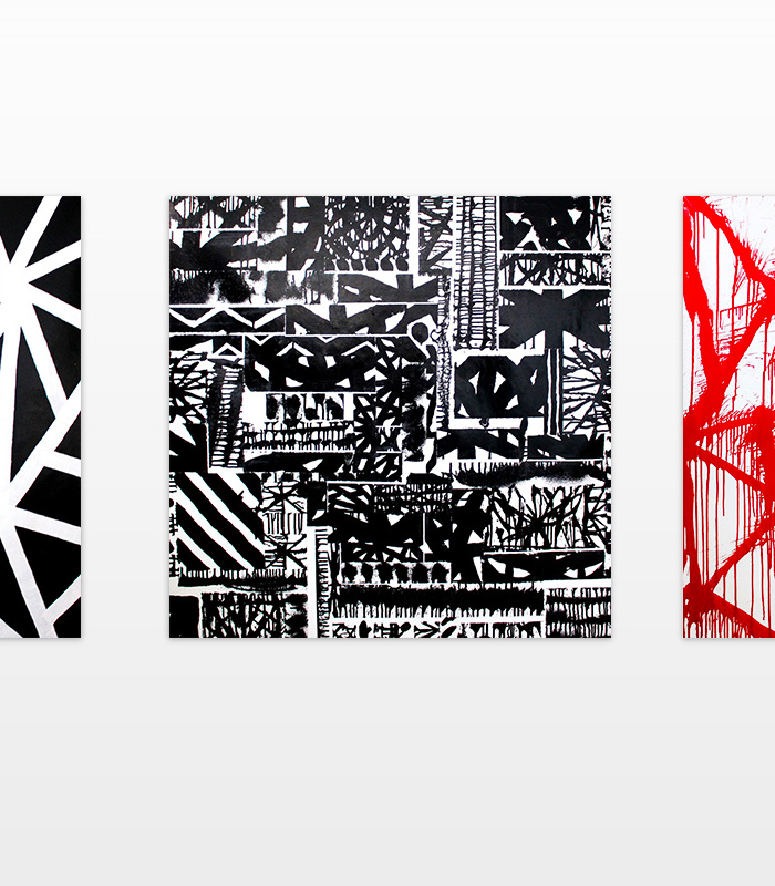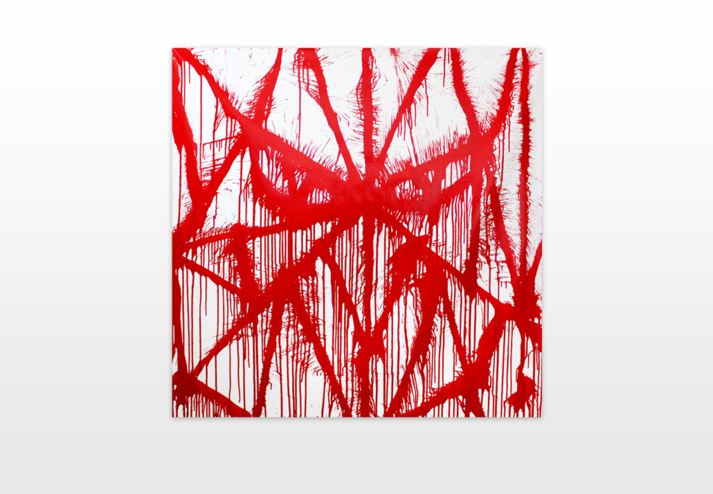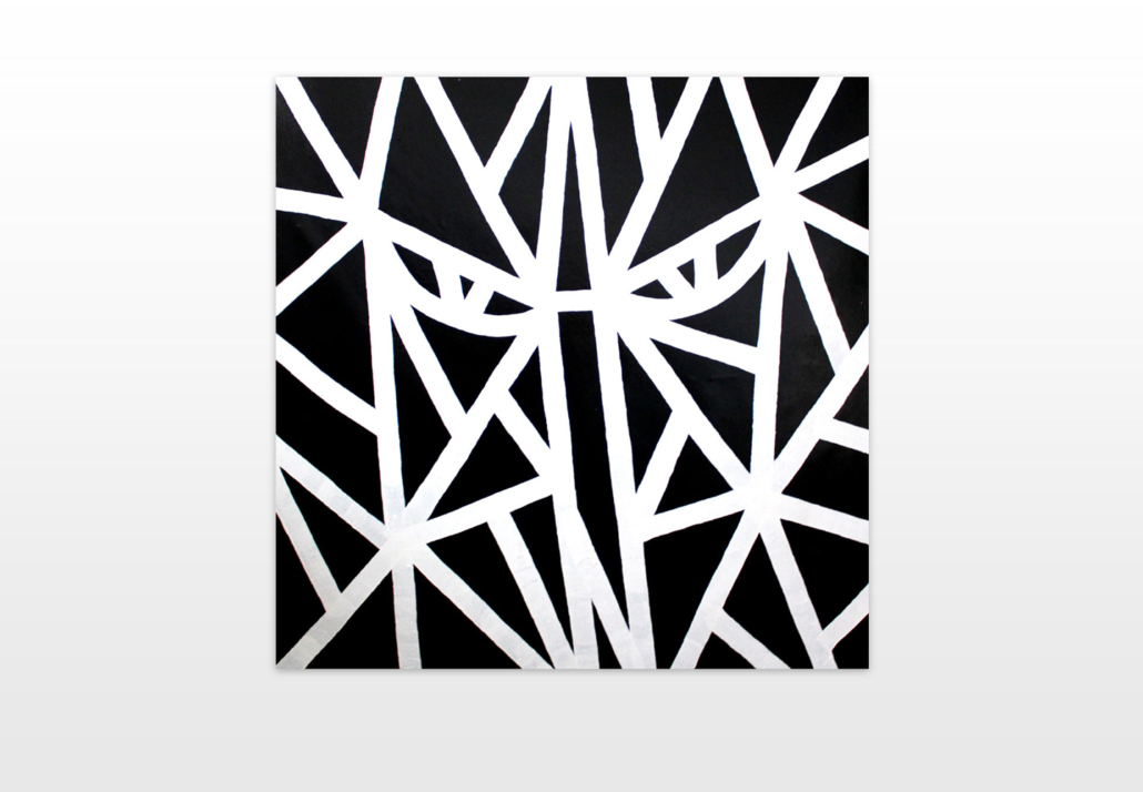Translating this concept on a visual level this results in an expressive net of lines. Once it is composed by a straight and clean line, once its scruffy drips and sometimes its wild color splashes. But the lines always remain monochrome. As unique as the various line textures, are the working materials of the artist, such as ink, brush and watering sprayers. The paintings contain different patterns of net fragments and line textures that come together to form an abstract ensemble. These abstract ensembles represent the past emotions and experiences that have been layered and stored in the body. Last but not least, the bold omnipresent character – the giant staring monster – is represented in different variations.
