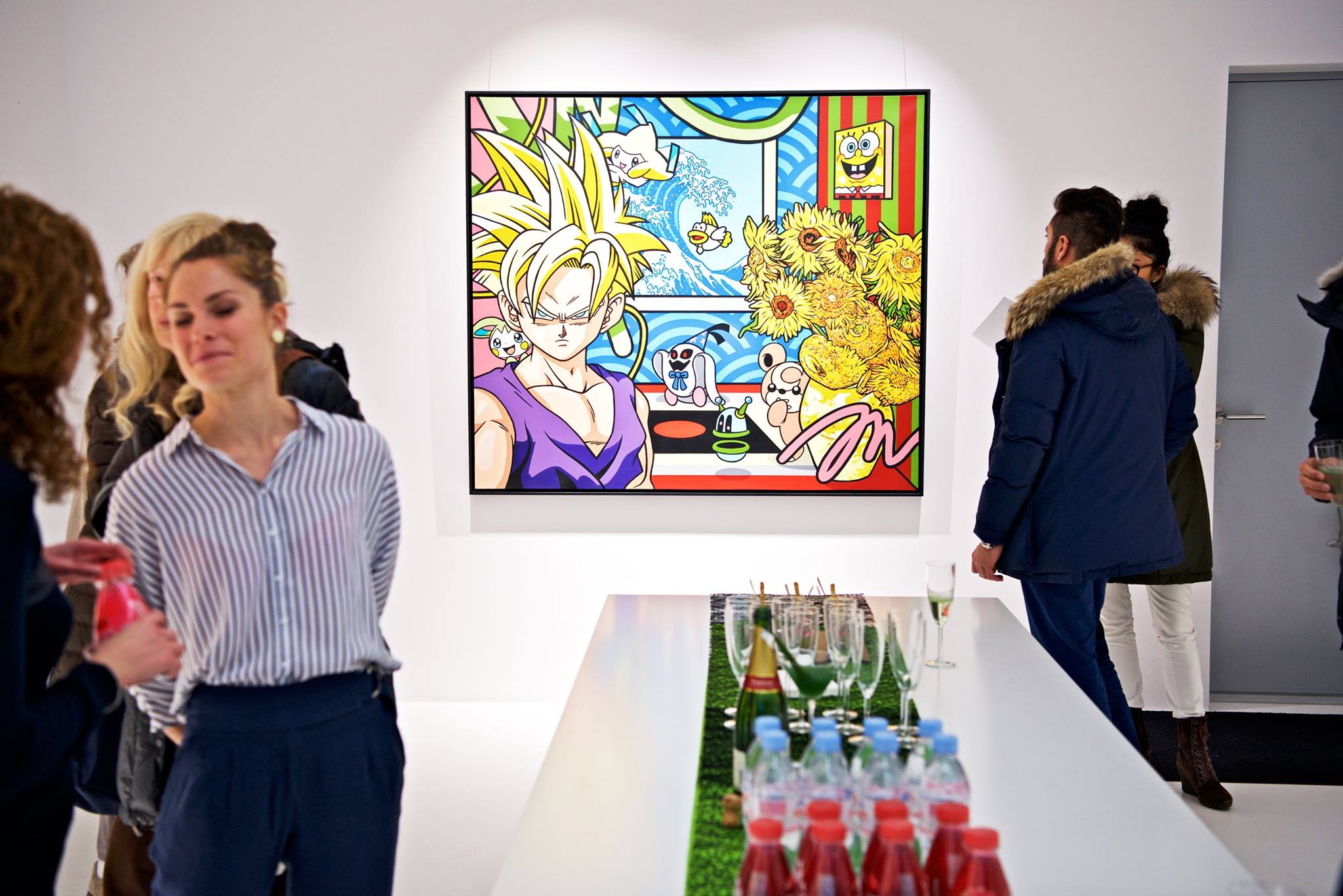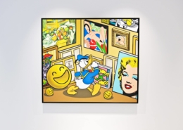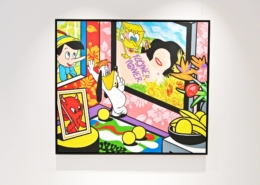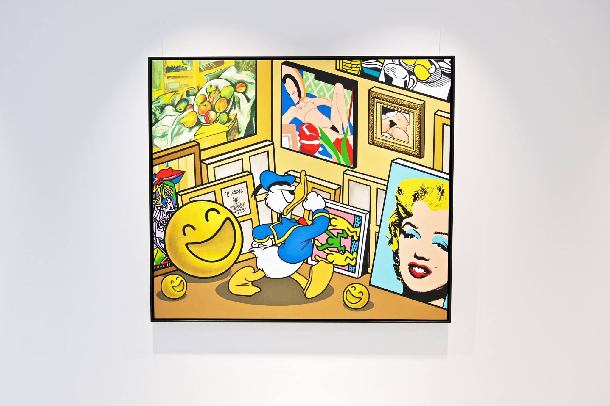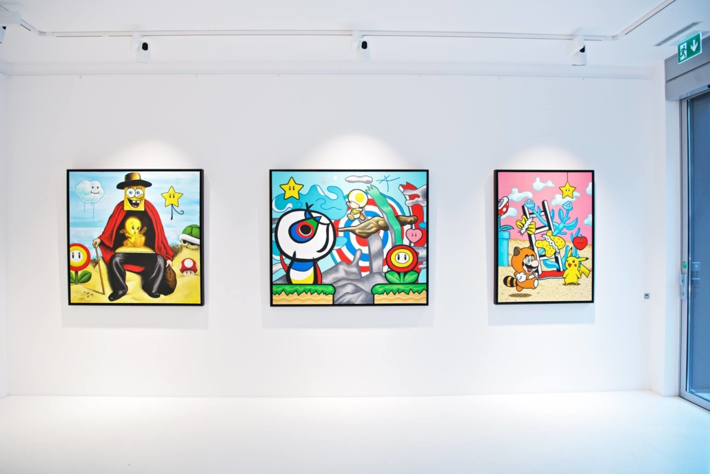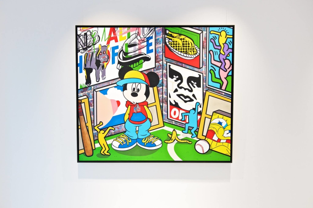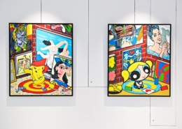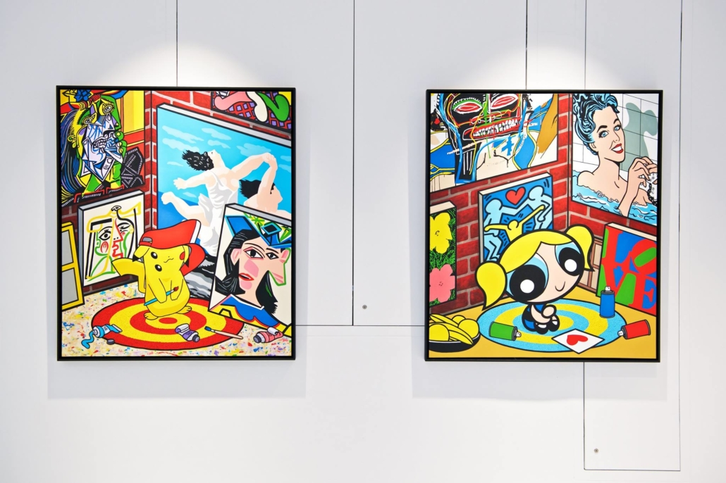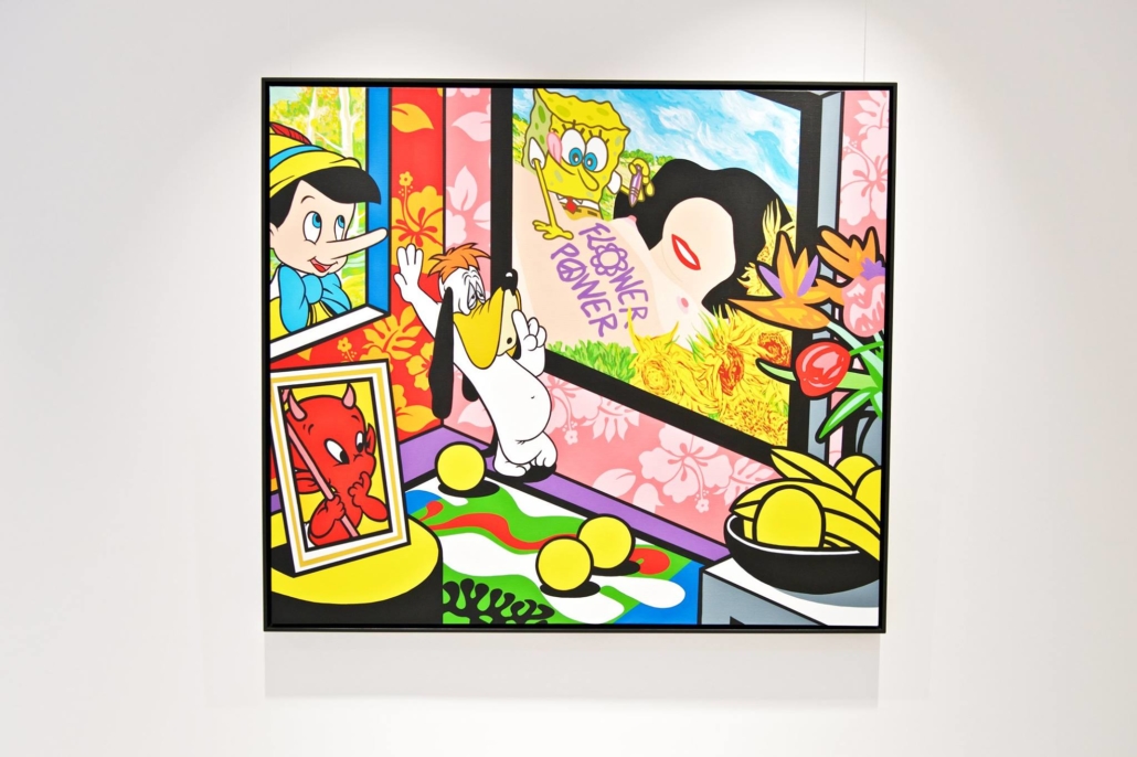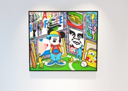 Clashing emblematic images resembling visual citations of different historical eras are arranged in a unusual yet well composed setting. Famous art works from Pop Art, Classical Modernism as well as Comic Characters are juxtaposed. In the exhibited paintings the observer sees Tom Wesselmann’s nudes, Von Gogh’s sunflowers or Keith Haring figures staging with Japan comic hero Son Goku, Disneys popular Micky Mouse or Pokémon’s Pikachu. Under the rather generic title of the exhibition Speedy Graphito actually wants to express his feelings towards globalization and history of art.