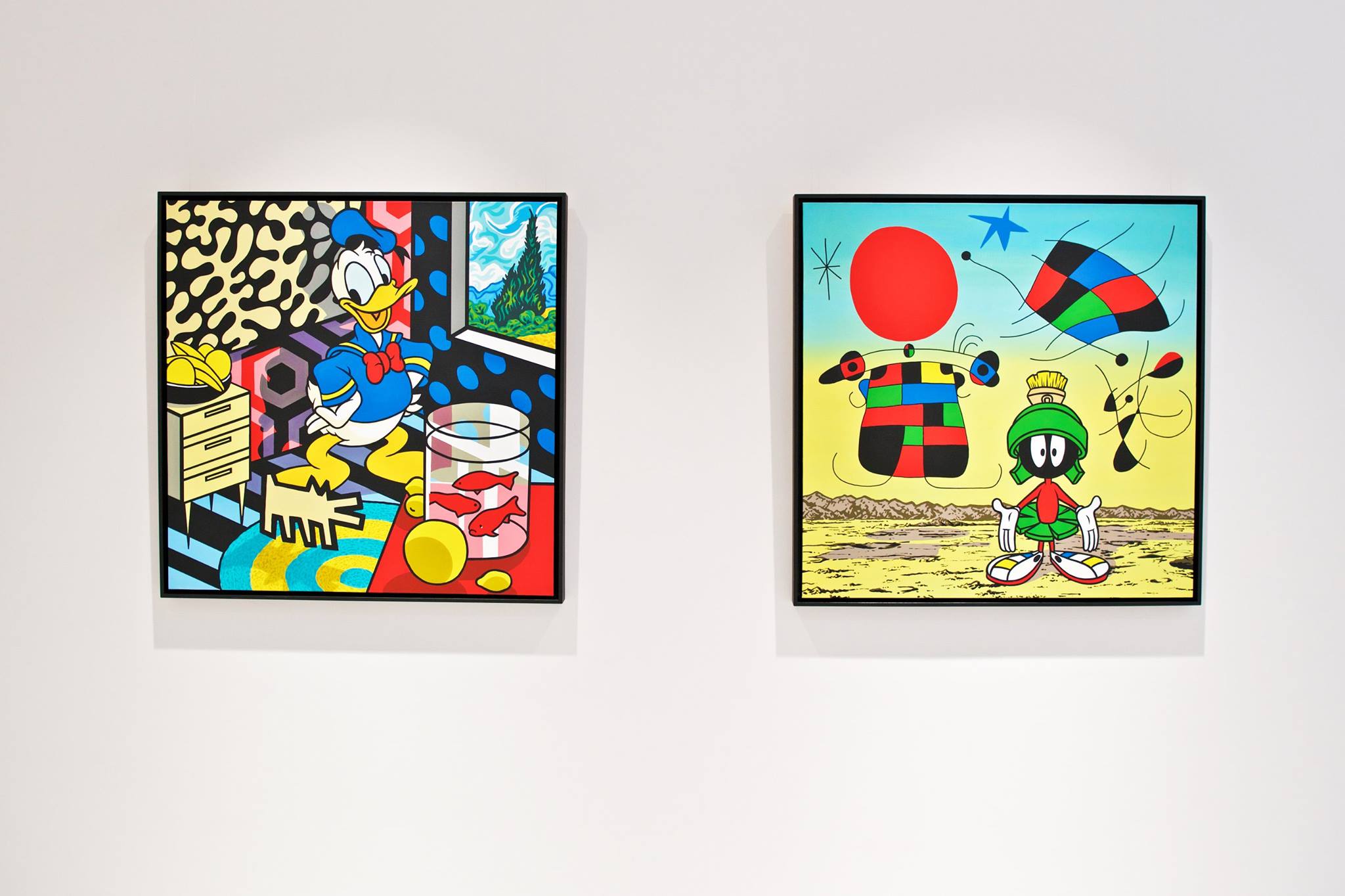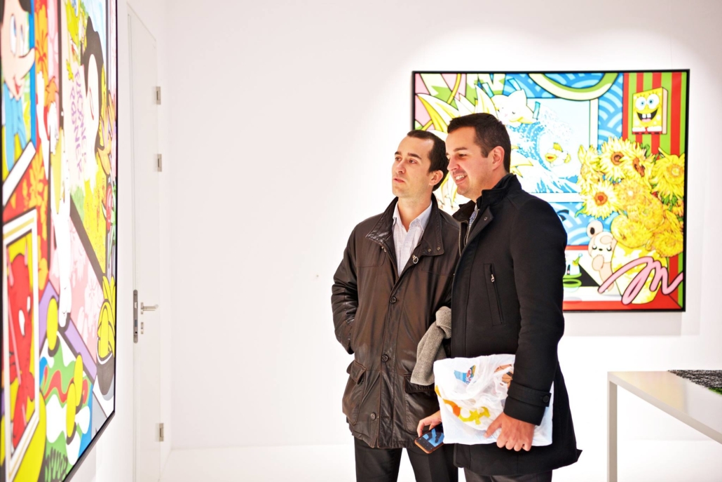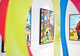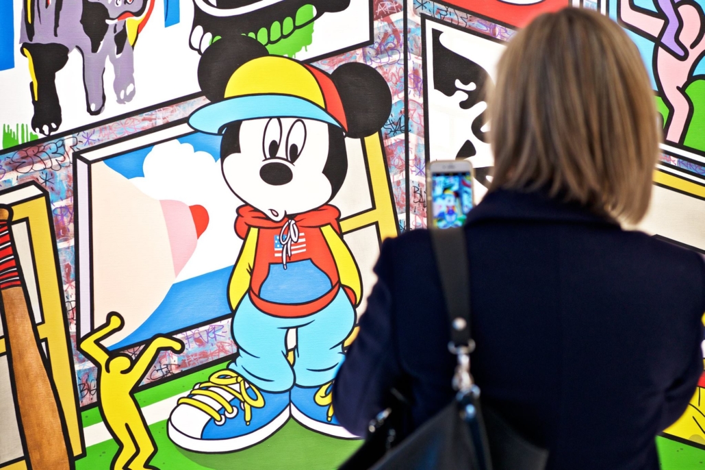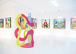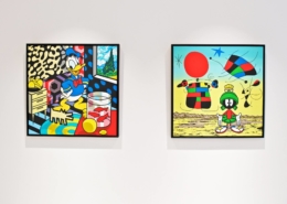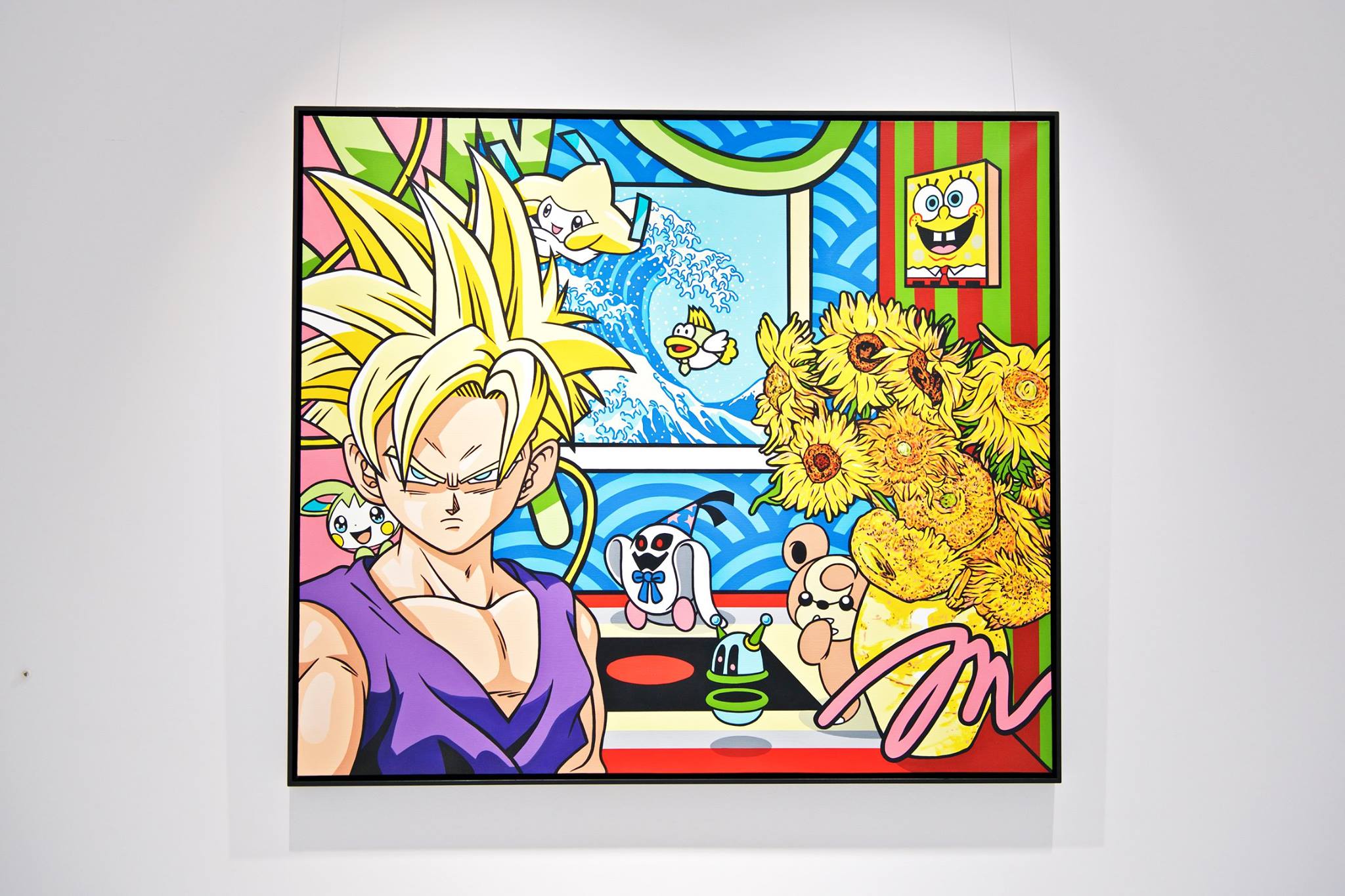 Clashing emblematic images resembling visual citations of different historical eras are arranged in a unusual yet well composed setting. Famous art works from Pop Art, Classical Modernism as well as Comic Characters are juxtaposed. In the exhibited paintings the observer sees Tom Wesselmann’s nudes, Von Gogh’s sunflowers or Keith Haring figures staging with Japan comic hero Son Goku, Disneys popular Micky Mouse or Pokémon’s Pikachu. Under the rather generic title of the exhibition Speedy Graphito actually wants to express his feelings towards globalization and history of art.