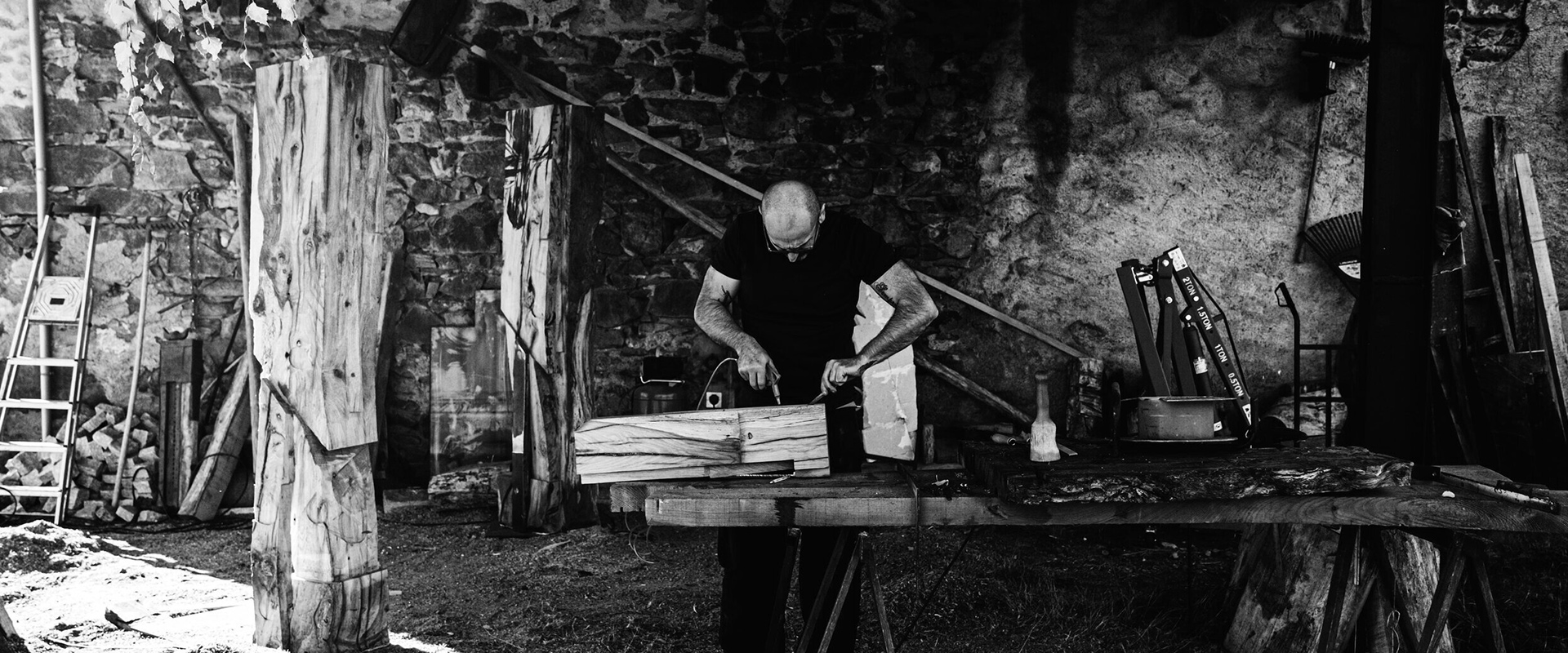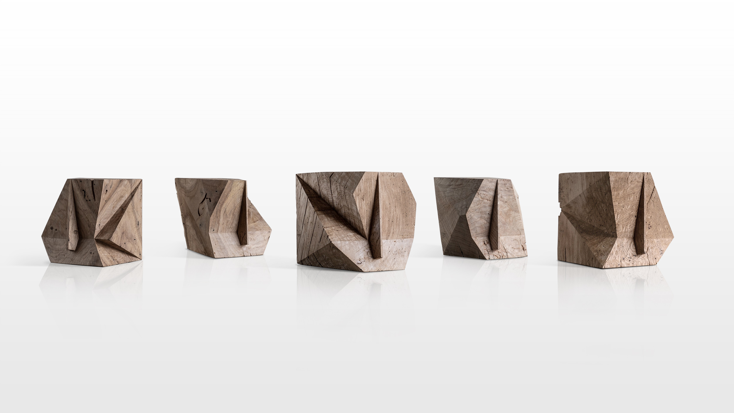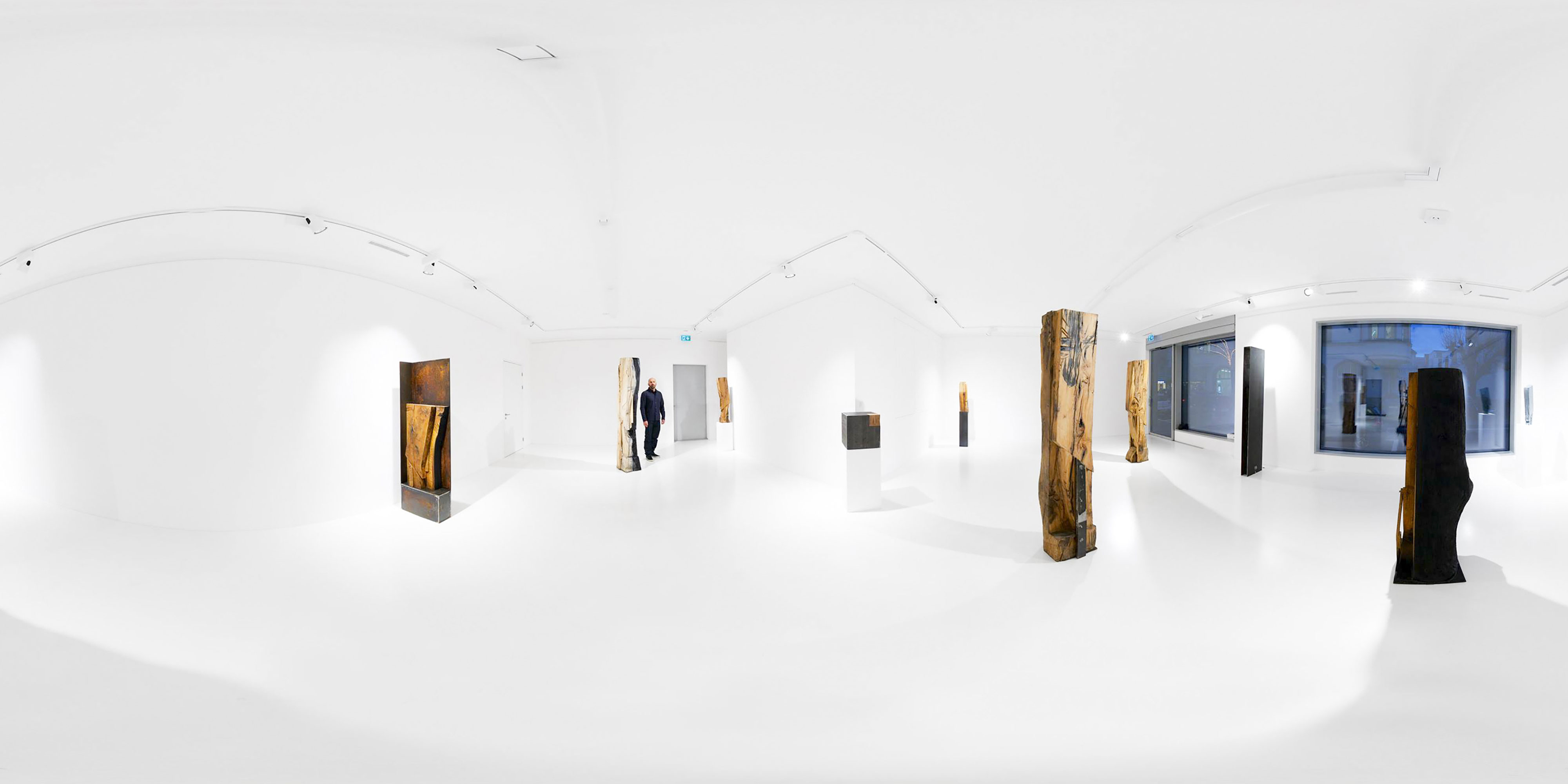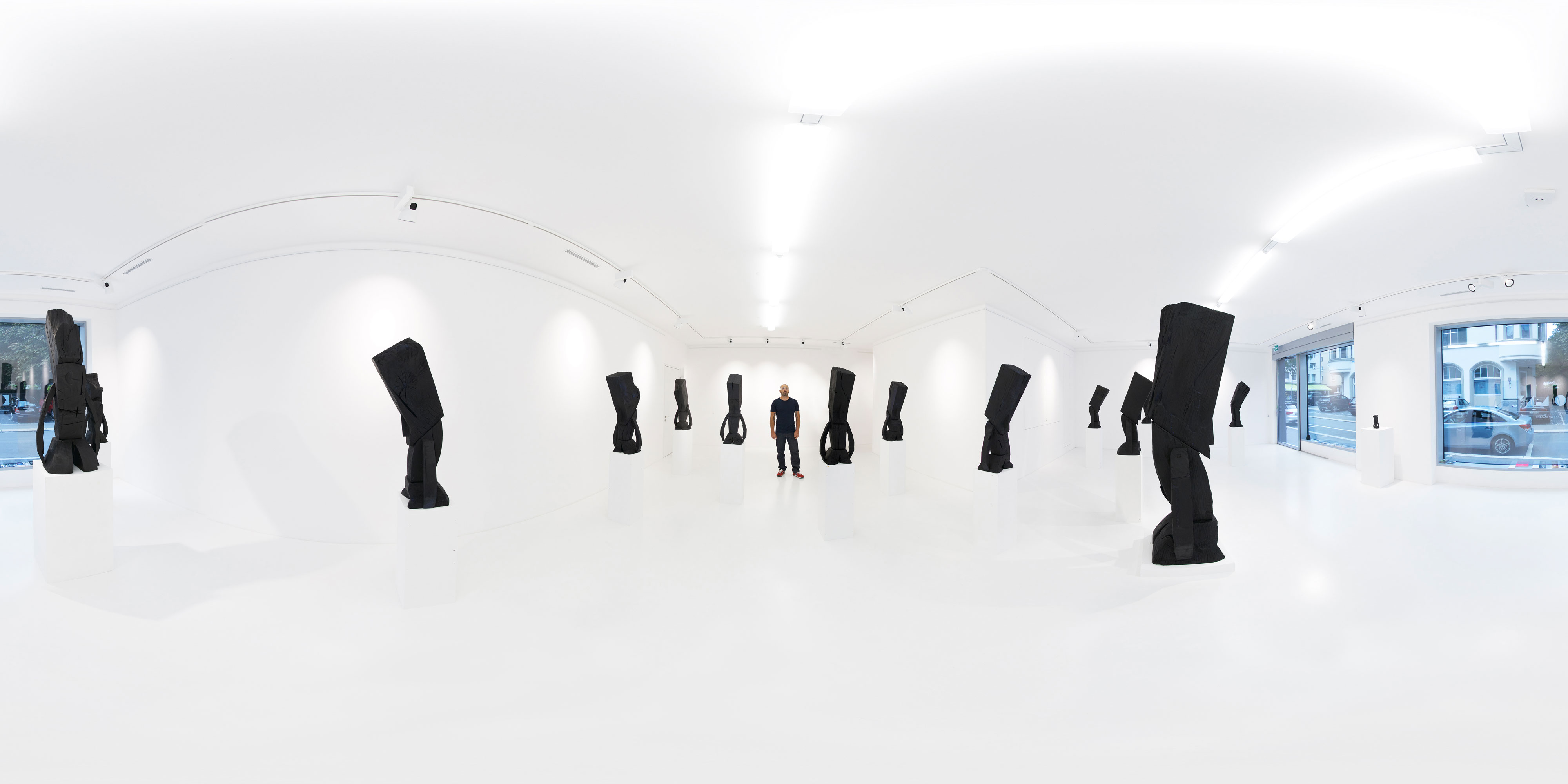 Beyond the graphic aspect of the clear-cut lines, its anchored posture, it is “Obsessive Reflex Analysis”. The research for the working drawing is the key; ARO is the genesis. ”This work comes from my weaknesses” he admits, a resonance of himself … delivering a symbolical allegory of his emotions. Thus was born ARO. The encounter between machine and nature gave birth to Wooden ARO. An unprecedented reinterpretation of the ARO character sculpted using a chainsaw and different woods, as if the artist released from the tree the already existing piece. This demanding raw material needs to be tamed with strength and delicacy. “An instinctive apprenticeship alone in the middle of the forest. By means of manipulation you discover, you draw, you cut… hard labour in paradise amongst hundred-year-old trees.” Each piece takes time to take shape, maturing slowly. A natural, almost sacred, creation, where the hand of man follows the lines of nature marked by time. A delicate lumberjack despite the hazardous tool creates a result that is heartbreakingly sensitive. Each piece is loaded with the emotions of its creator.